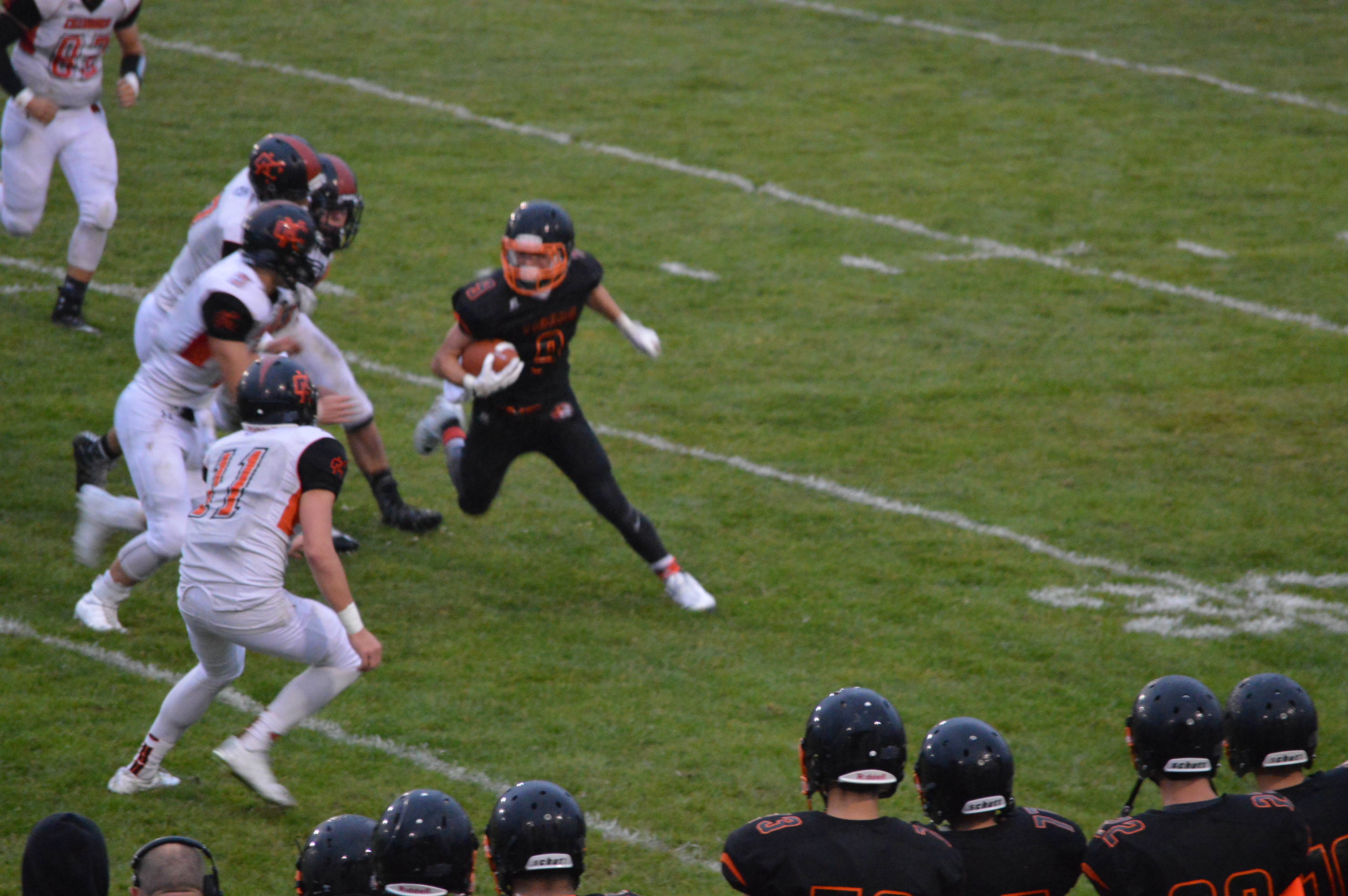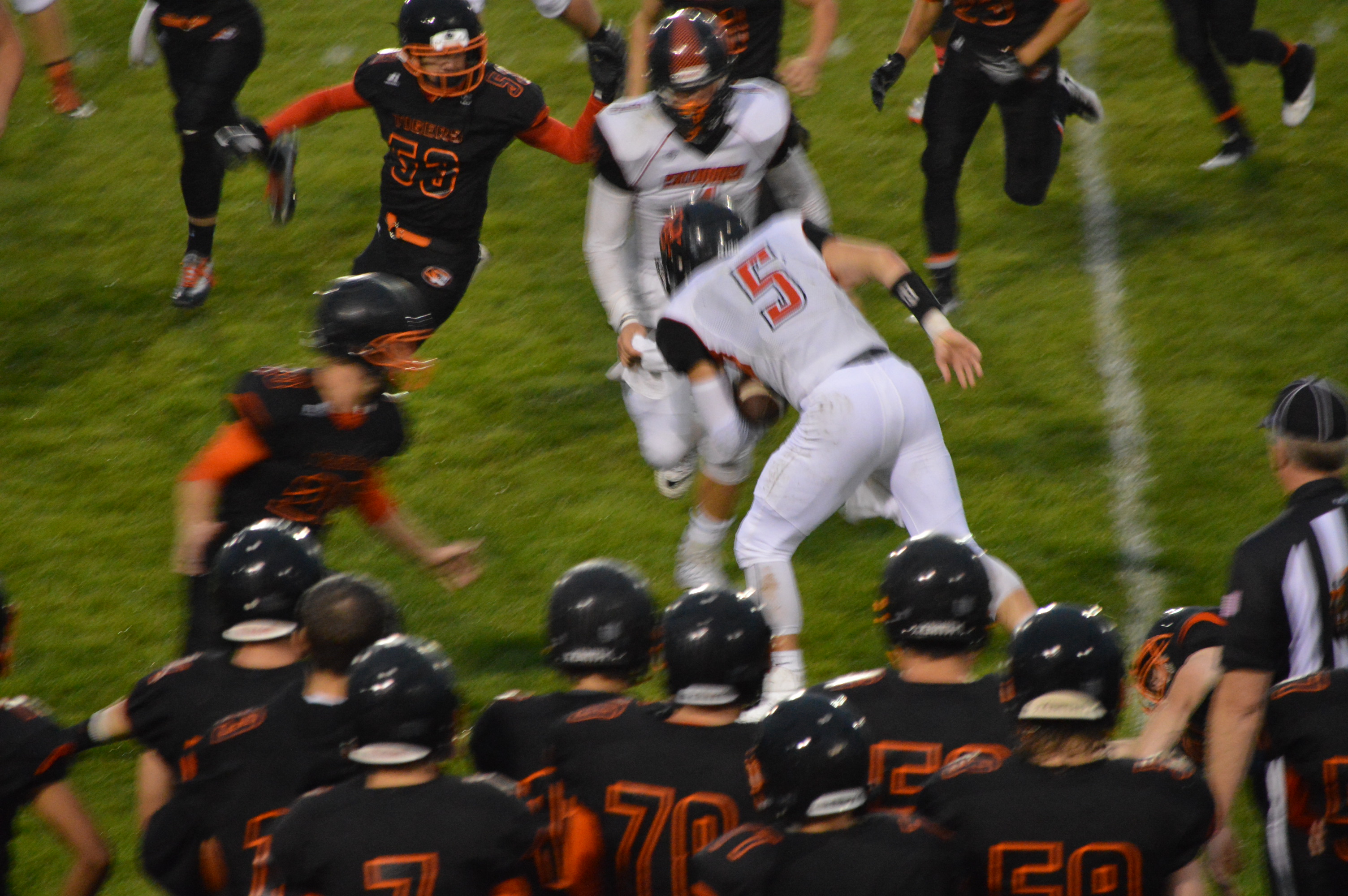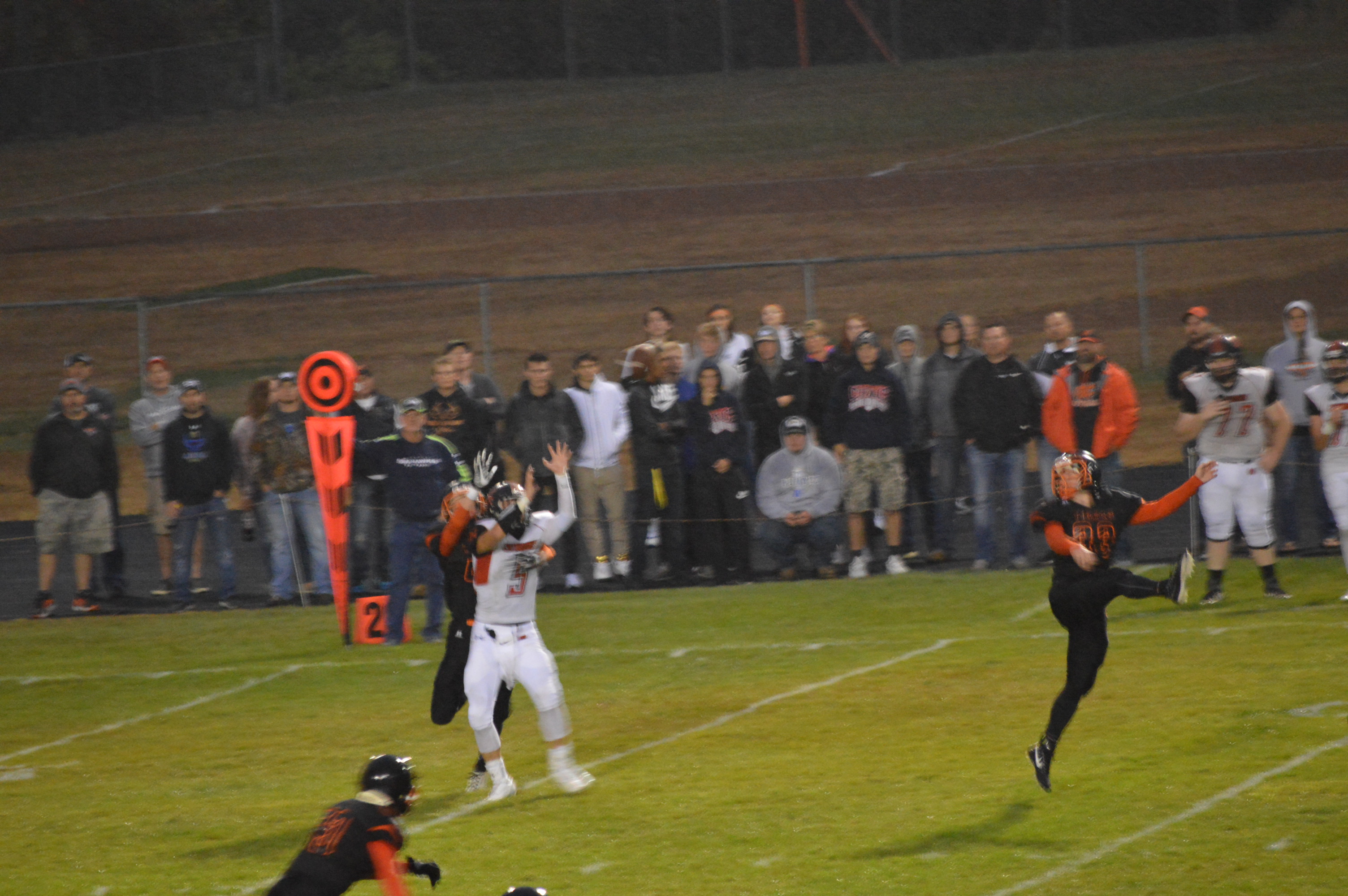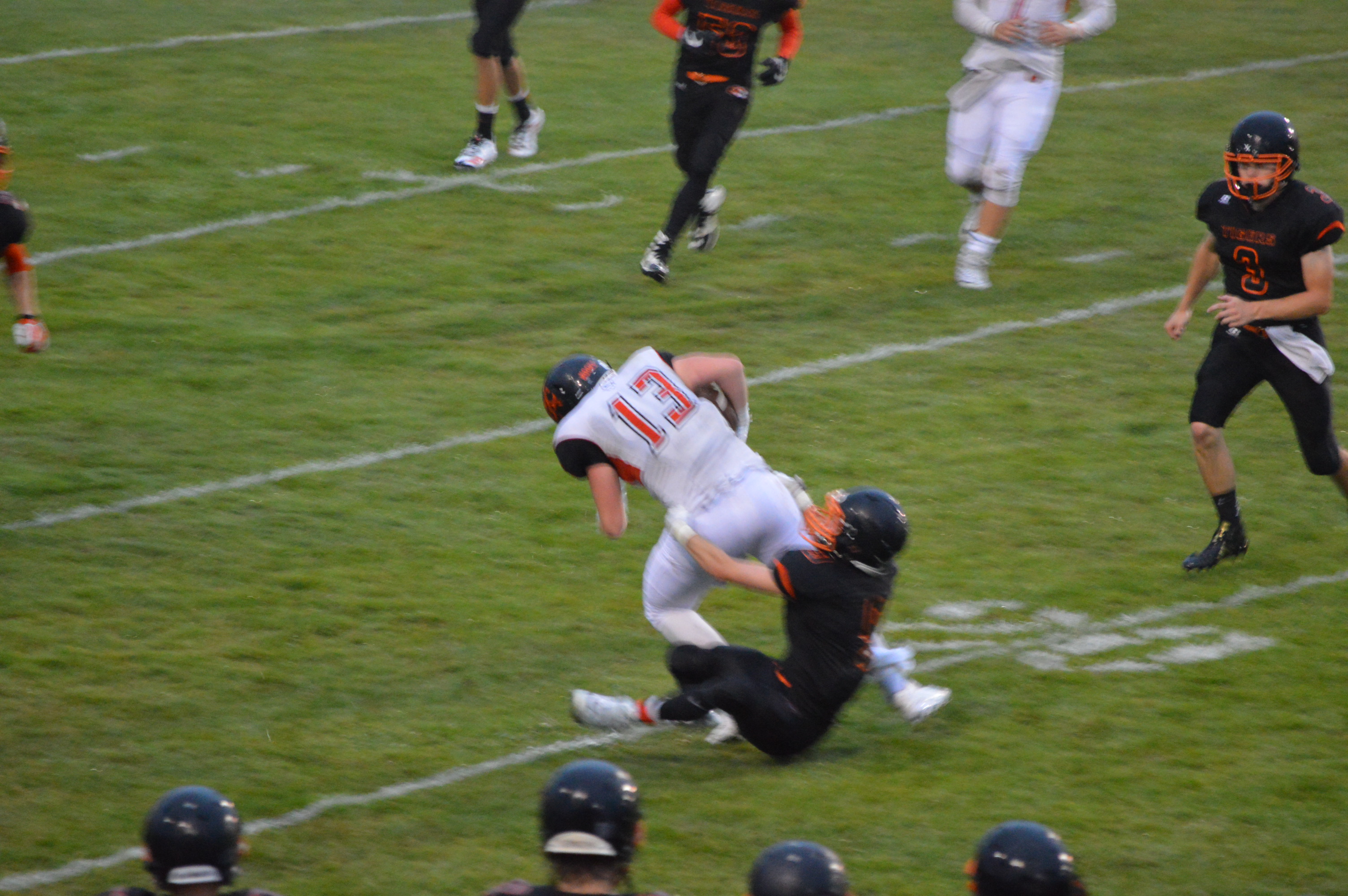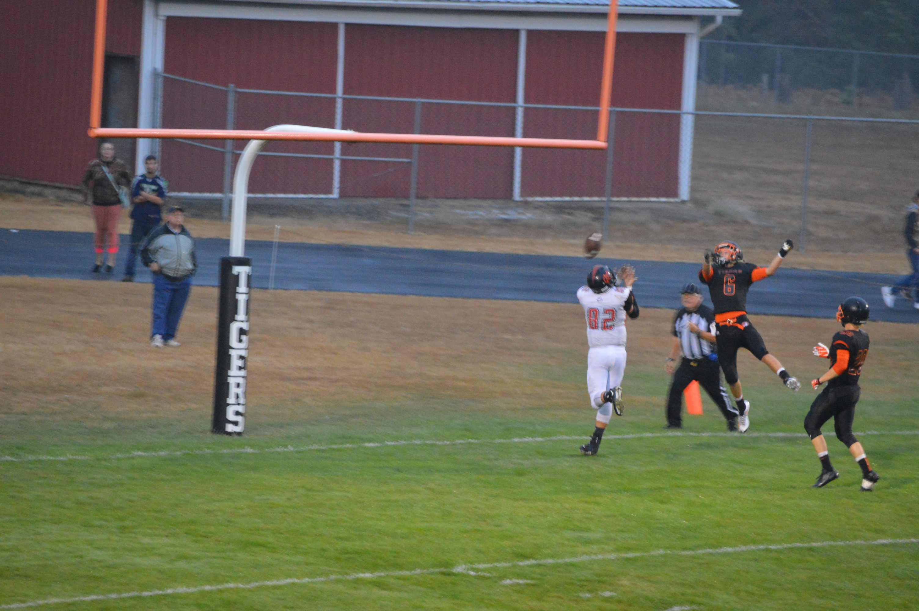 Despite not being able to add to their lead it looked like the Chinooks were about to finish off the Tigers and shut them out for the first time since 2011. The problem though with leading only 8-0 is it’s a one possession game and with less than 4 minutes to play Dyer stepped back trying to pick up a big 1st down so they could run the clock threw it over the middle when Jordan Purvis picked it off. Purvis returned it to his own 49 with 3:04 to play in the game and the Tigers were in business.