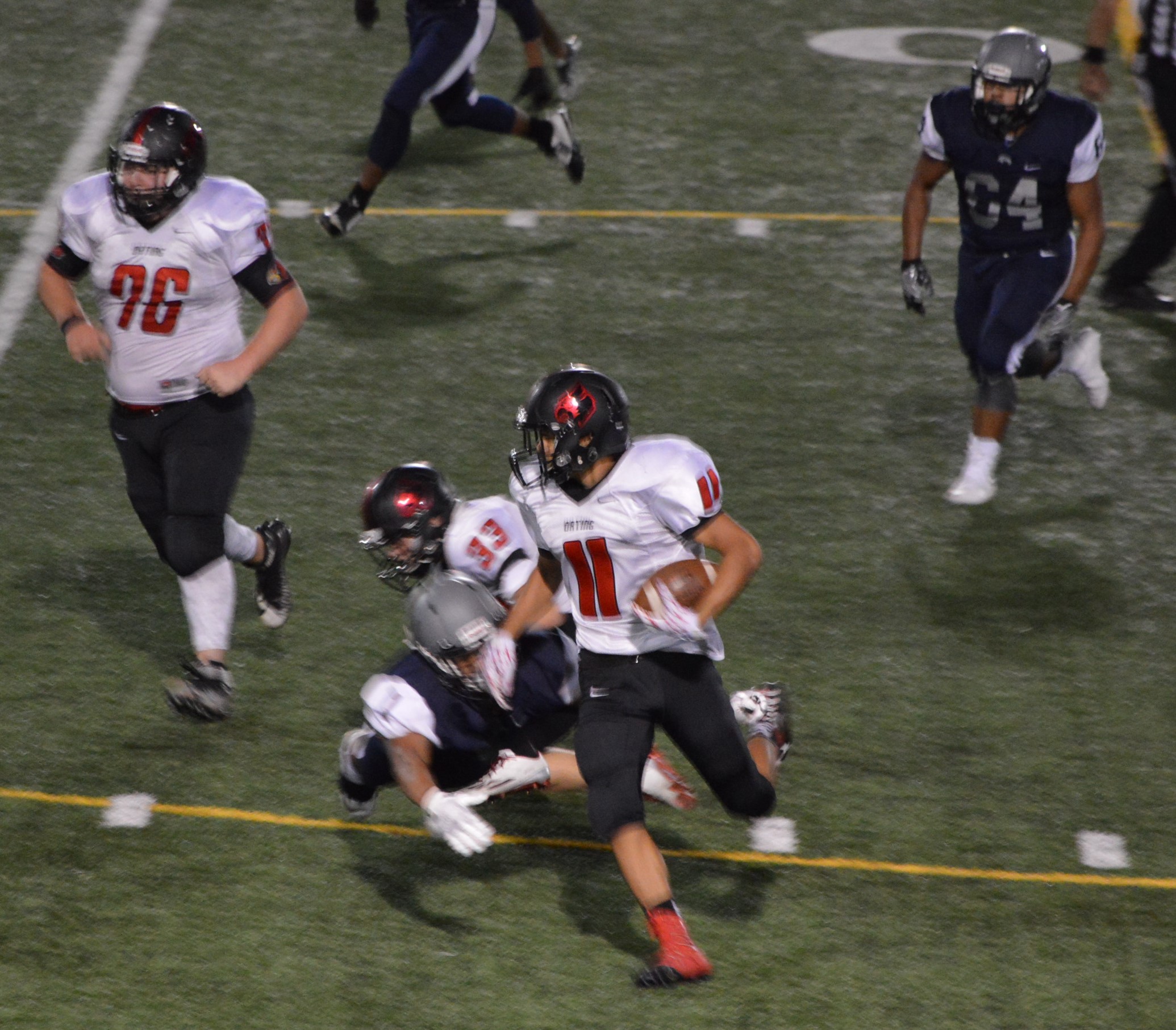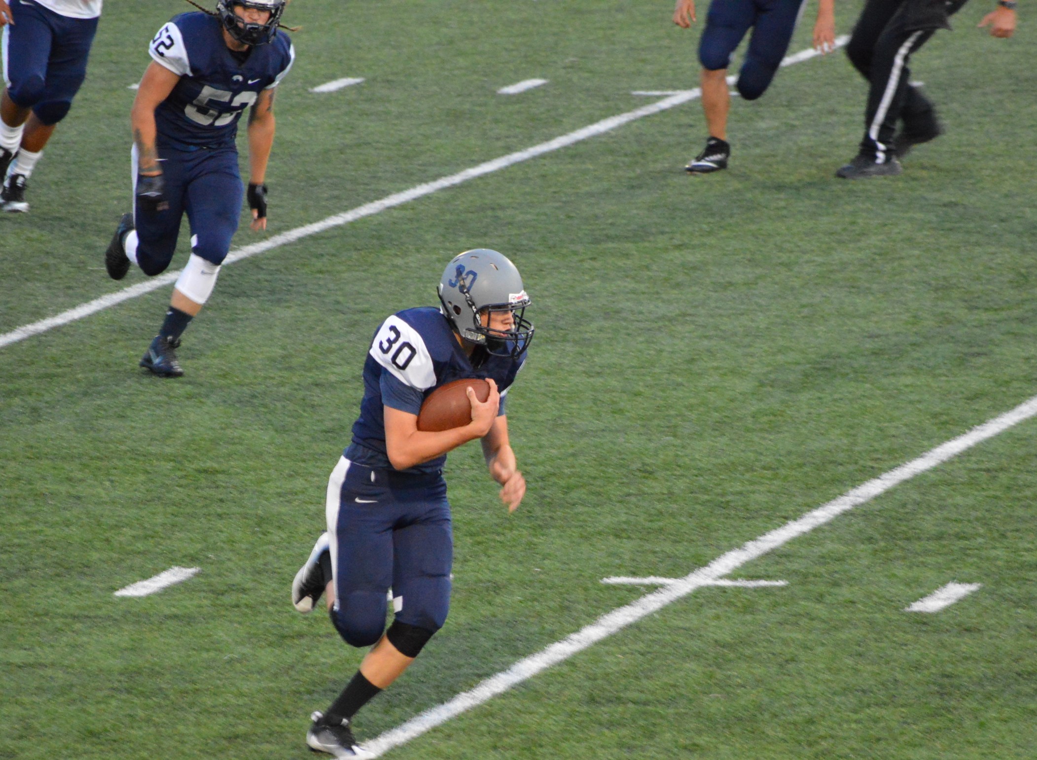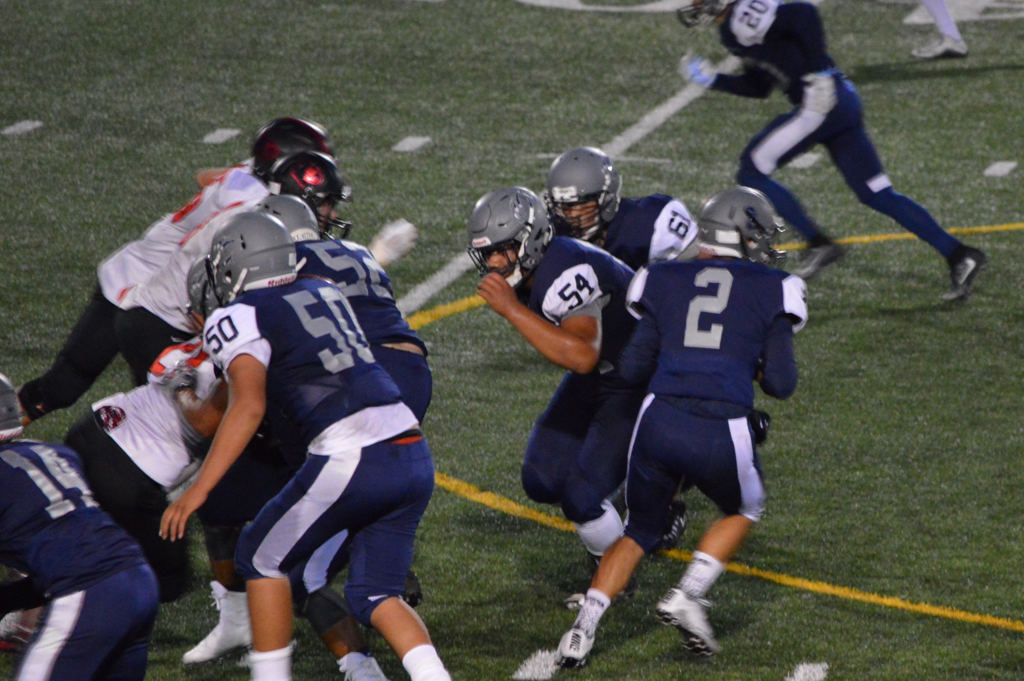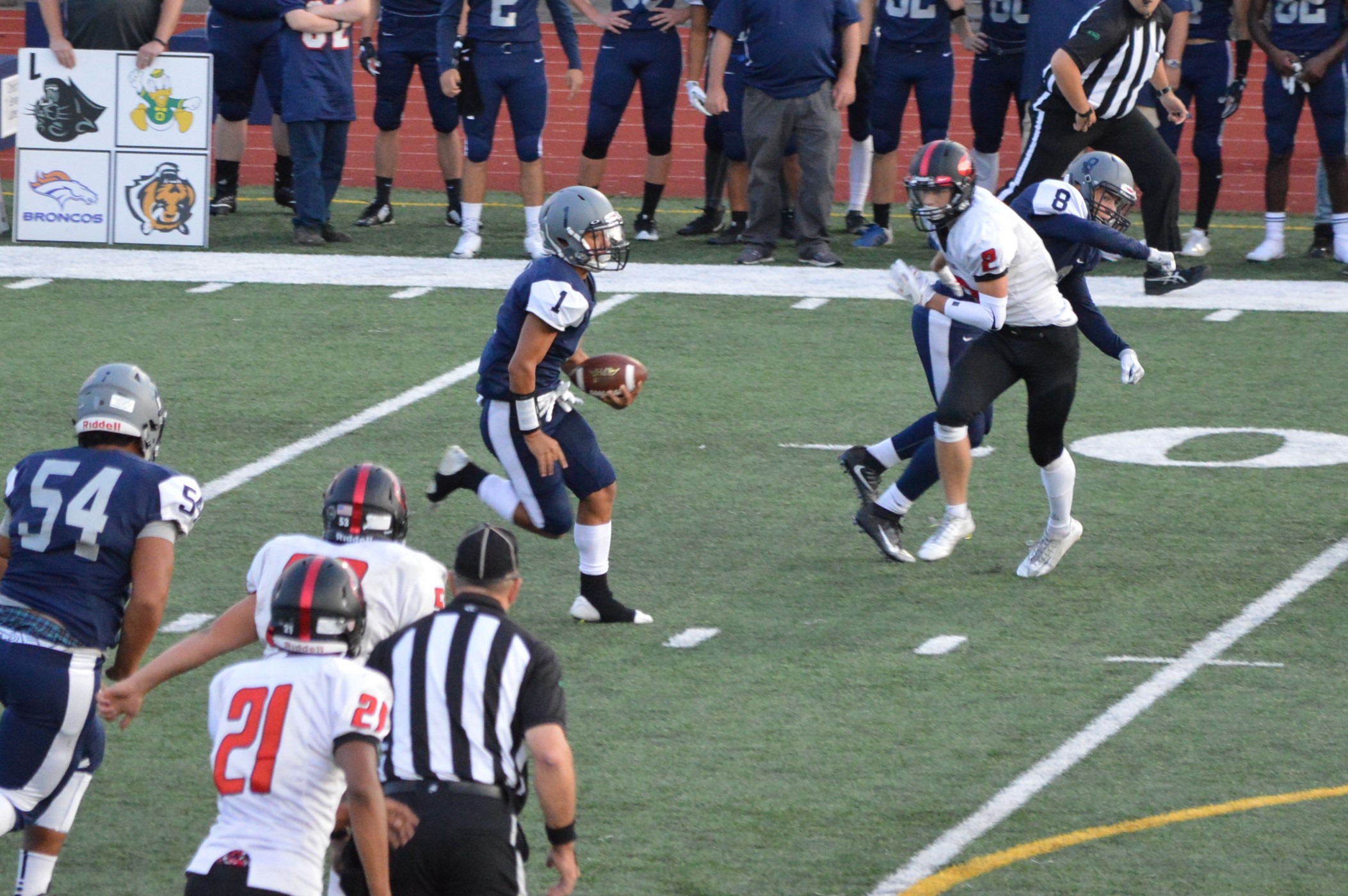They got things started on their 1st drive going 80 yards mostly on the ground with Brian Melloy finishing it off with an impressive 29-yard run. The offensive line created a huge gap for Melloy this play off tackle behind Herb Polu and Carlo Cook. Fullback Ryley Larson also provided a key block to spring Melloy. The PAT was also an adventure when Blake Anderson, the holder, couldn’t scoop up a low snap so he grabbed it and took off around the left end and in for the 2 point conversion for an 8-0 lead.