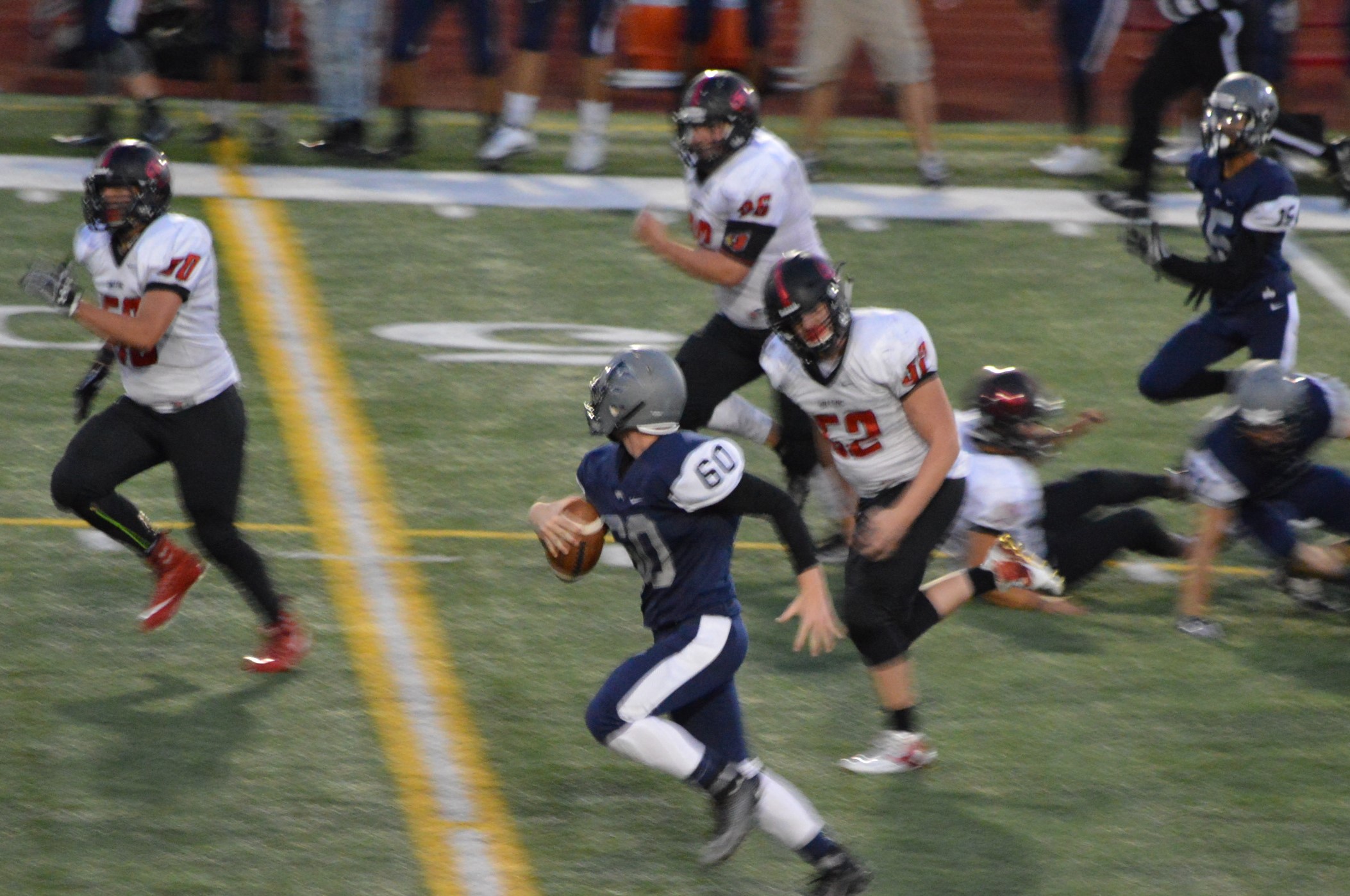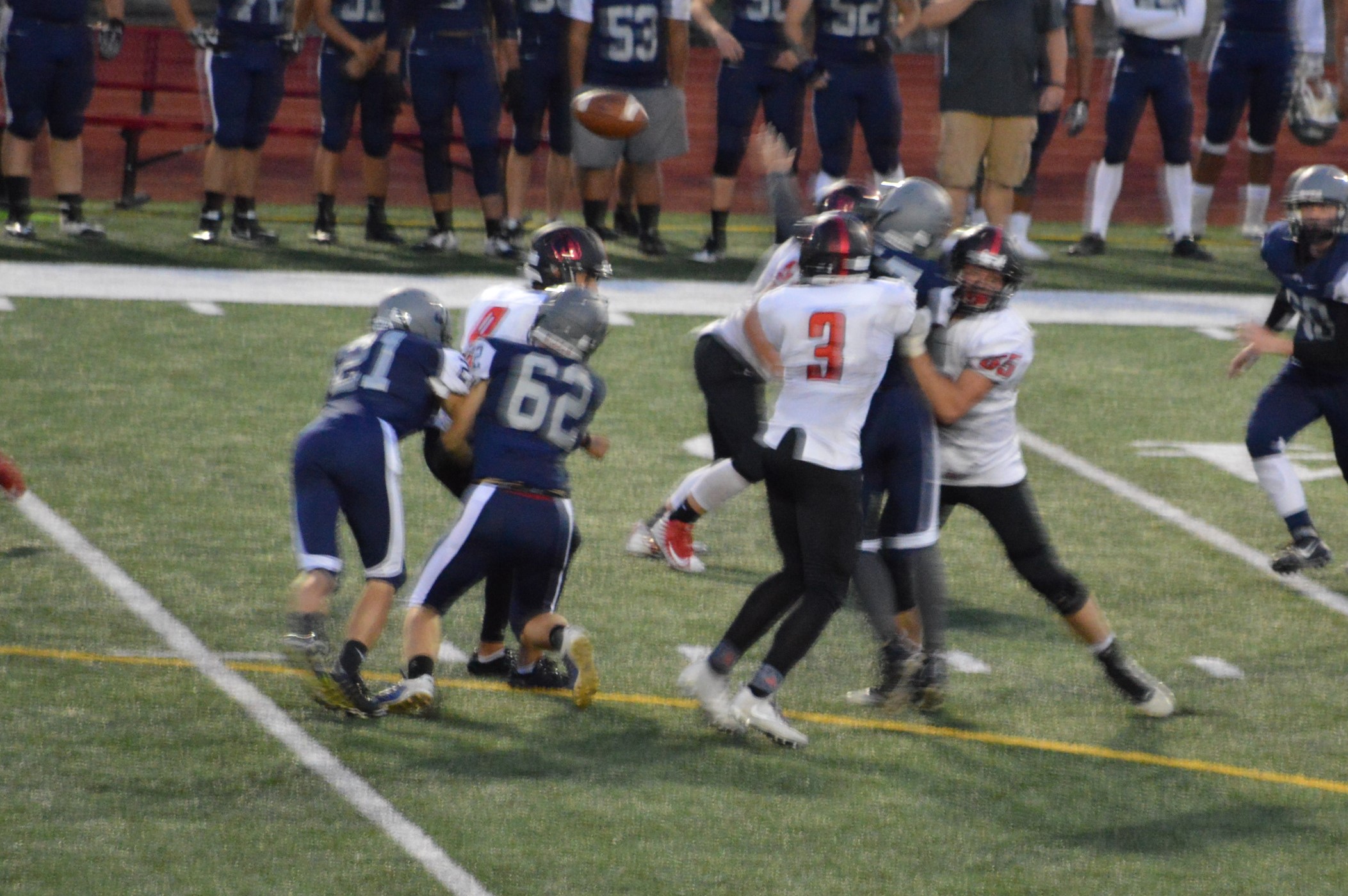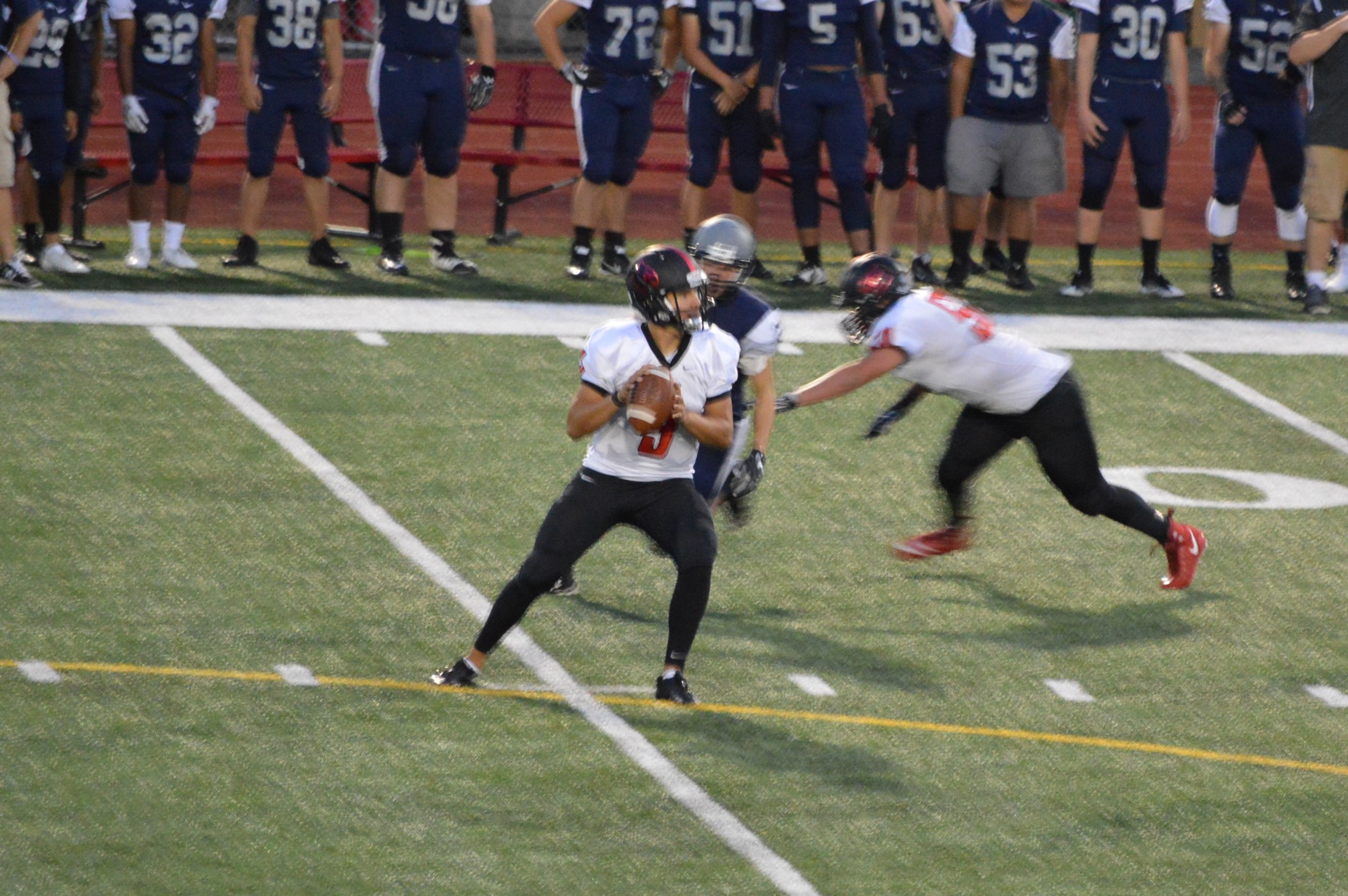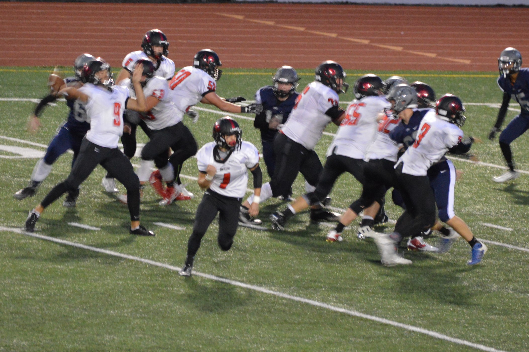 They got things started on their 1st drive going 80 yards mostly on the ground with Brian Melloy finishing it off with an impressive 29-yard run. The offensive line created a huge gap for Melloy this play off tackle behind Herb Polu and Carlo Cook. Fullback Ryley Larson also provided a key block to spring Melloy. The PAT was also an adventure when Blake Anderson, the holder, couldn’t scoop up a low snap so he grabbed it and took off around the left end and in for the 2 point conversion for an 8-0 lead.