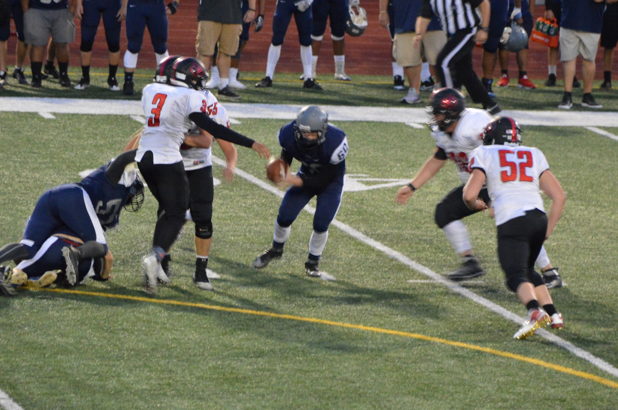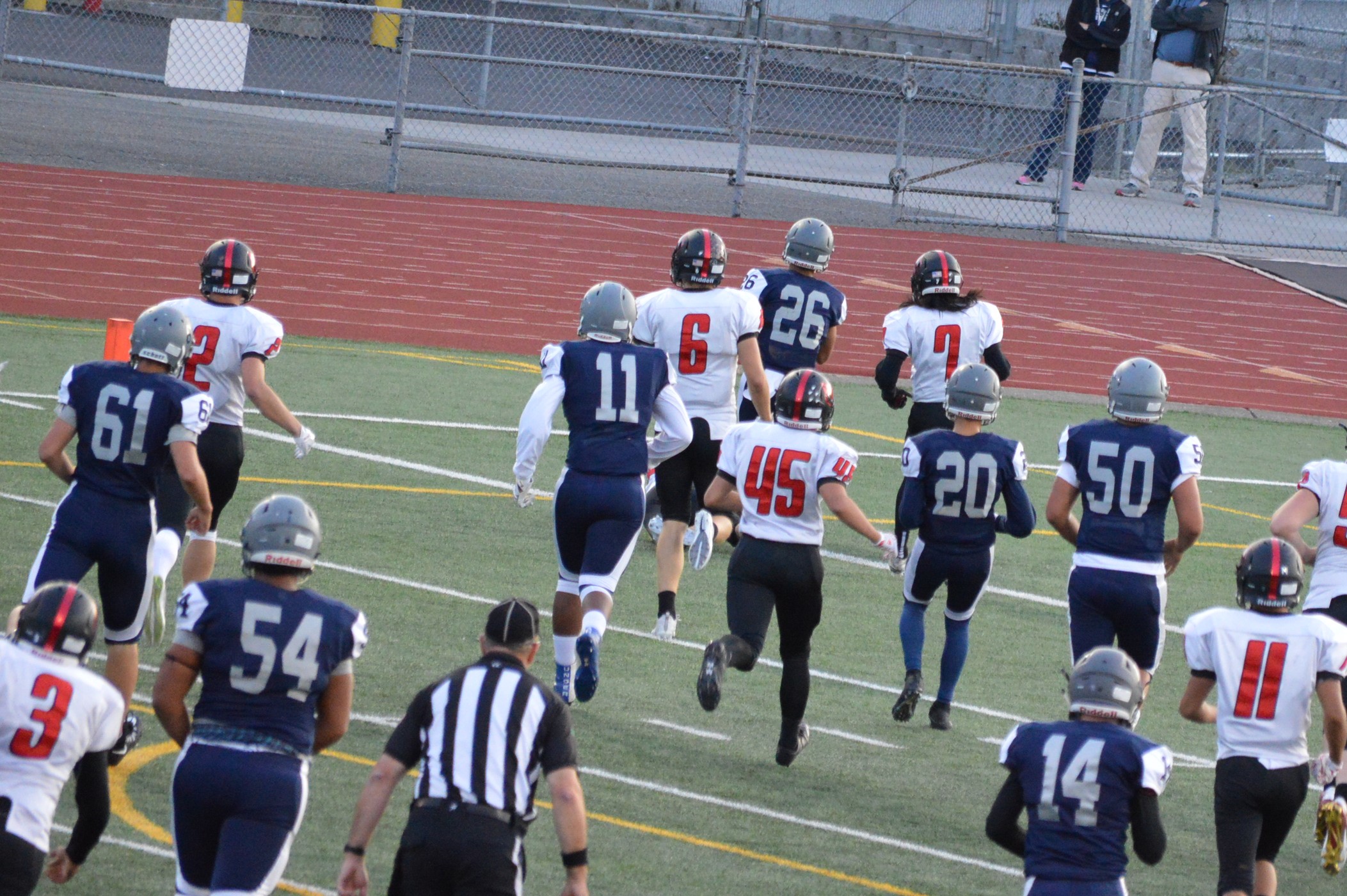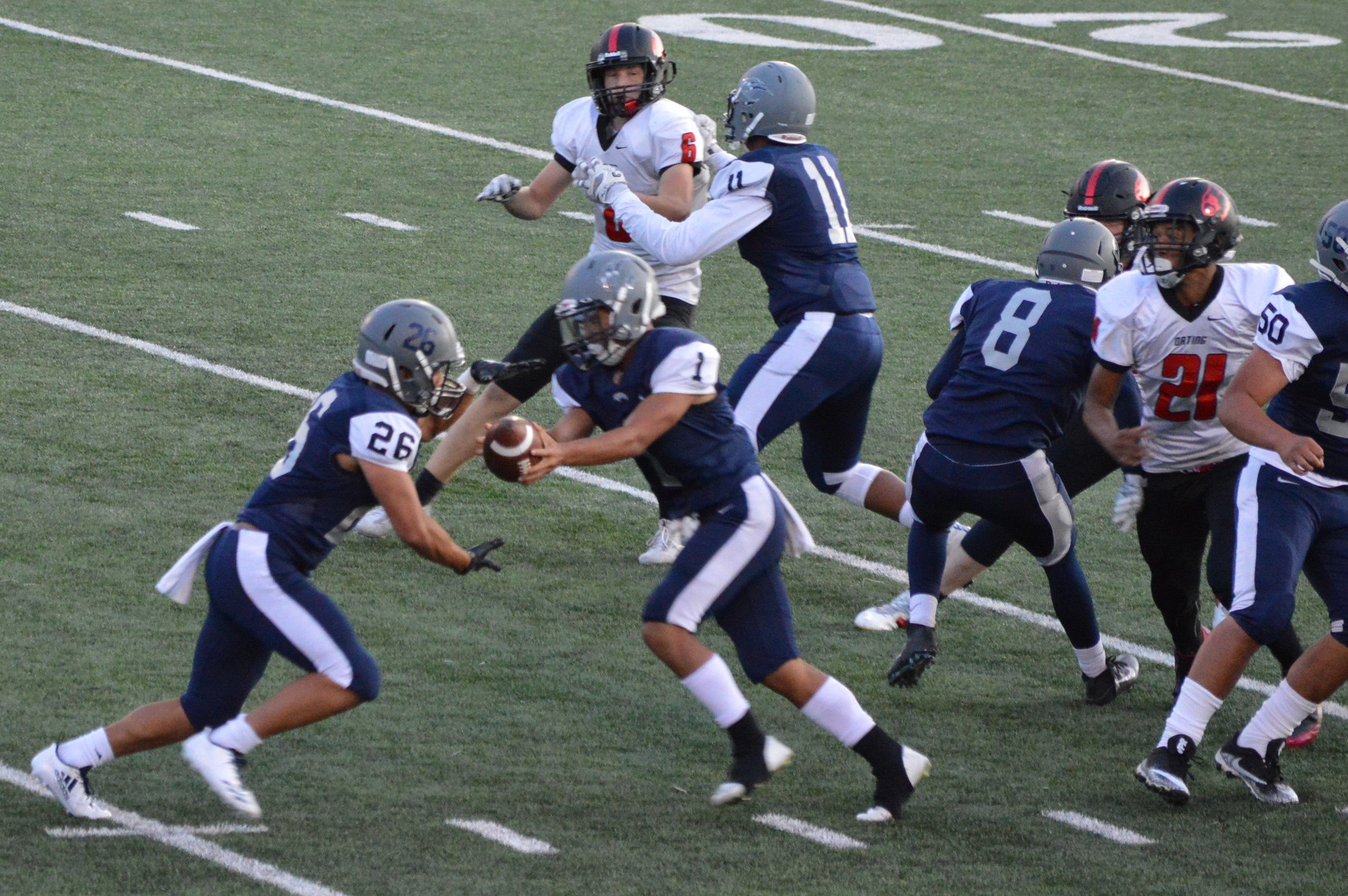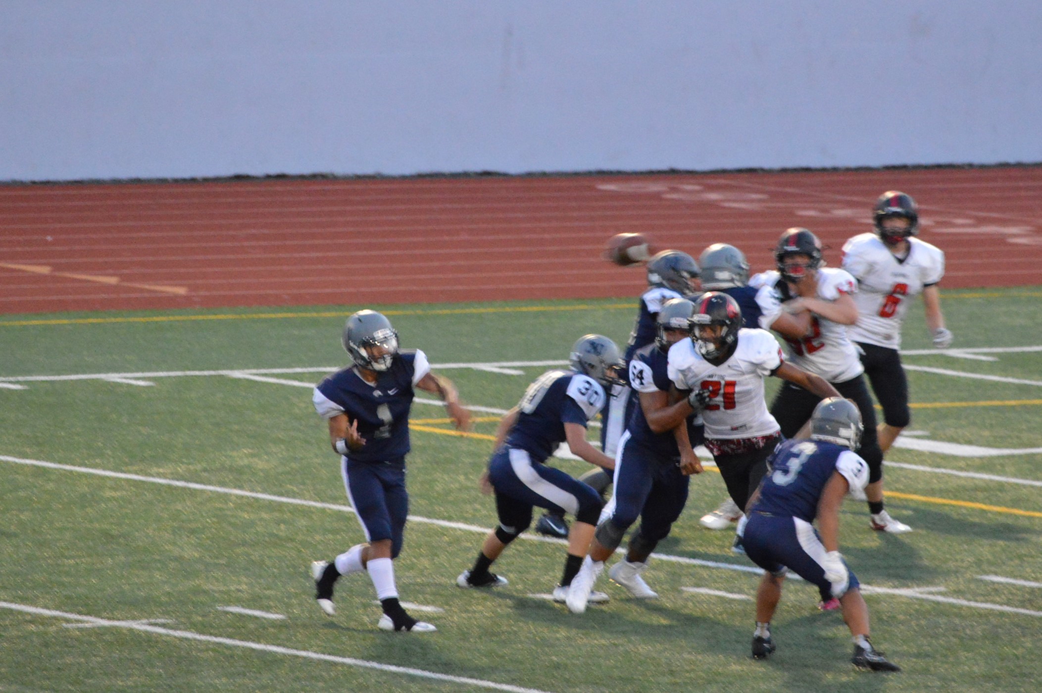 They got things started on their 1st drive going 80 yards mostly on the ground with Brian Melloy finishing it off with an impressive 29-yard run. The offensive line created a huge gap for Melloy this play off tackle behind Herb Polu and Carlo Cook. Fullback Ryley Larson also provided a key block to spring Melloy. The PAT was also an adventure when Blake Anderson, the holder, couldn’t scoop up a low snap so he grabbed it and took off around the left end and in for the 2 point conversion for an 8-0 lead.