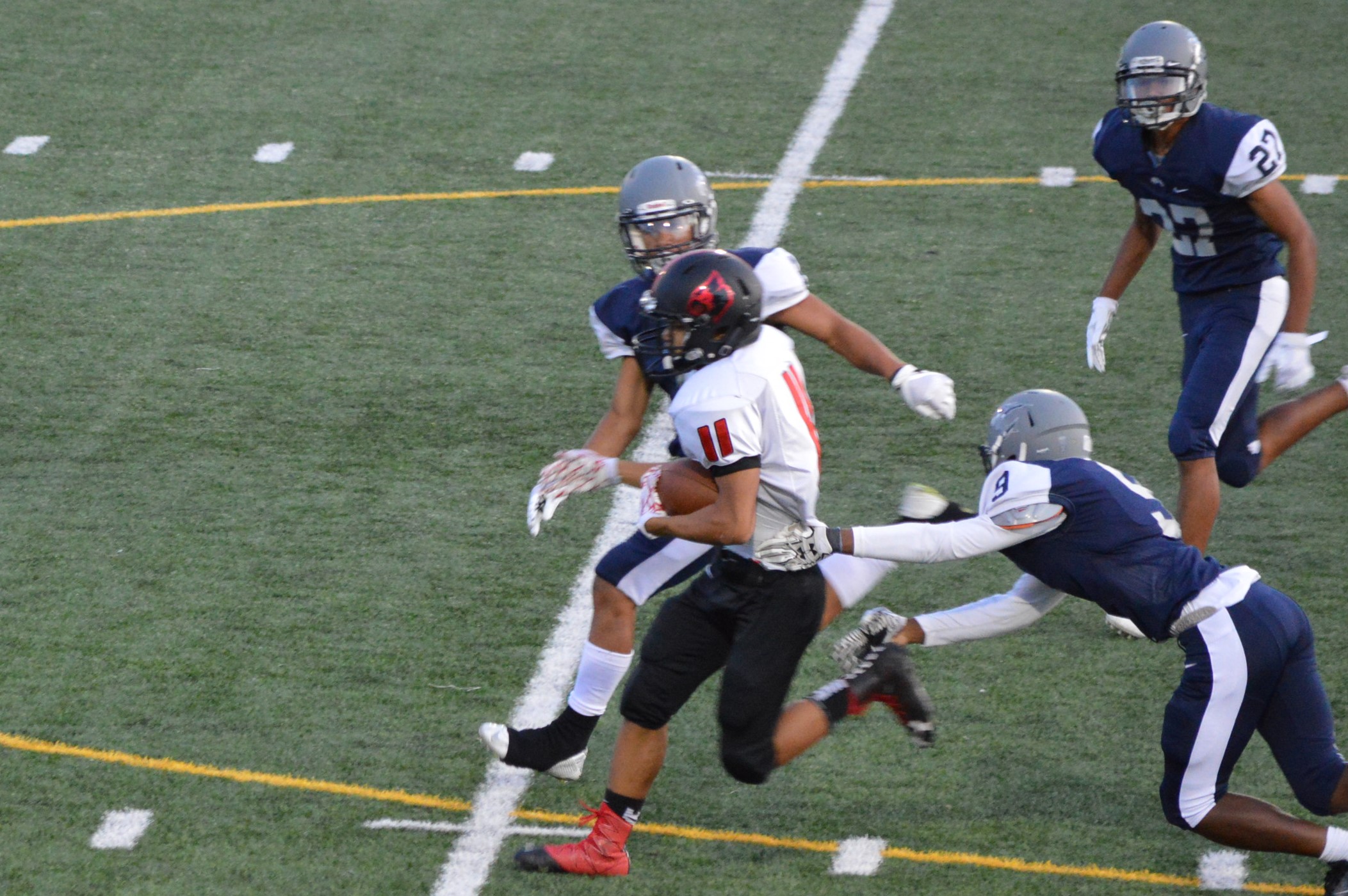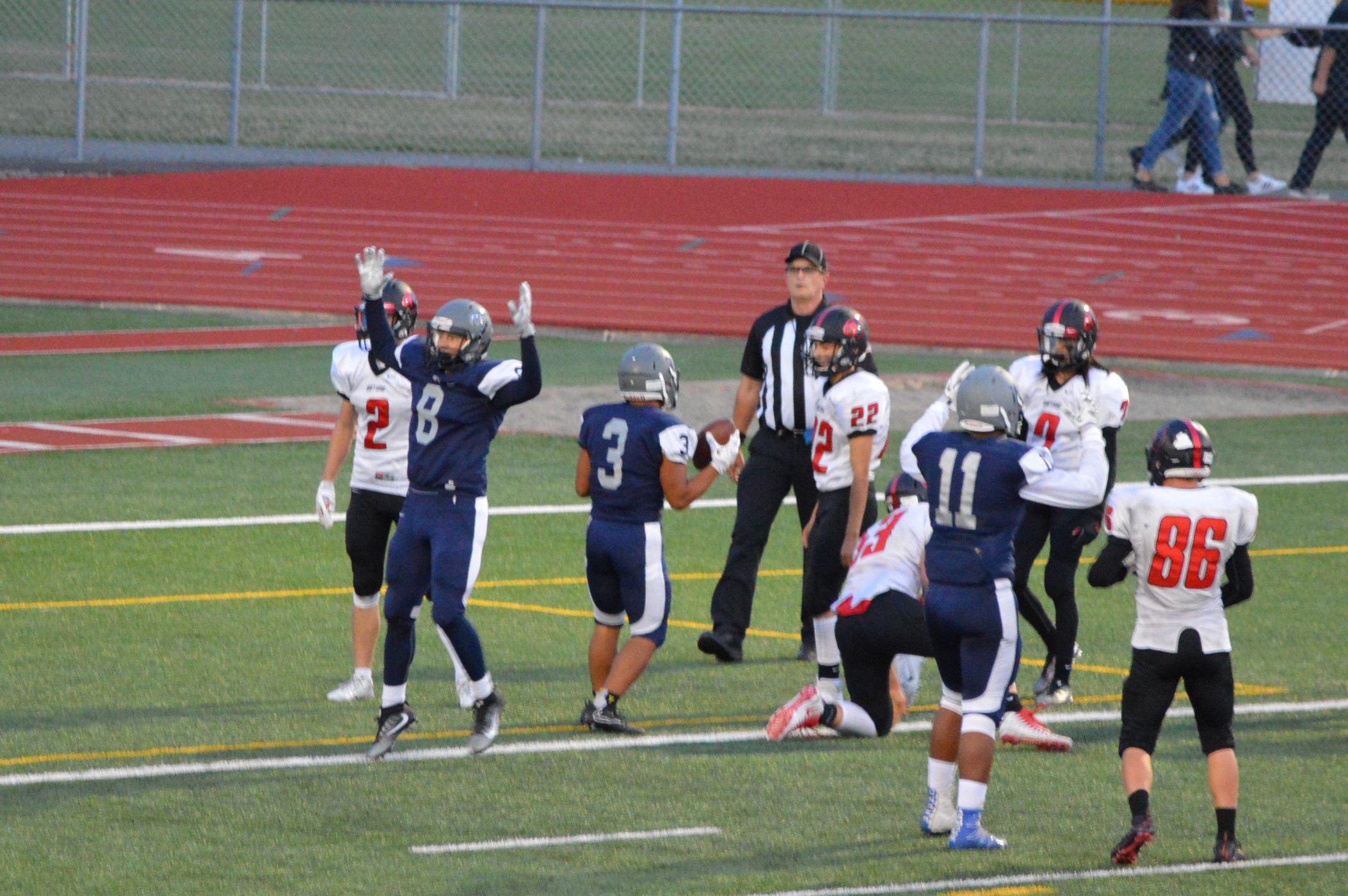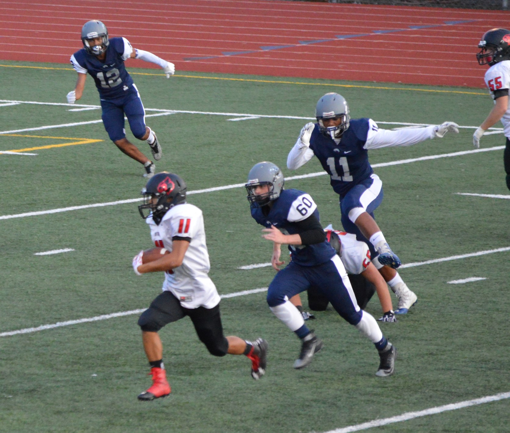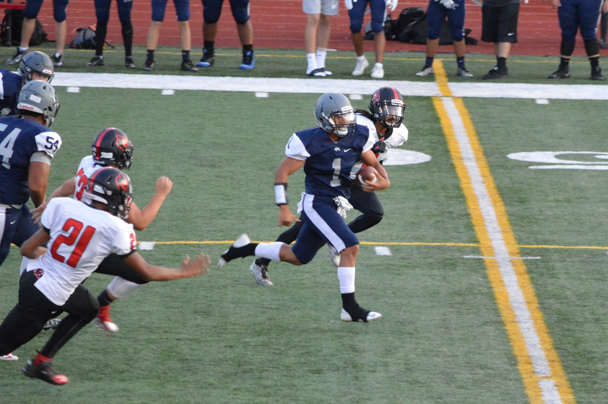 They got things started on their 1st drive going 80 yards mostly on the ground with Brian Melloy finishing it off with an impressive 29-yard run. The offensive line created a huge gap for Melloy this play off tackle behind Herb Polu and Carlo Cook. Fullback Ryley Larson also provided a key block to spring Melloy. The PAT was also an adventure when Blake Anderson, the holder, couldn’t scoop up a low snap so he grabbed it and took off around the left end and in for the 2 point conversion for an 8-0 lead.