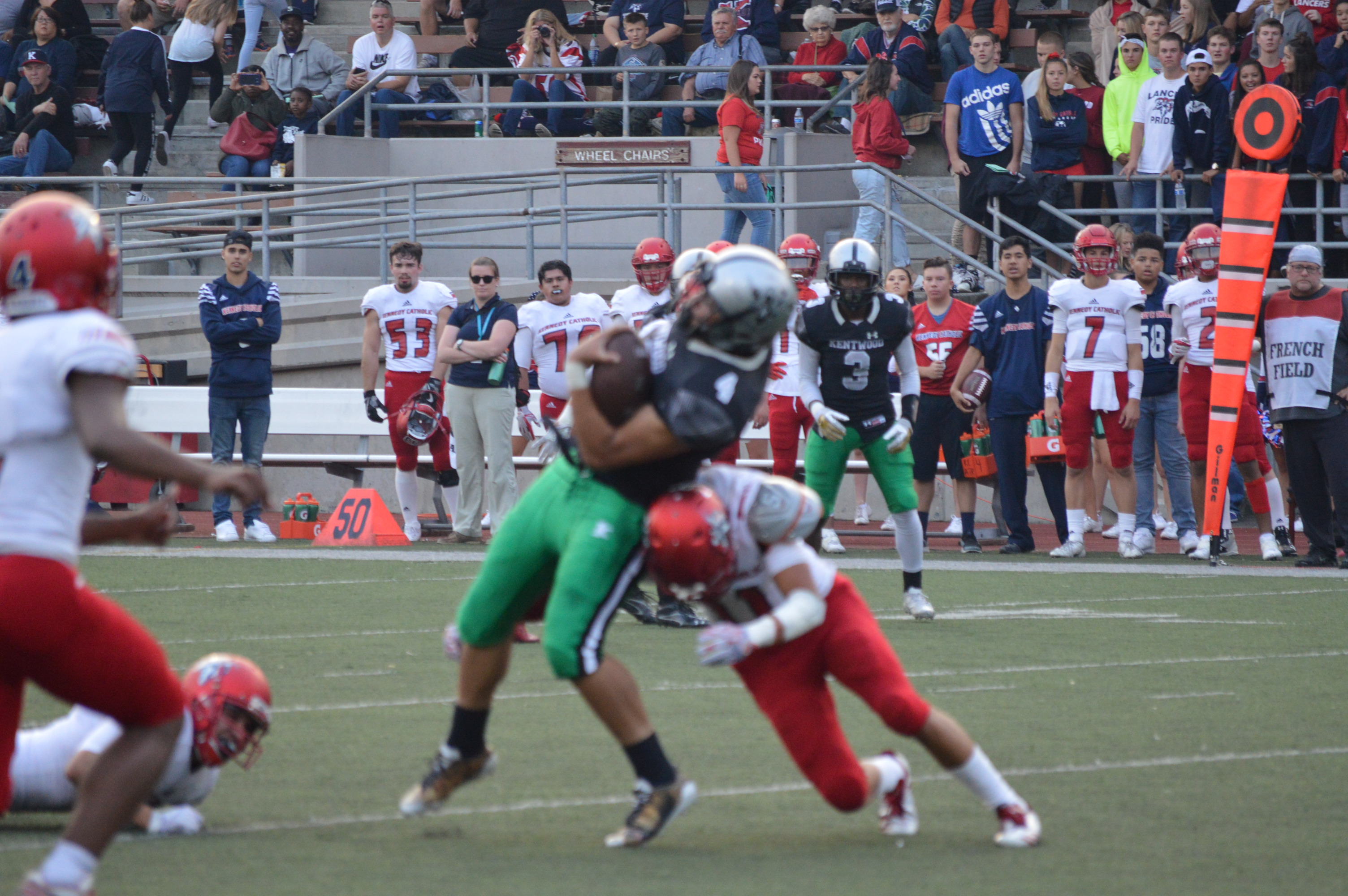 Instead of getting sucked into a passing showdown Bush stuck to his plan and came back with a huge running attack featuring Tayvonne Miller and Dyson Johnson. This 2-headed monster finished the game with a total of 246 yards and 4 TD’s, both eclipsed the 100 yard mark with Miller going for 137 and 2 scores while Johnson had 109 and 2 TD’s. The duo set the tone with this run dominated drive capped off with a tough 8-yard TD run from Miller. The PAT failed and KC led 7-6.