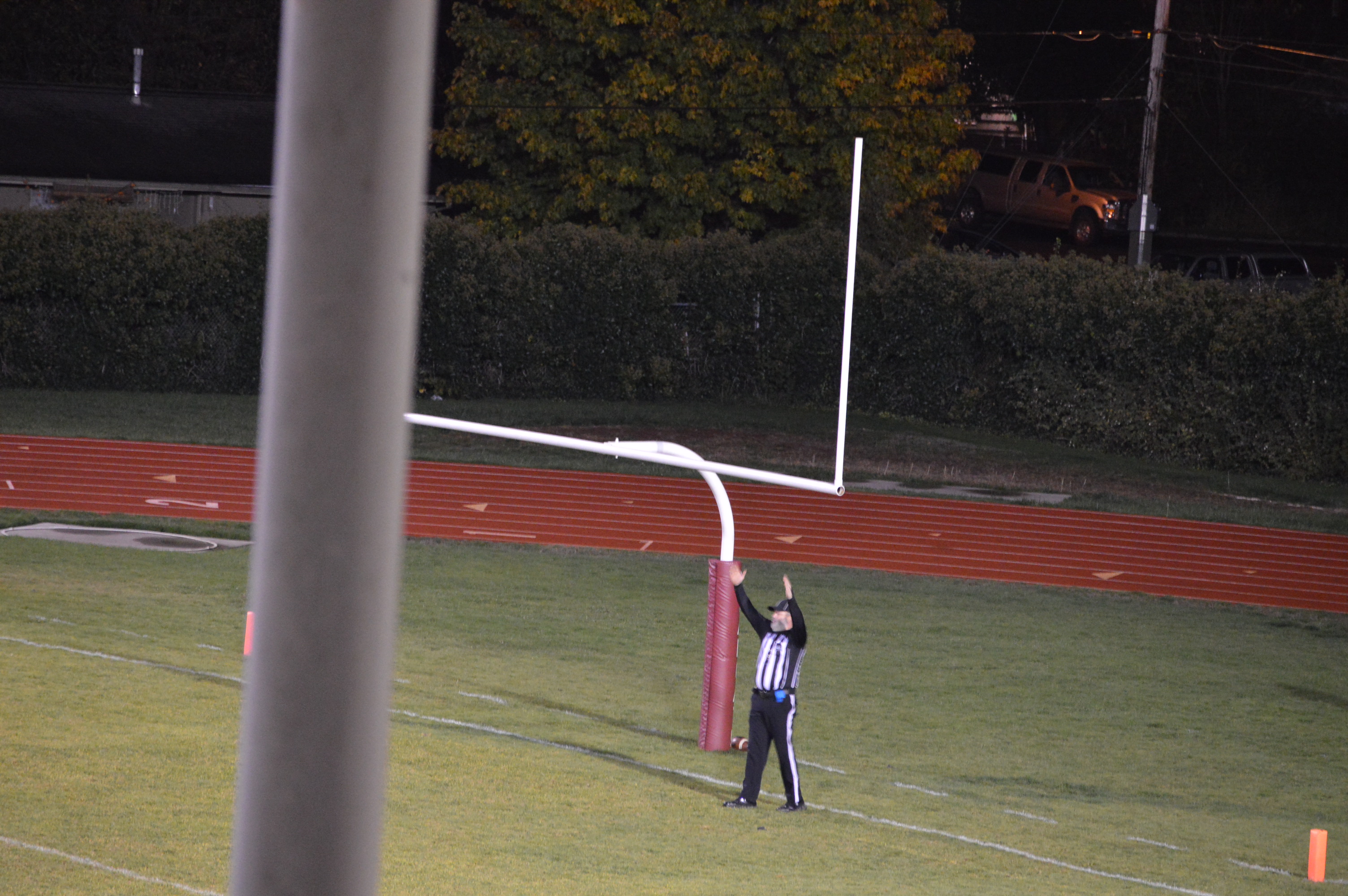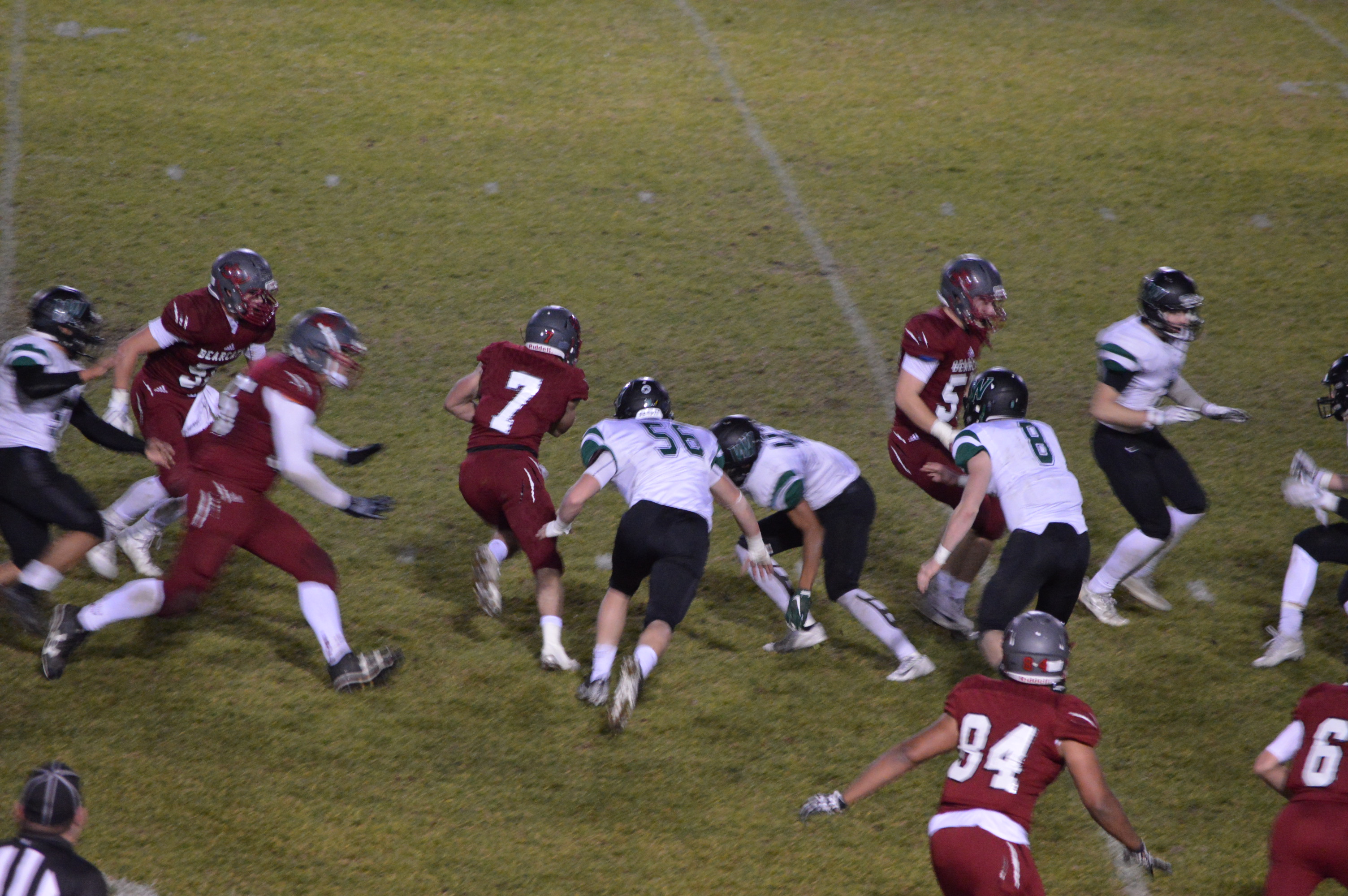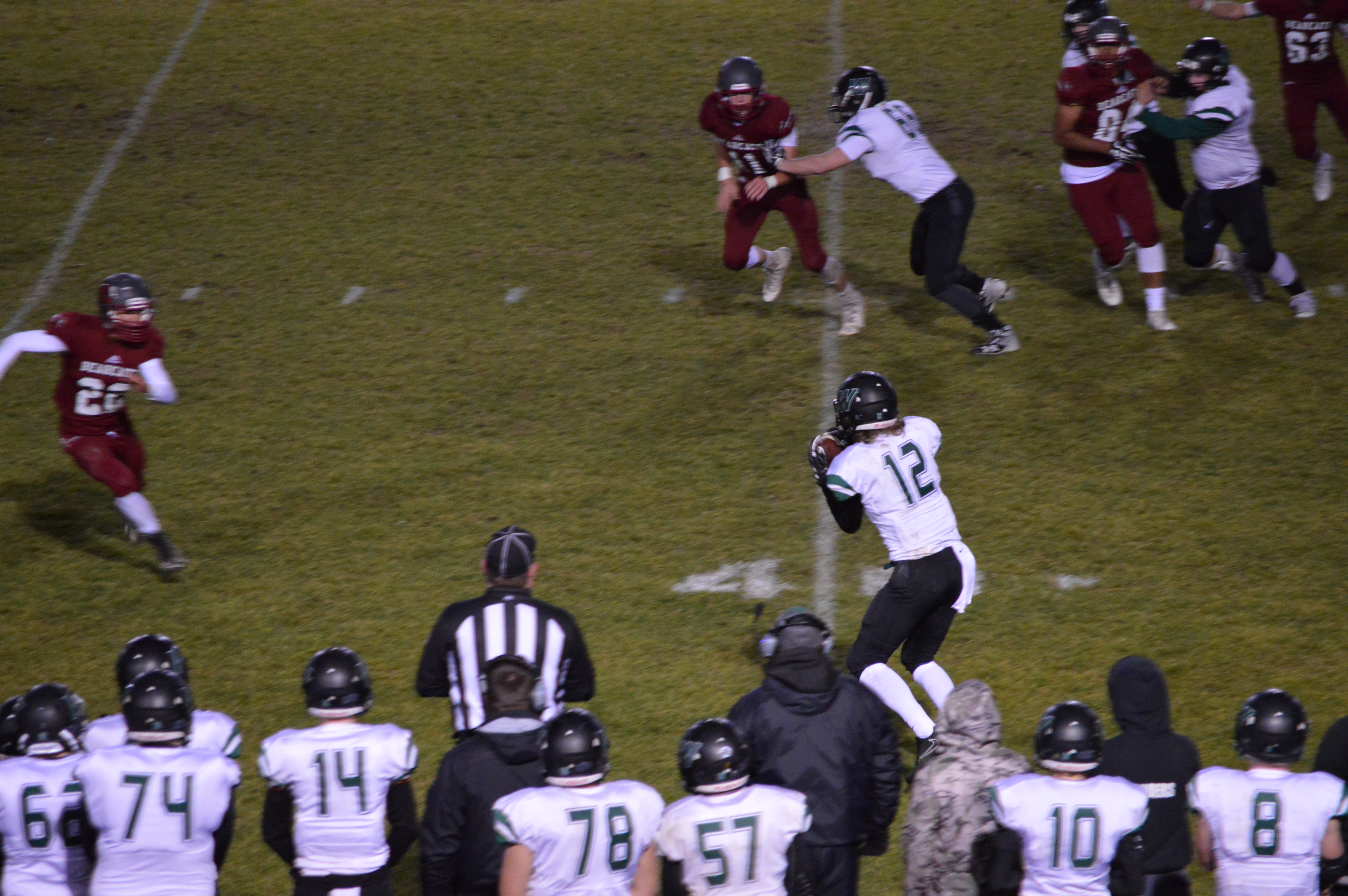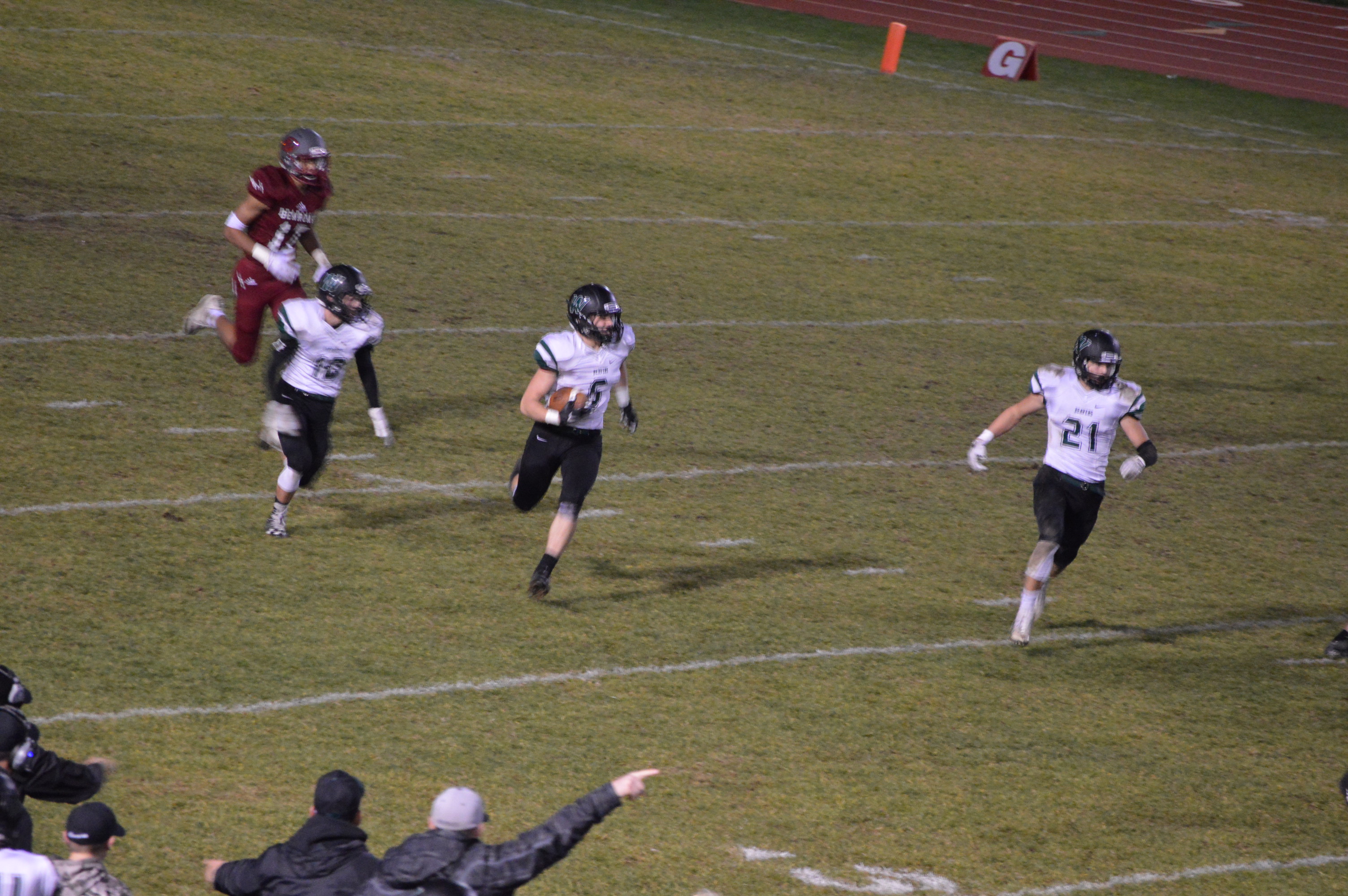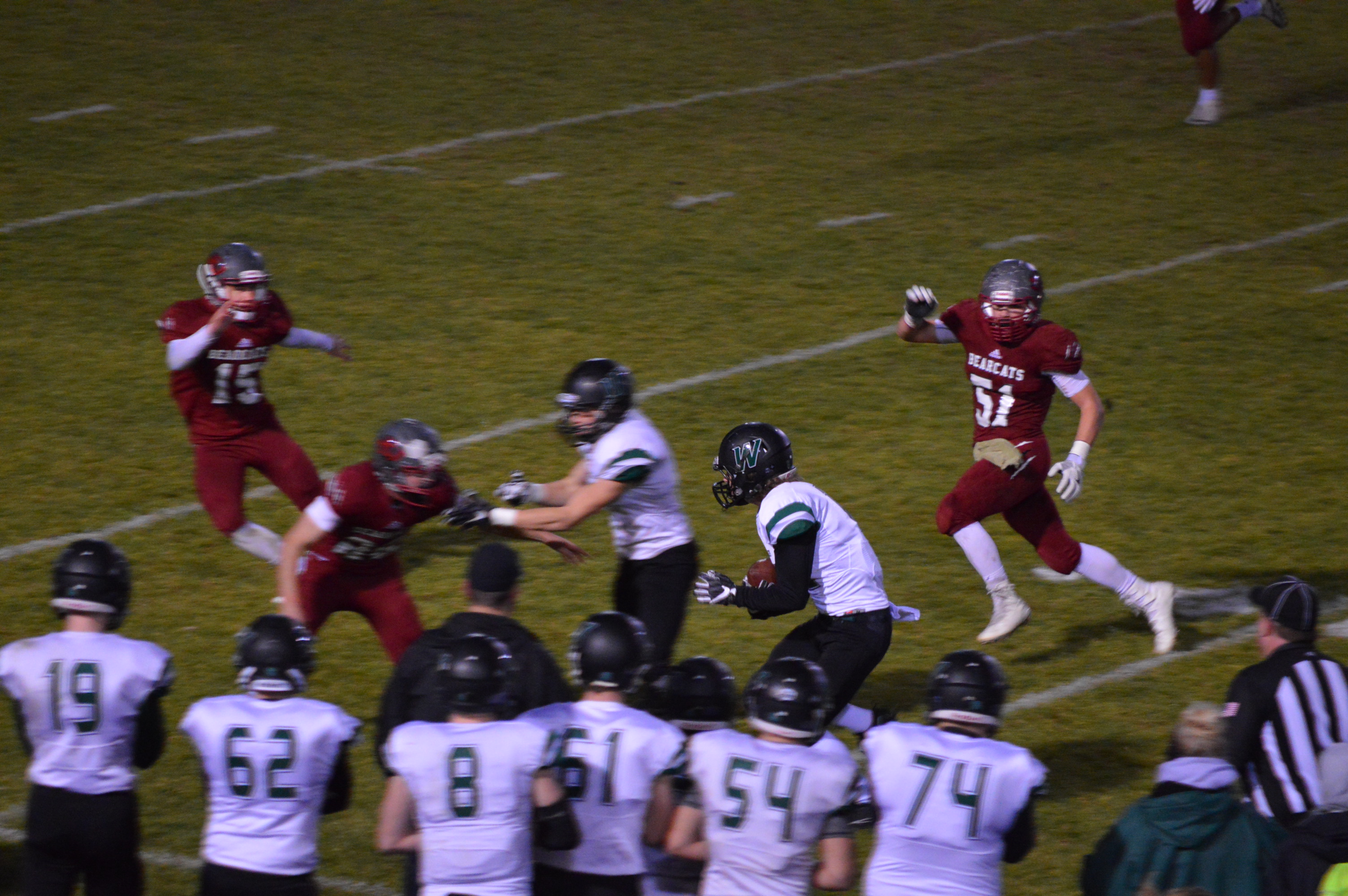 This set up an astonishing finish that saw the Bearcats move from their own 38 to the 20 yard line with 5-seconds to play. WF West Coach Bob Wollan then sent his kicker “Legatron” into the game to attempt a 37-yard game-winning field goal. The Beavers put on a strong rush but Cory Davis got the kick off, however he had to hurry the kick and it was a line-drive that crossed under the crossbar and was no good and we got set for OT, except that little yellow flag was on the ground and roughing the kicker was called against Woodland giving Davis a 2nd chance this time from 27-yards out and he booted high, deep and straight and with no time on the clock for the extra play ended the Beavers season in heartbreaking fashion while the Bearcats euphoria swept over the home team sideline and in the stands.