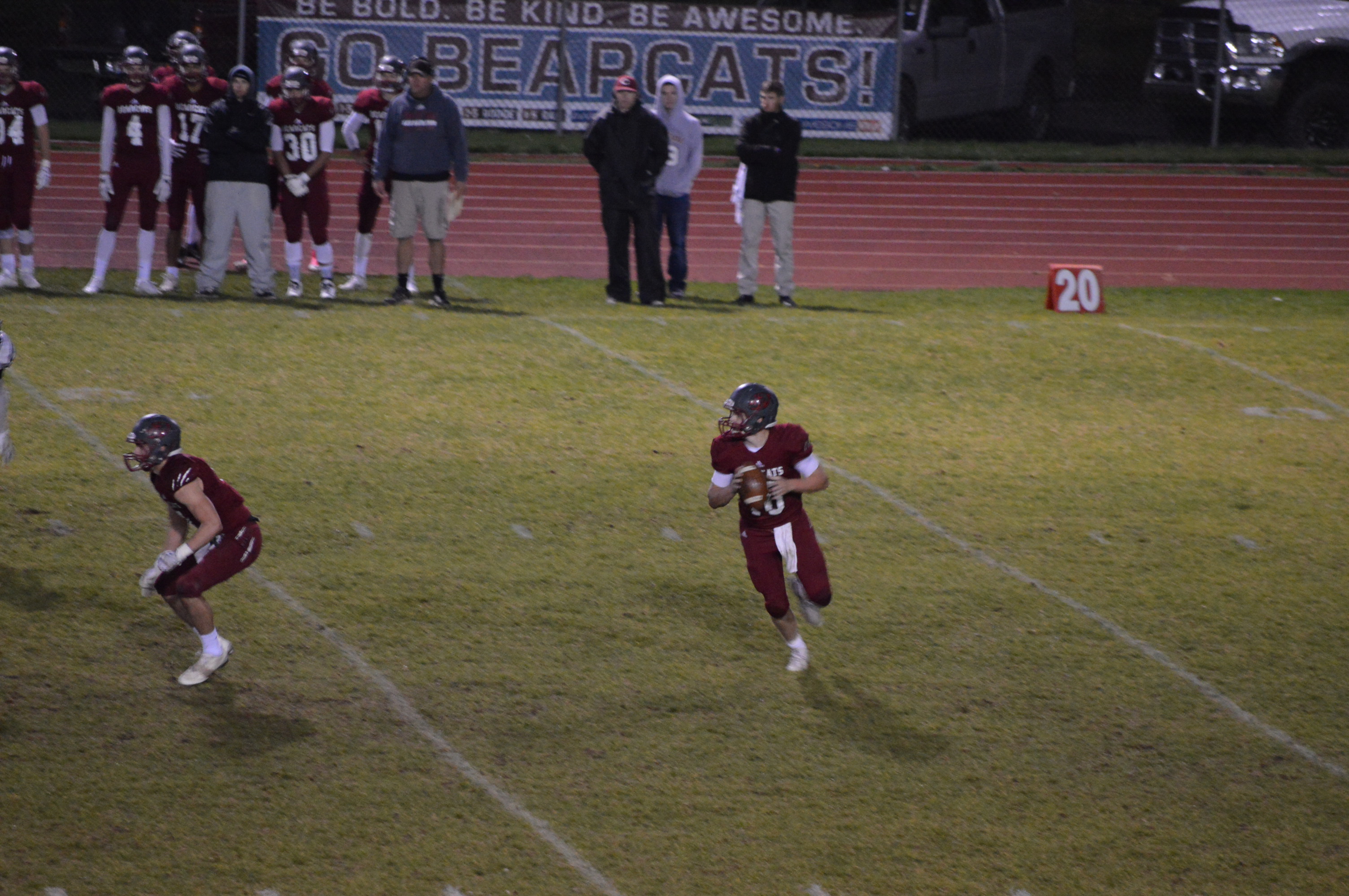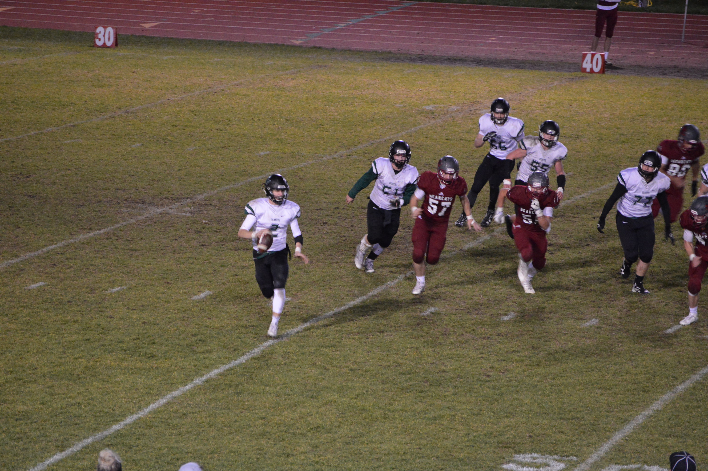 The Bearcats re-grouped and began the 2nd half with a new offensive formation trying to rekindle the 1st half running game that the Beavers were able to slow down in the 2nd quarter. The shift allowed Nole Wollan to run wild including a 57-yard option run for a touchdown just 58-seconds into the 3rd. Wollan then threw a bullet to Jordan Thomas converting the 2 point PAT and the game was tied at 21.