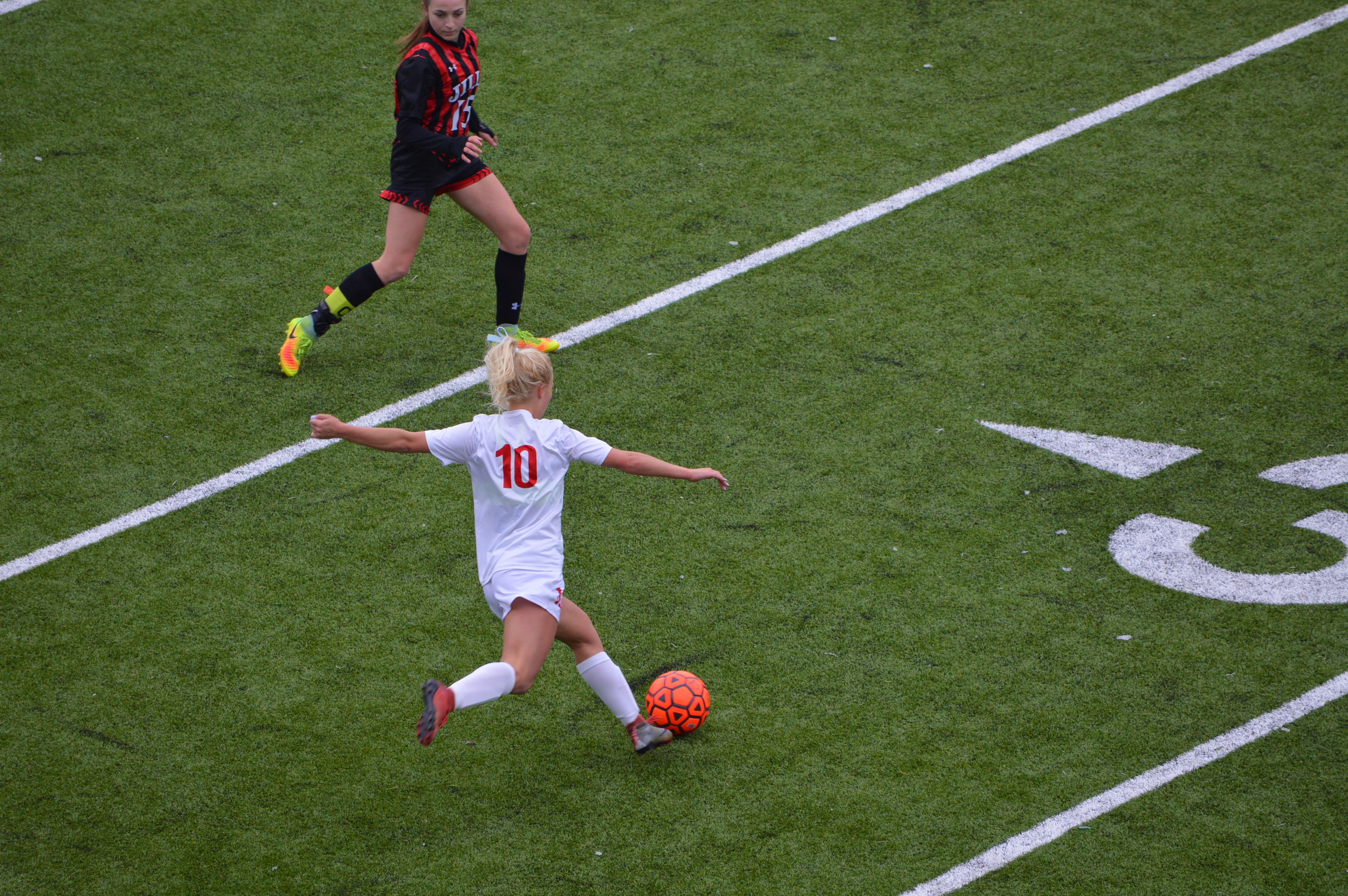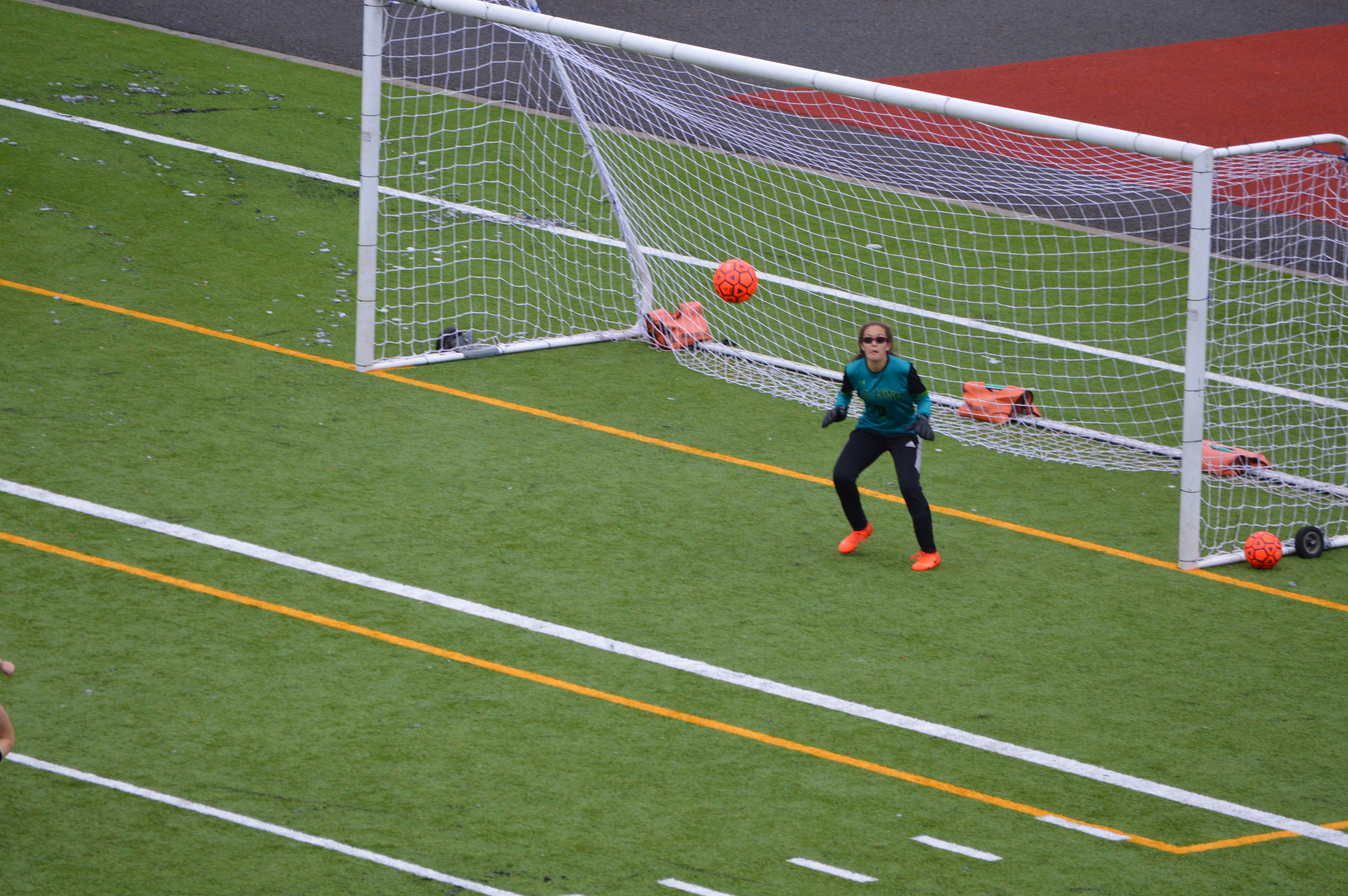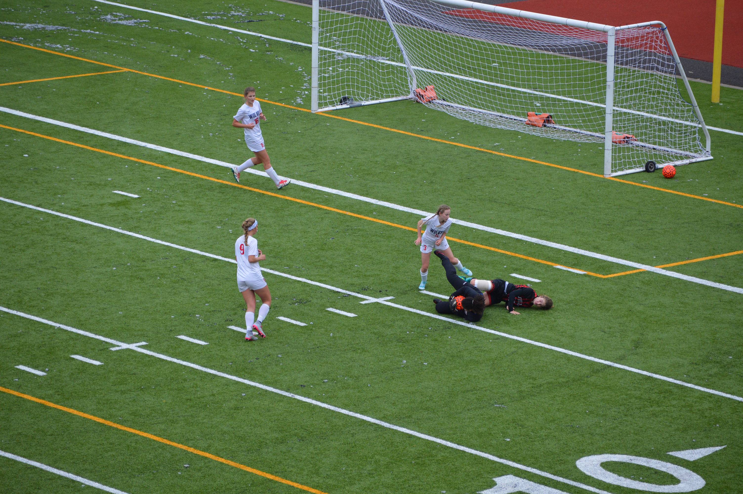 Barker’s toughness went on display early in the second half, with her team leading 2-0. Charging out to defend an attack, she slammed into Ruell, resulting in a penalty kick which was converted by Brown after Barker lay on the turf for several minutes. Five minutes later she was attended to by coaches and trainer again after another collision with a pair of Black Hills players.