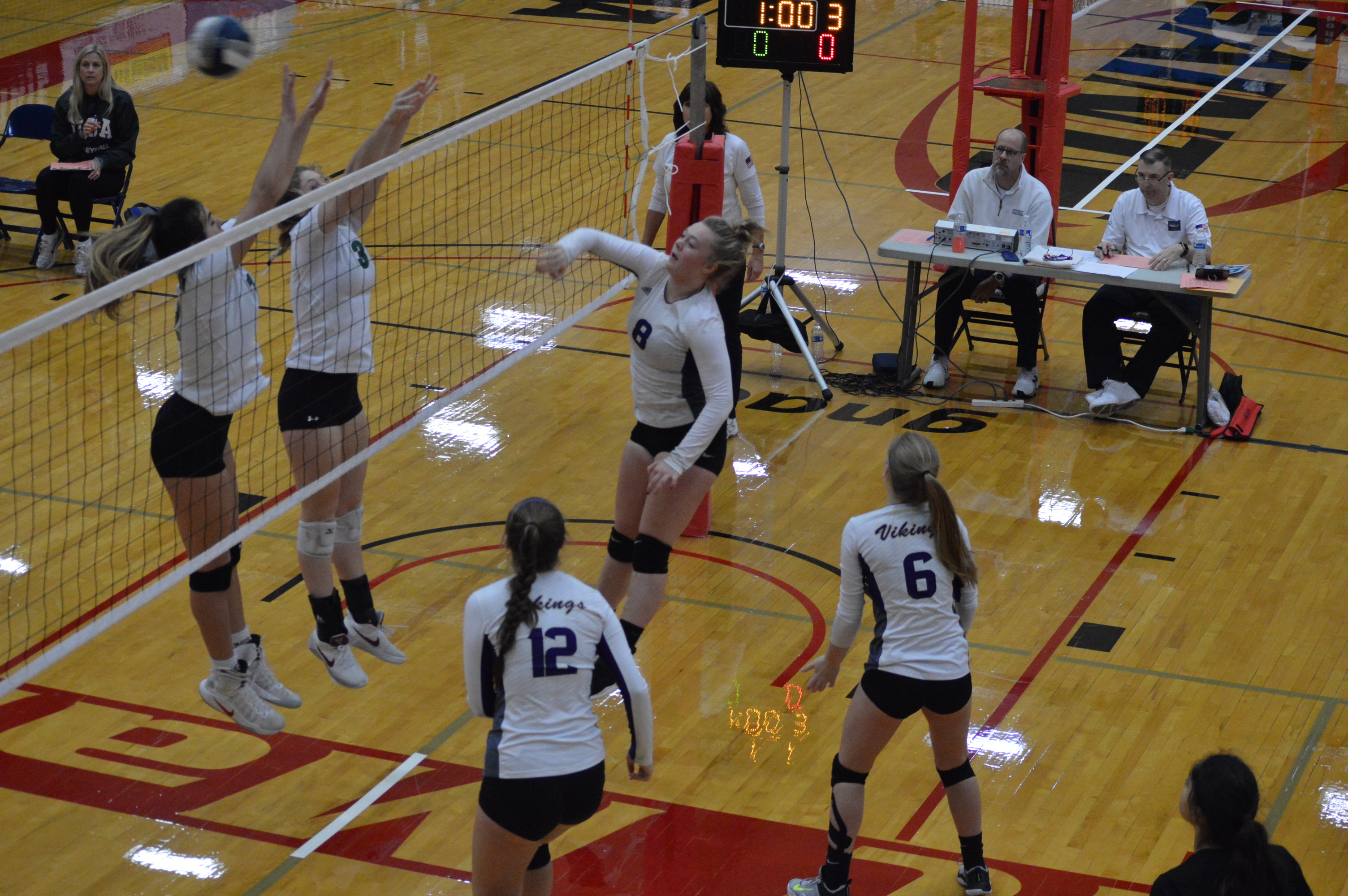 The Knights and Vikings wasted no time in getting into play-off mode at 8:30 in the morning with a spectacular 1st set going overtime. East Valley got lots of strong net play from Genesis Wilkinson and McKenzie Whallon. They came up with some key blocks to get the Knights day started with a big win.