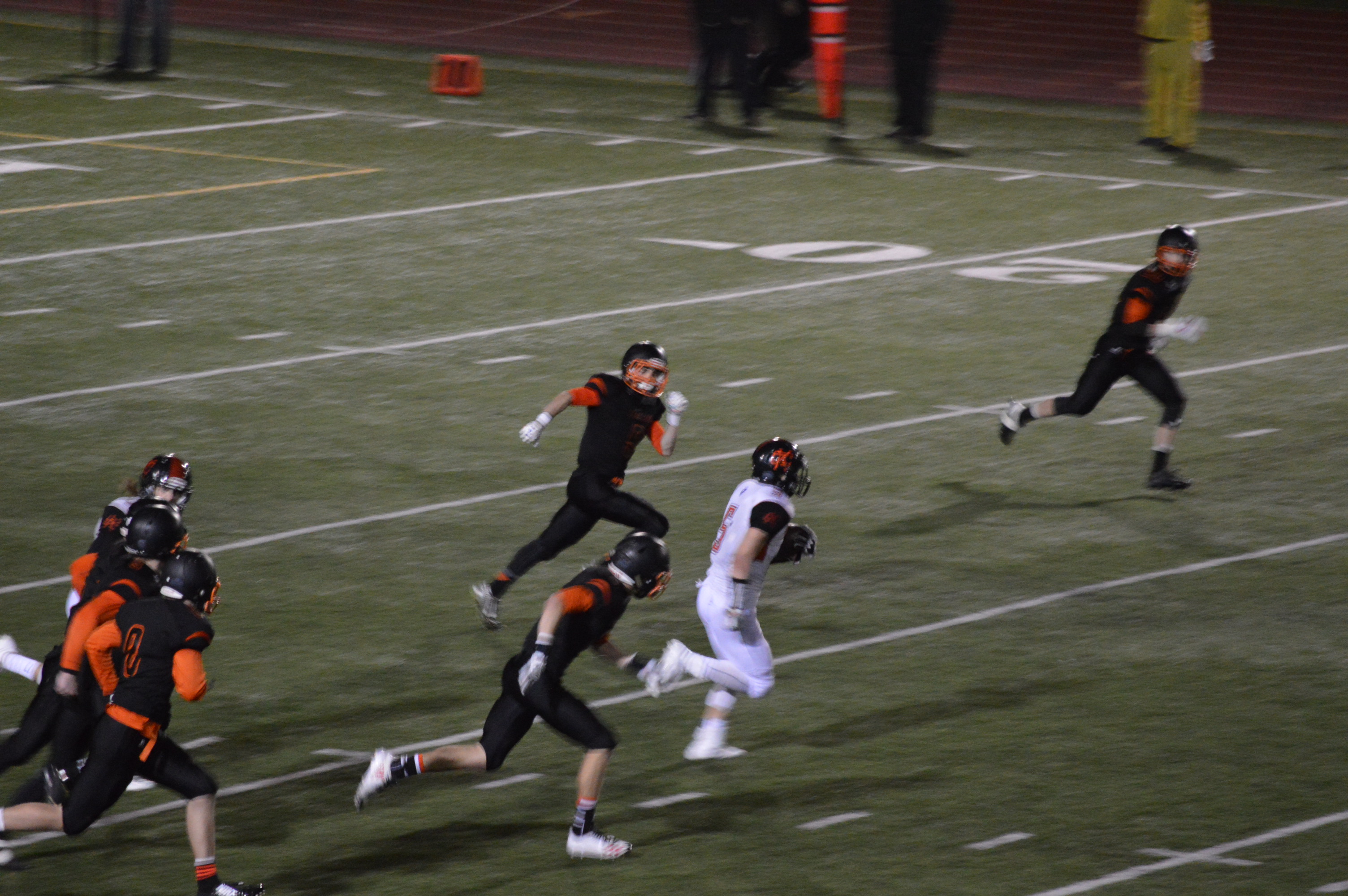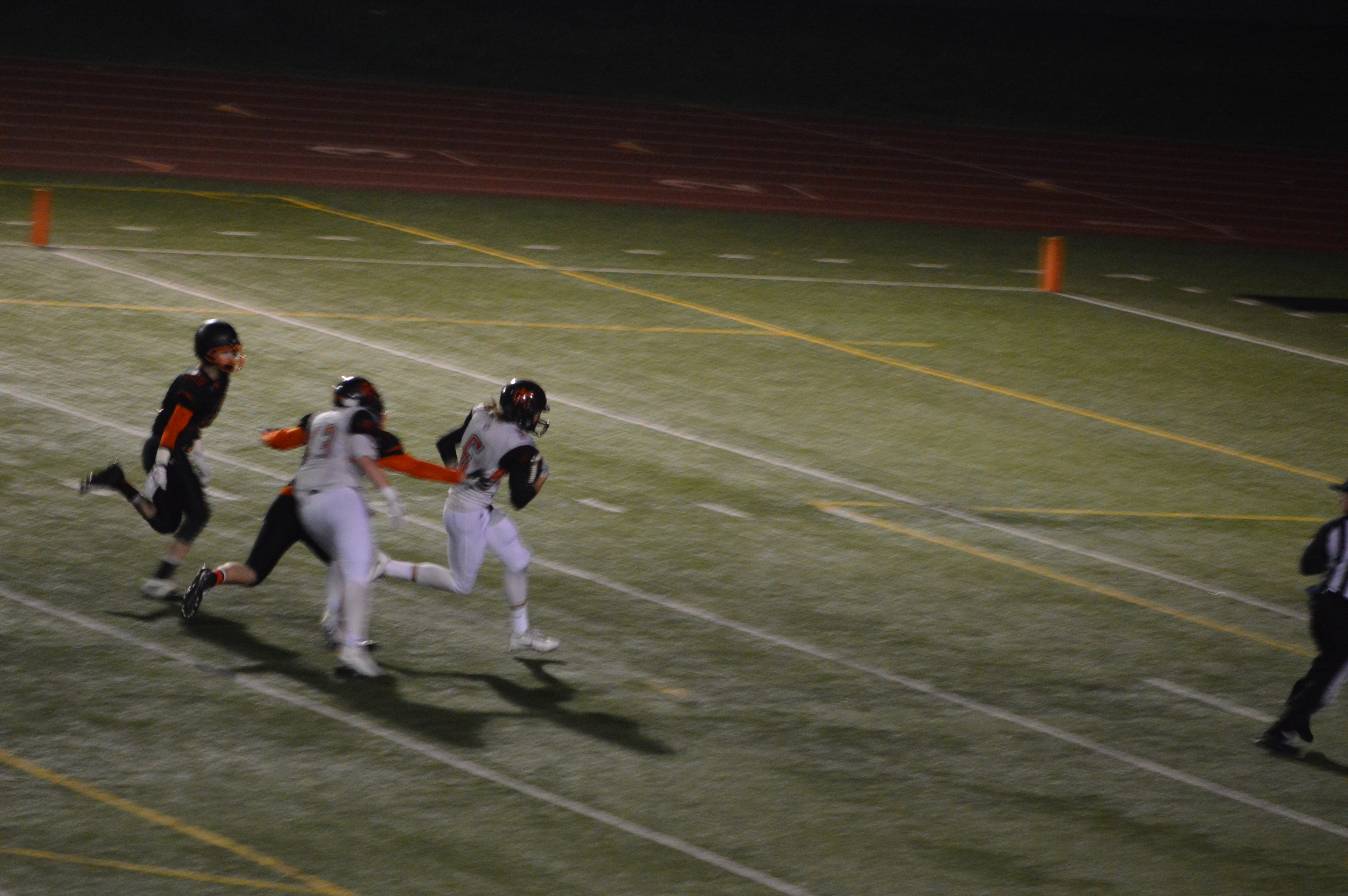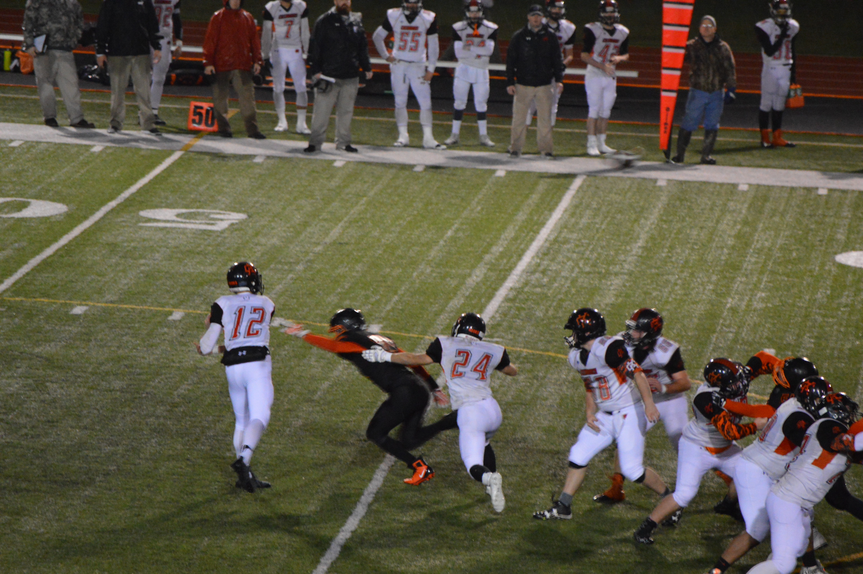 Early in the 4th quarter the only scoring play of the 2nd half would be on a 3rd and long from Kalama’s own 6-yard line when Dyer dropped back and was looking for Jacob Herz on a simple slant pattern trying to get a little more room to punt it away. Instead Herz reached out with 1 hand as the ball was out in front of him and he looked up and saw nothing but green. Receiver Marques Lies came from nowhere and provided Herz with a key block to spring him all the way to the house as Herz flashed his sprinter’s speed and pulled away for the 94-yard TD catch and run. The PAT missed but Kalama held a 7 point lead, 20-13.
