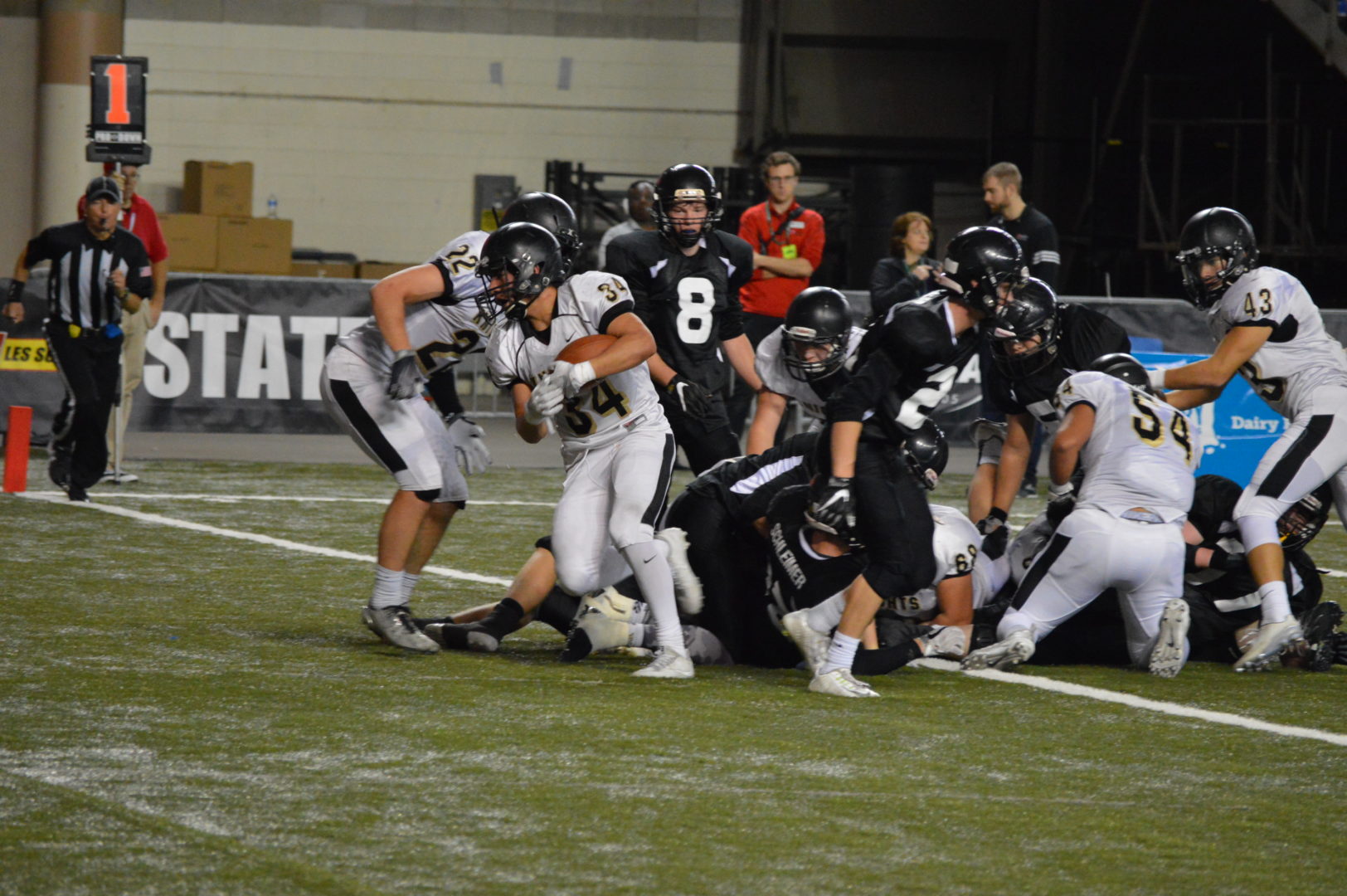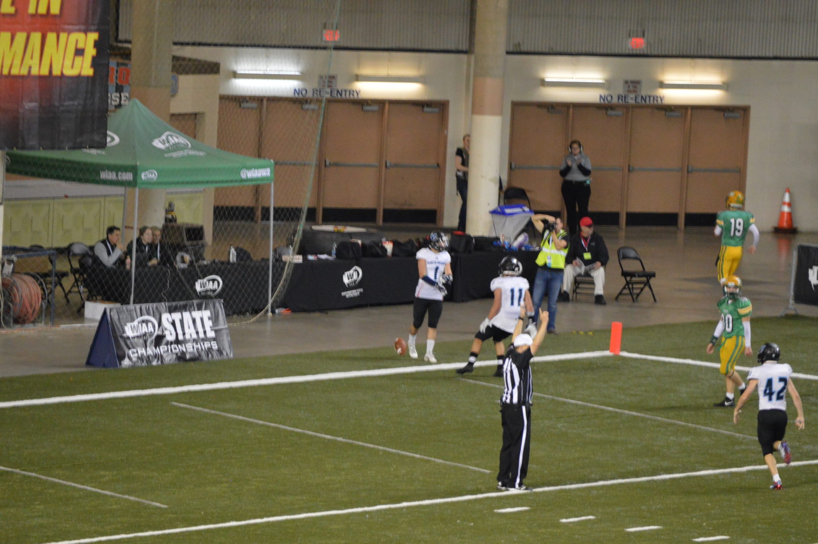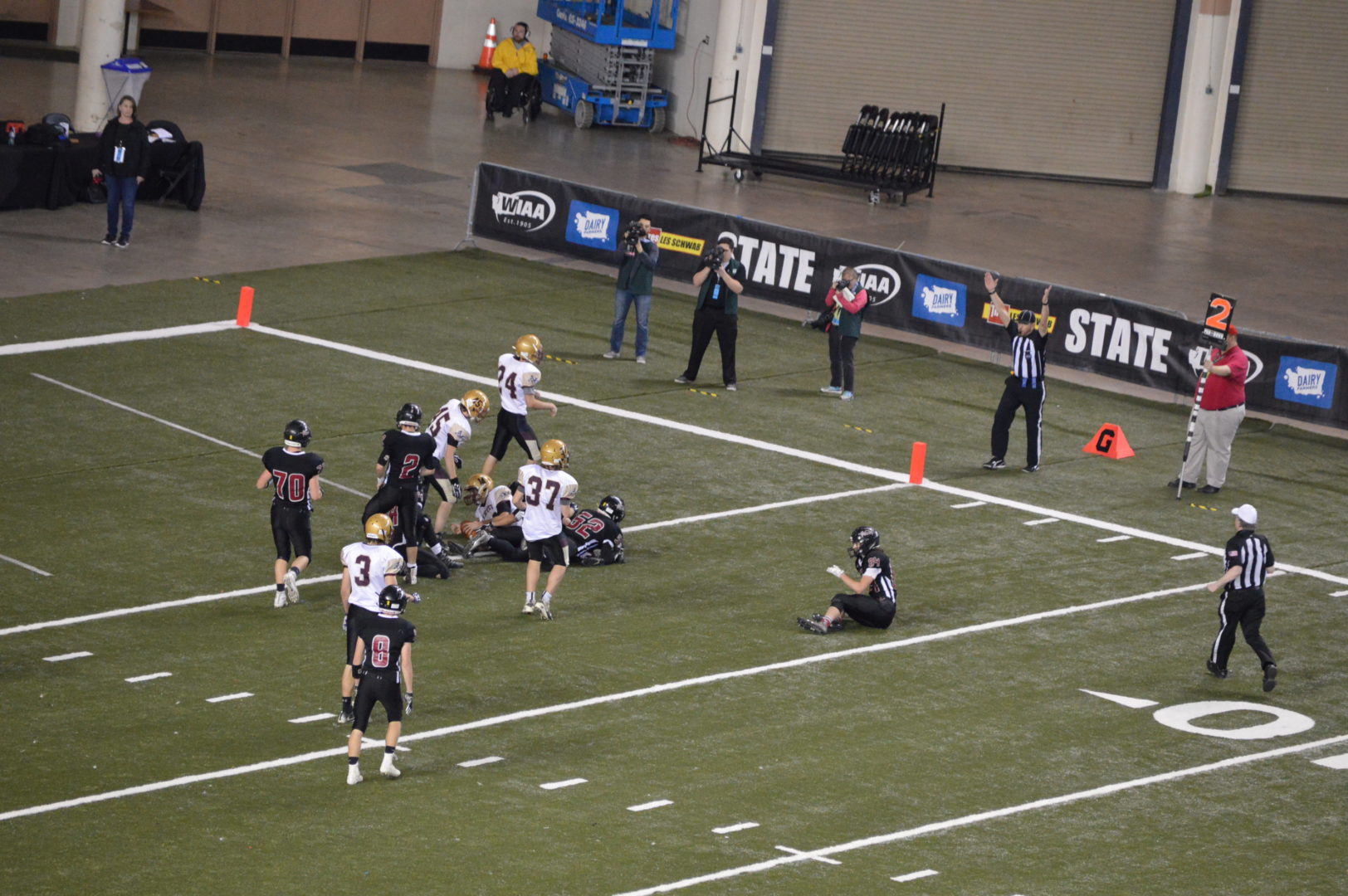 The Nooks made their fans a bit nervous as they ran the ball for a gain of 9 but Herz ran out off bounds. Haynes then got the 1st down on a 2-yard plunge and now they could kneel but the clock was stopped for the moving of the chains and the officials started the play clock which should have started the game clock as well but they were at least 13 seconds off now leading to confusion for the Kalama coaching staff if they had to run another play or just kneel.