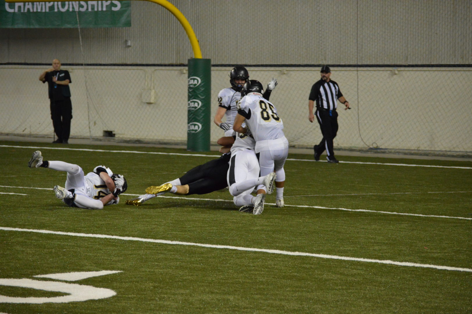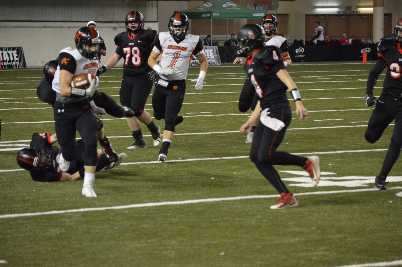 After Liberty cut into an early 14-0 Chinooks lead with its first touchdown on a five-yard run by James Heer with 9:50 left in the second quarter, the Lancers lined up for a conversion kick but, when offsides was called against Kalama, chose to go for two. Heer, who led the game in rushing with 113 yards on 29 carries, was tackled behind the line of scrimmage.