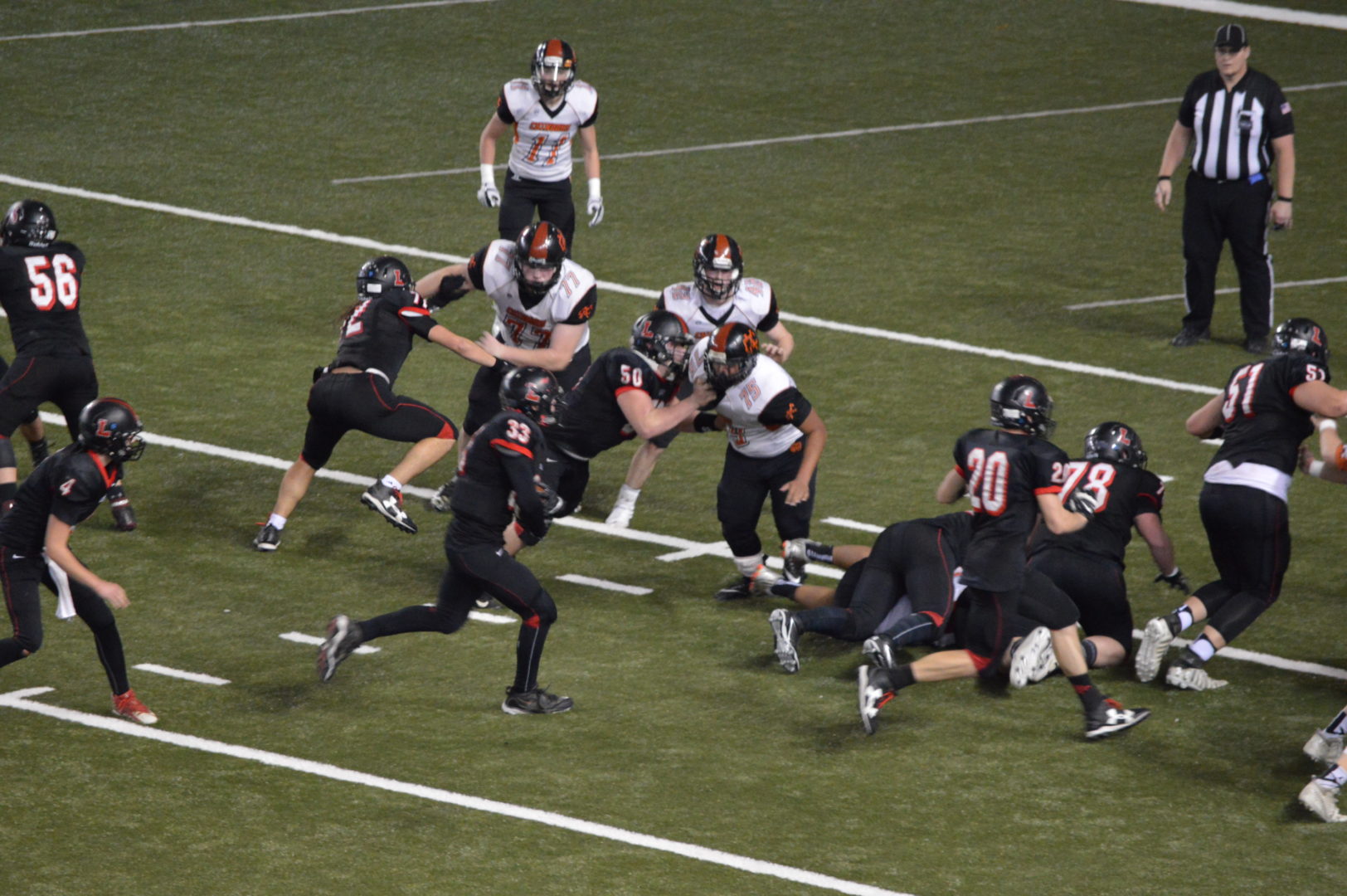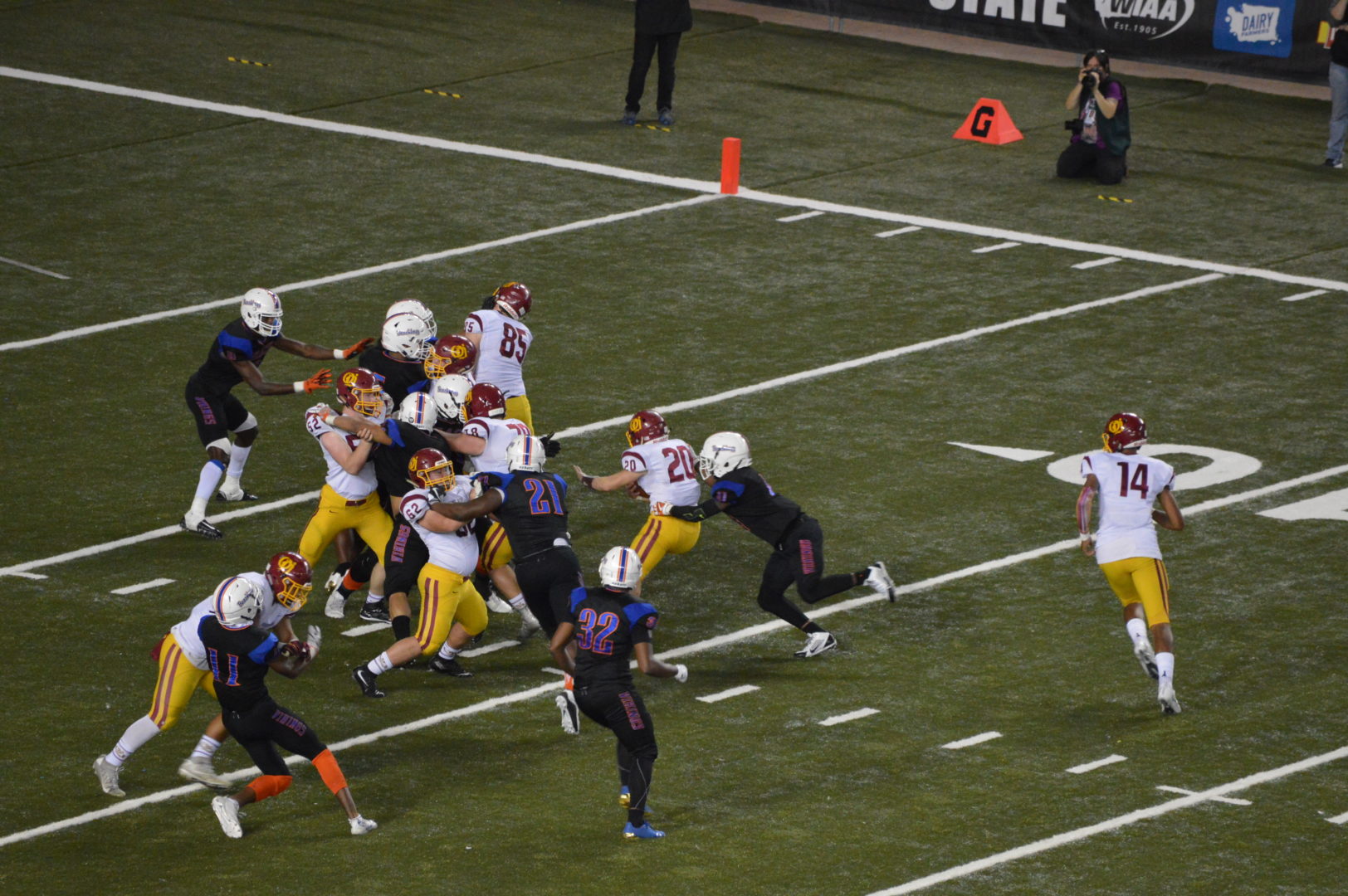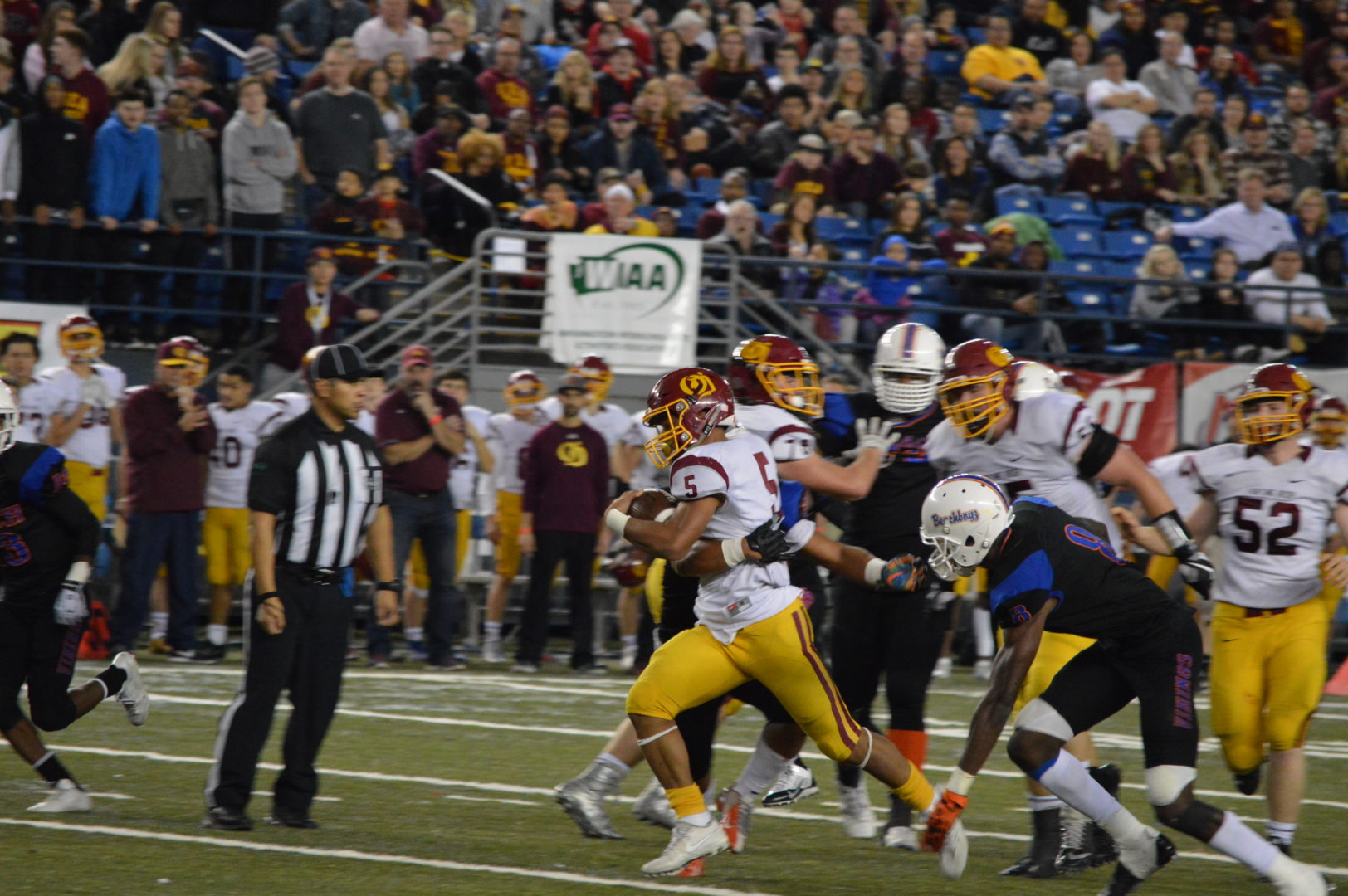 (Tacoma, WA) Talk about a tale of 2 halves! The 4A Championship was being anticipated as one of the more closely played games but Richland ran up a 28-0 lead at halftime and it looked like the blow-out was on. But Woodinville, no matter the reason for the slow start re-grouped and their defense that just shut out a high powered Sumner offense in the Semi-Finals finally showed up and the scrappy offense made a run.