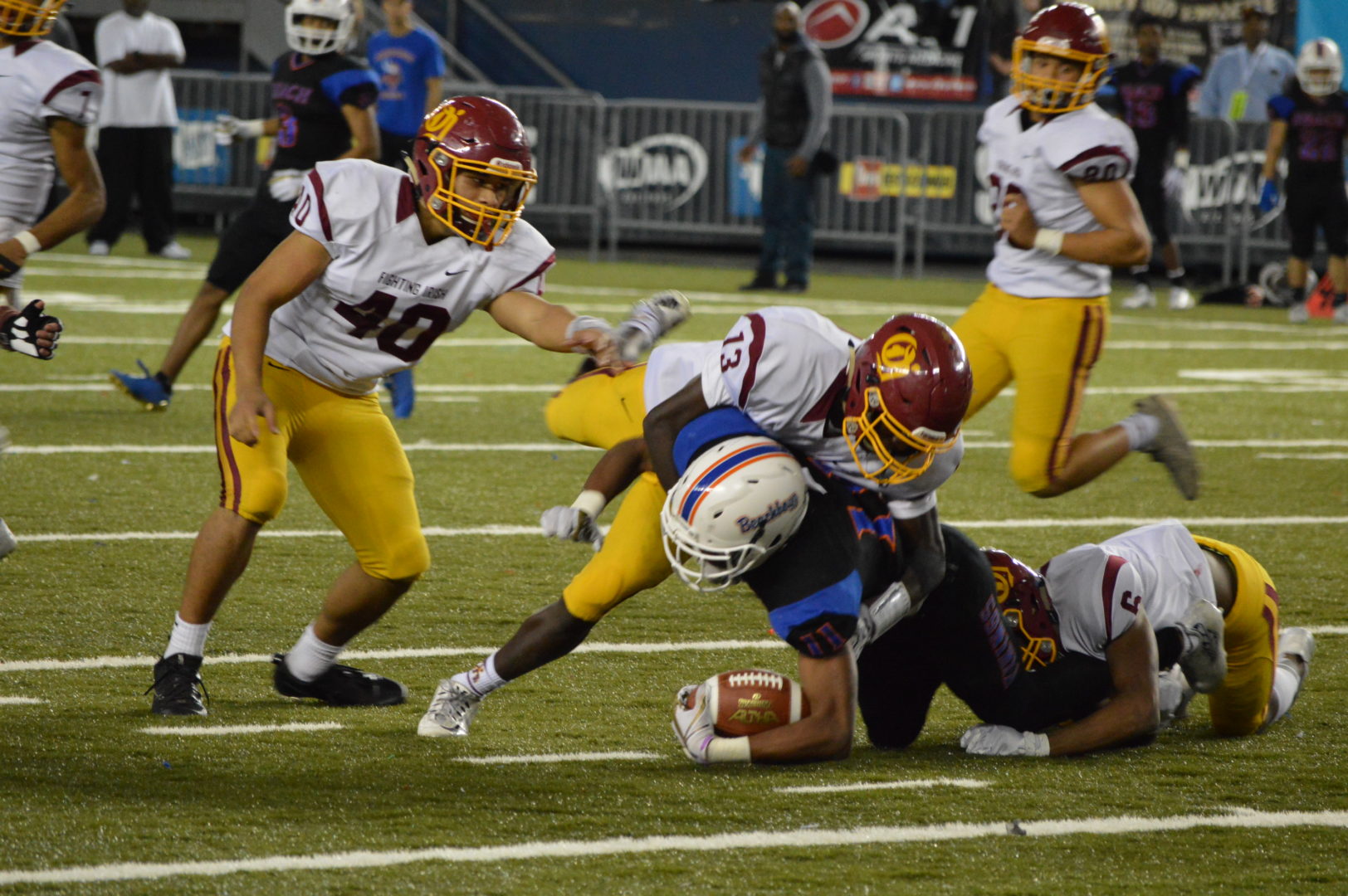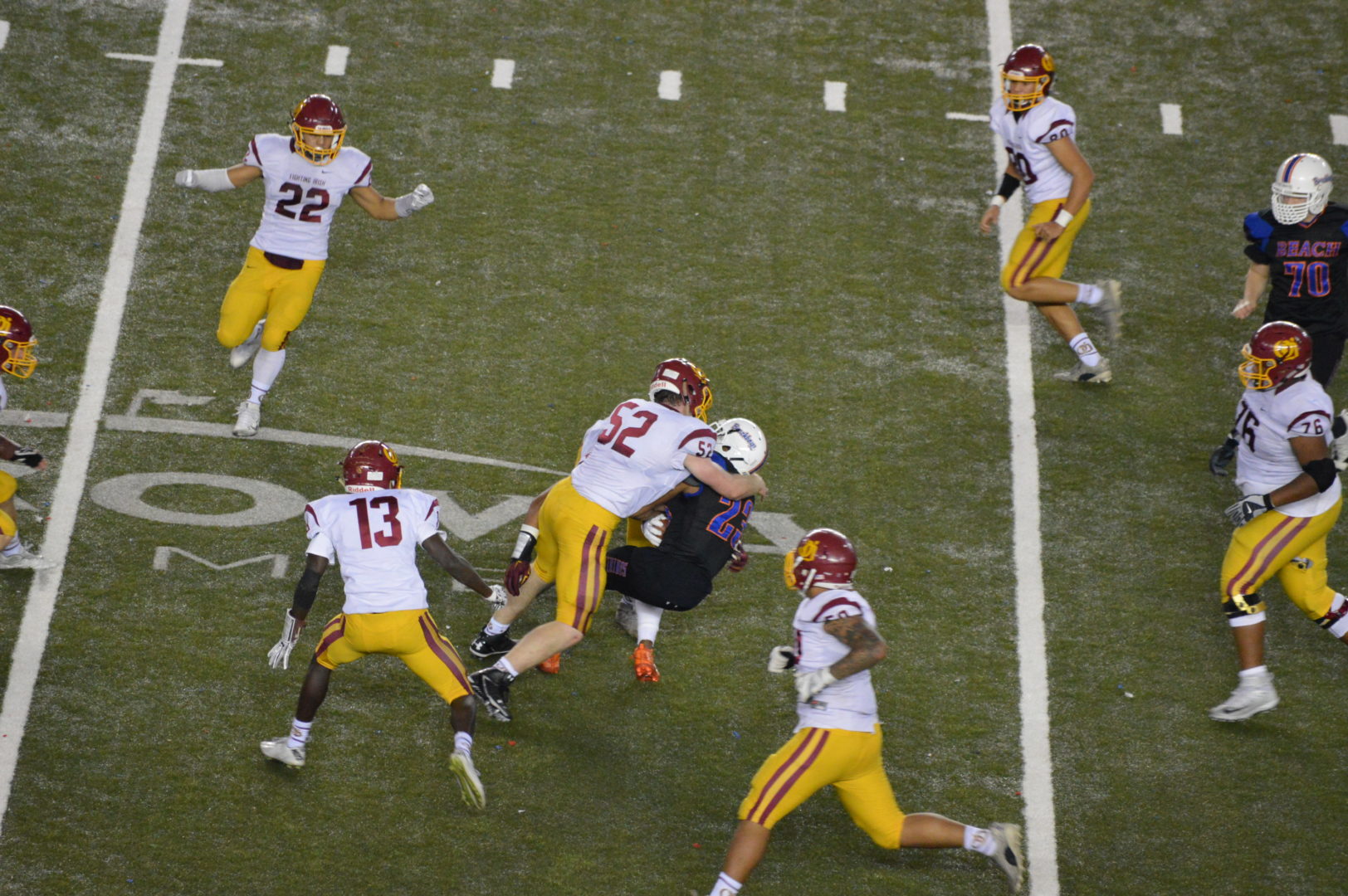 Beach may have had some of the jitters to begin with and fumbled away their 1st possession on the kick-off which O’Dea’s Thomas Shorack recovered on the Beach 36. The Irish would take 10 plays to go just 36 yards but Jamyn Patu finished it off with a nice 16-yard run, Stephen Powell added the PAT and it was 7-0 mid-way through the 1st.