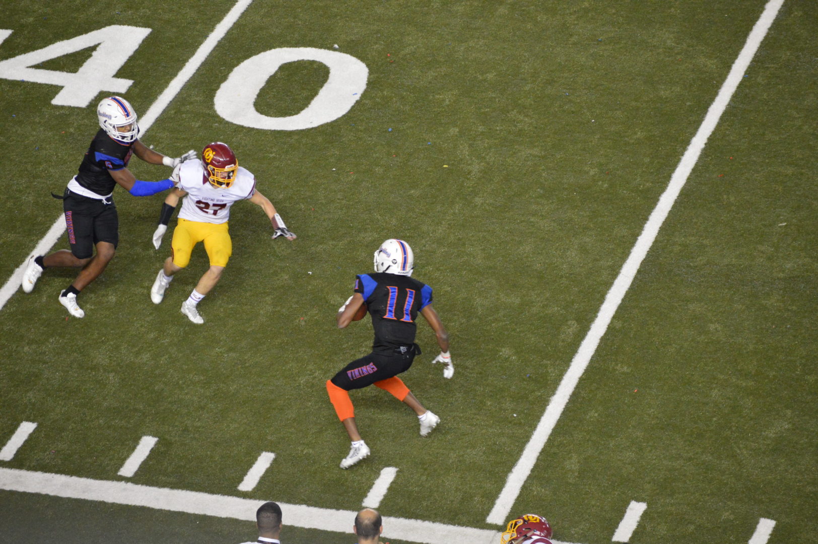 The Vikings best drive of the half began on their own 40 and was propelled on a great pass from QB Max Nall to Freddie Roberso on a 42-yard connection down to the O’Dea 11. However, the Irish defense stiffened and forced the Vikings to try a 24-yard field goal attempt which Mohamed Ibrahim connected on making it 14-3 with 6:30 to play in the half.