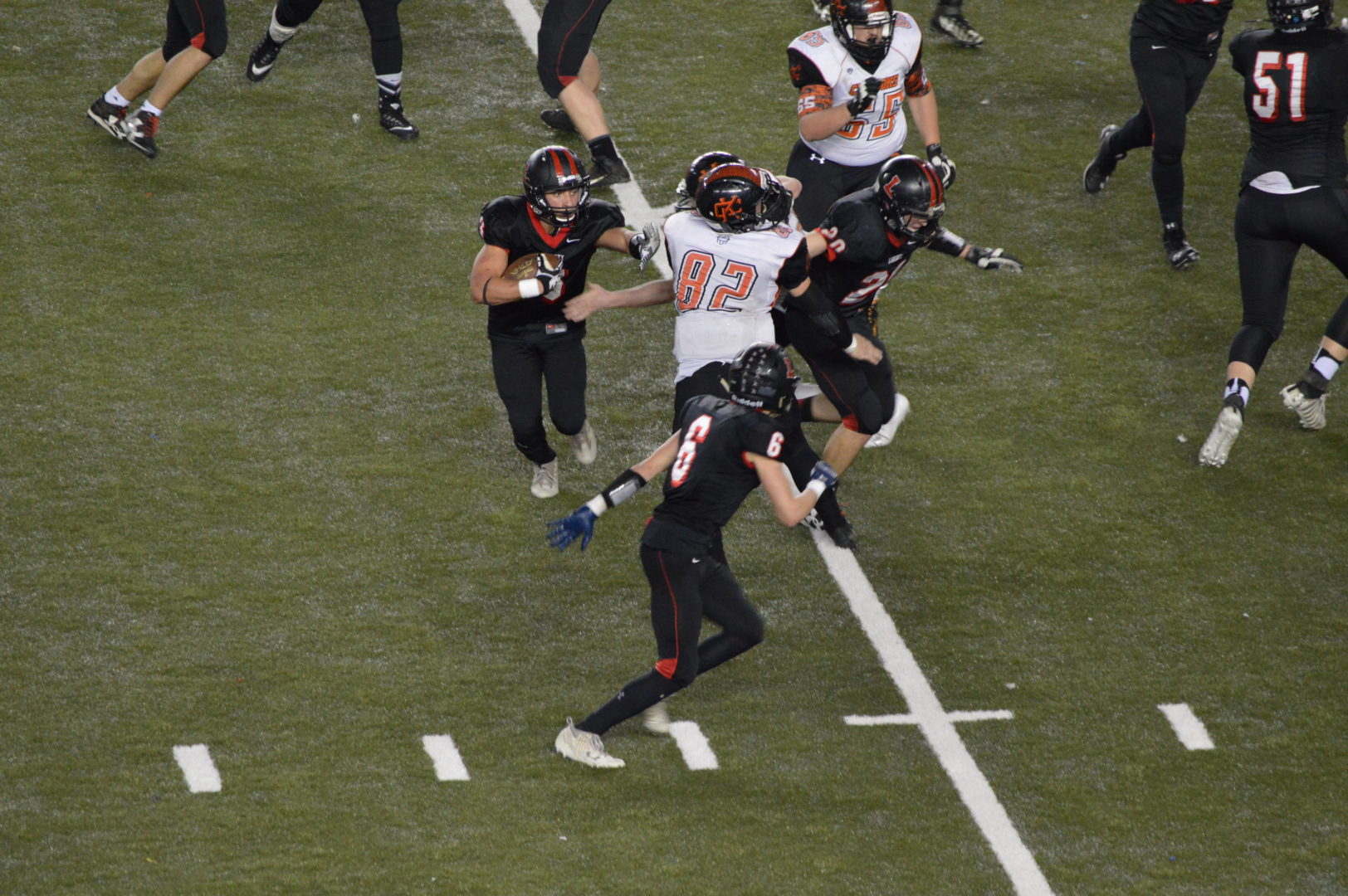 After the opening kickoff, Tumwater moved 64 yards in five plays to take a 7-0 lead. Sophomore running back Dylan Paine, who finished the day with 112 yards rushing bringing him to 1.810 for the season, carried for 45 yards on the first play. Zane Murphy got the score, cutting a sweep short into the end zone from 10 yards away.
