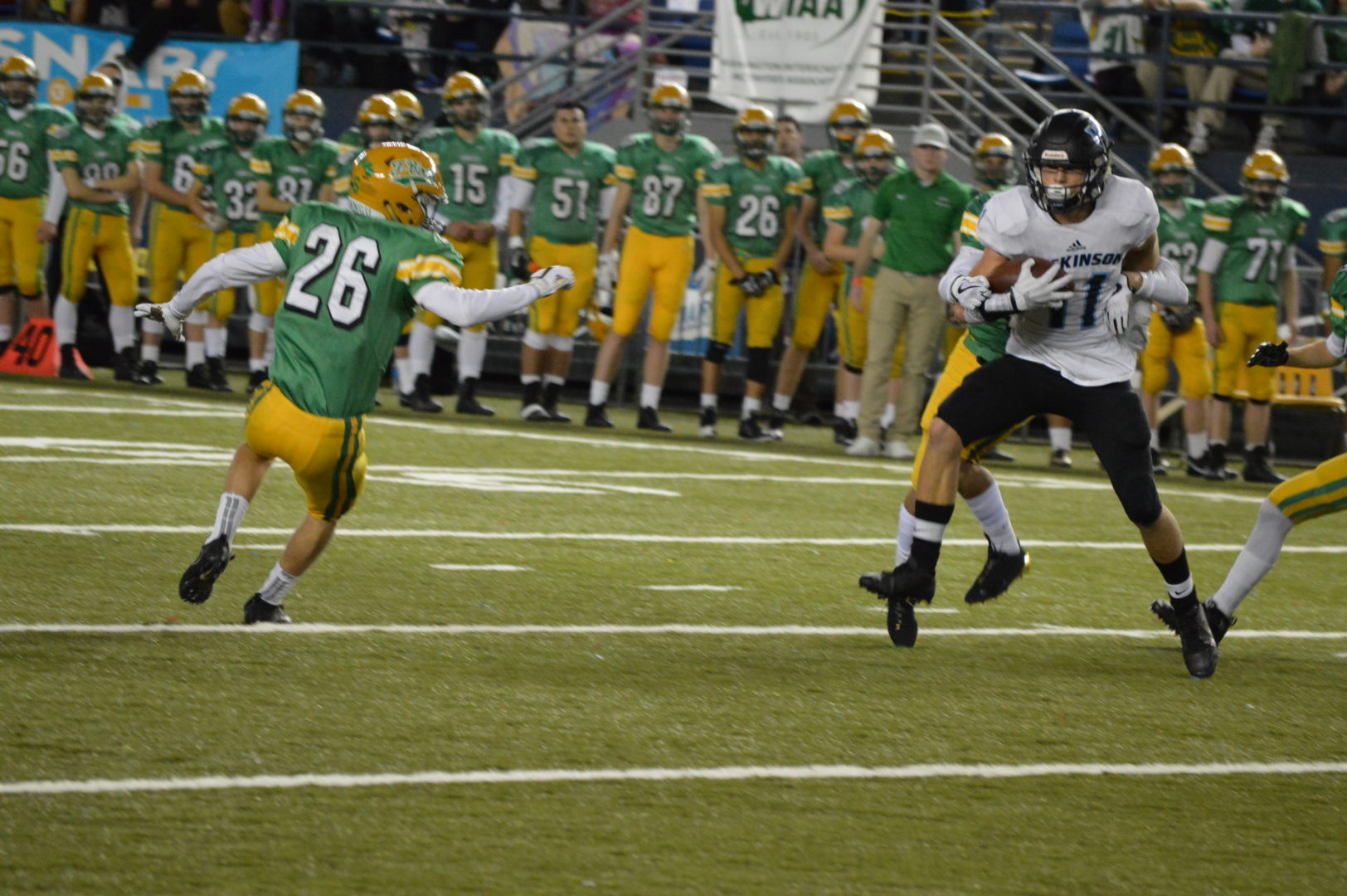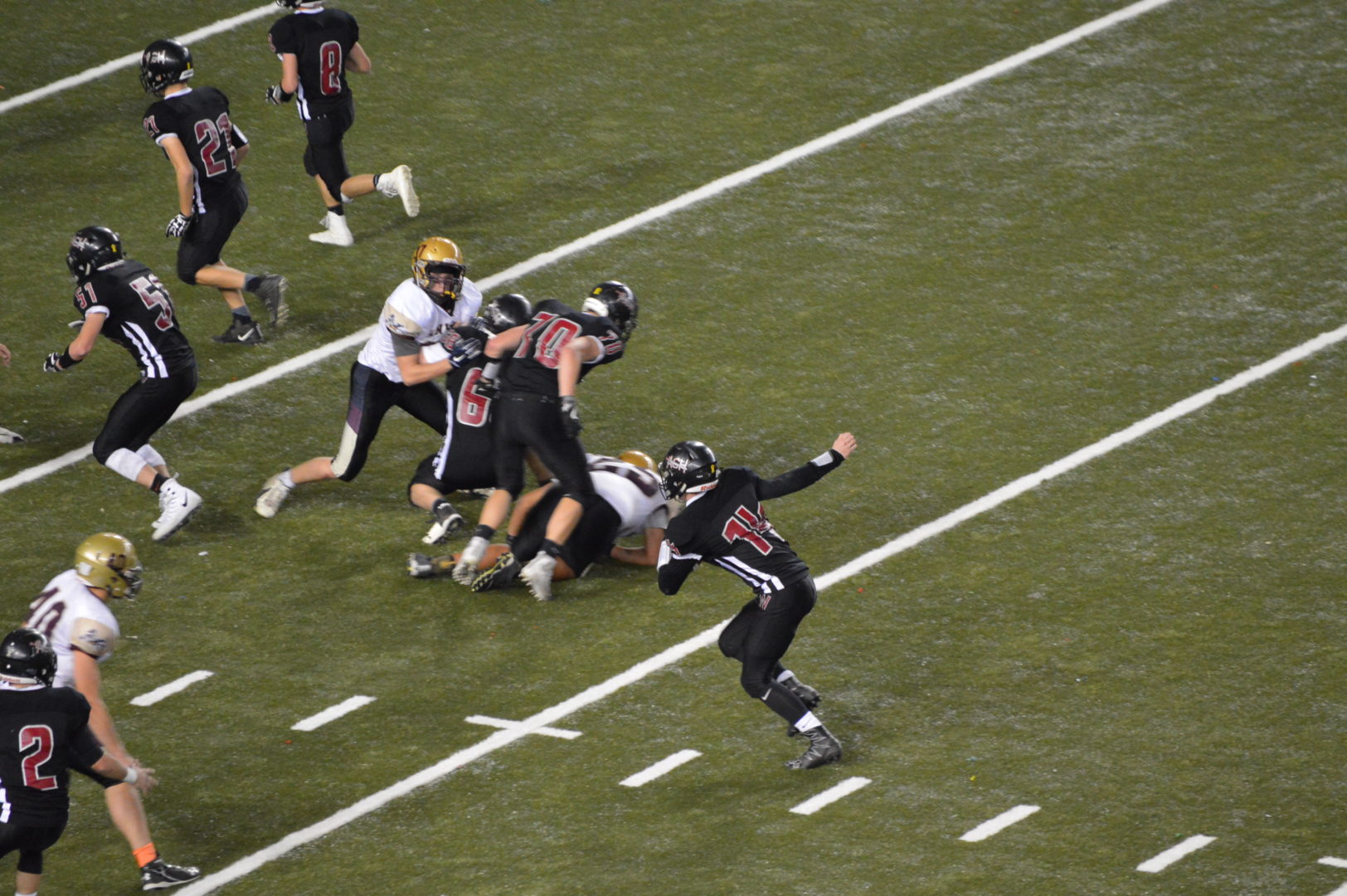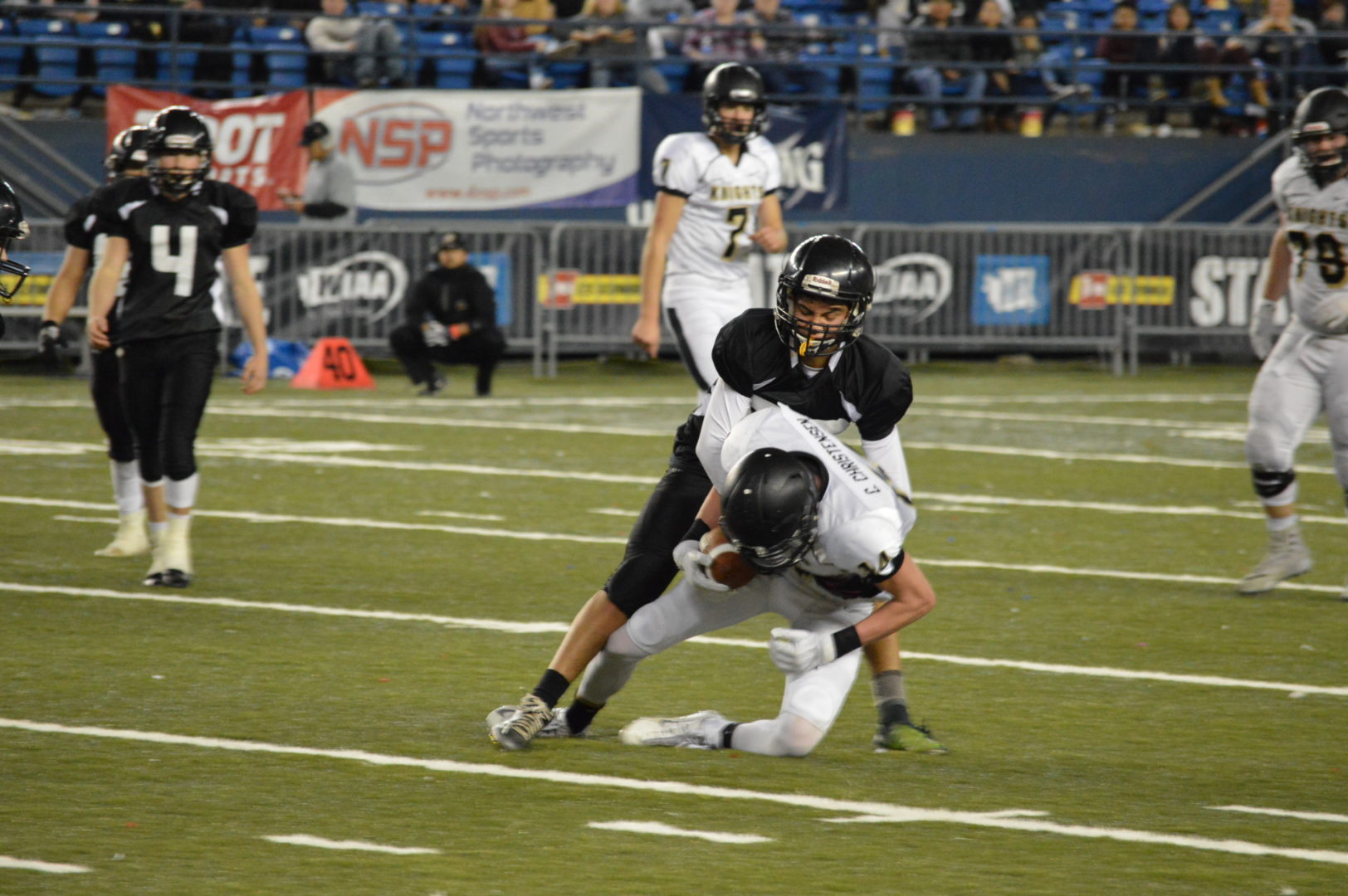 The Warriors struck a telling blow, chewing up seven minutes of the second quarter on a marathon drive that featured 17 plays from scrimmage and four penalties to score from midfield after a Sunnyside onside kick. Gage Burchill caught a six-yard pass from Isaak to put ACH up 34-14. With most of its players going both ways, the lengthy stint on defense may have taken an emotional toll on the Knights, though they would go on to tally 46 more points of their own.