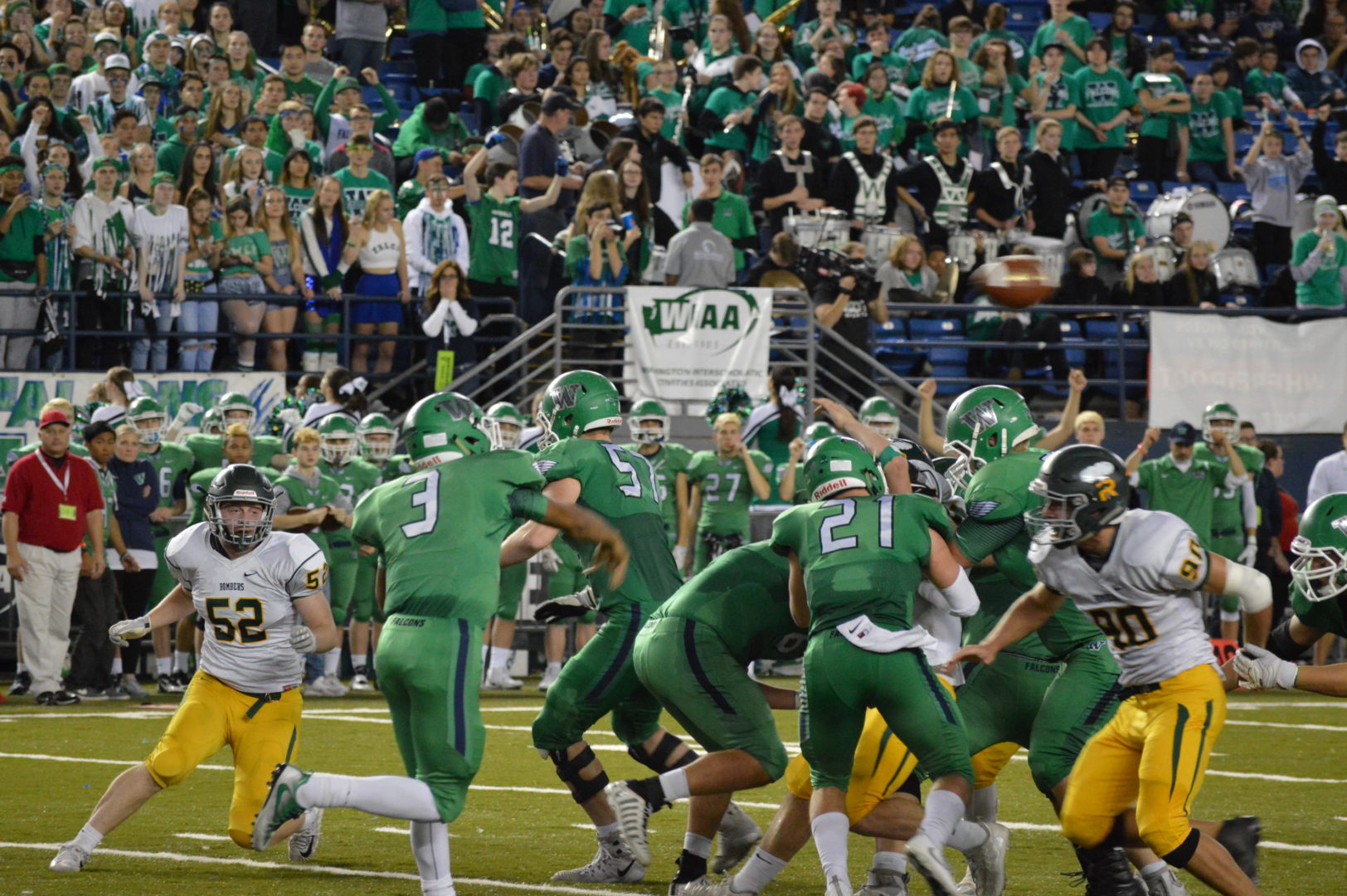 Woodinville would make it interesting and made it a 1-score game with more than 3 minutes to play when Sheffey took it upon himself to get it done running it in from the 9 and it was 28-21. The Falcons needed to get the ball back and and did just that forcing yet another 2nd half Bomber punt and the Falcons had it on their own 20 with 2:11 left to play. But Richland did not waste the huge 28 point lead they built and on a 4th and 11 it was that guy Weisenfels who came up big again with another pick to end the game.