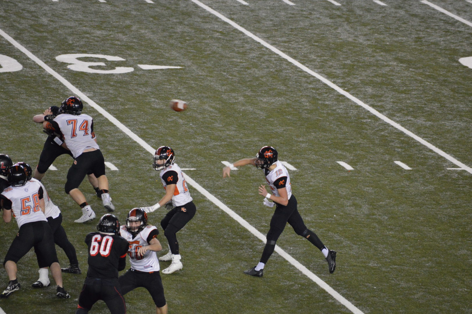 This was the only score of the 1st quarter but set in motion a game long tit for tat exchange of possessions and scoring. Meridian took the ball on their own 35 after an out of bounds kick and put together an impressive drive of their own going the 65 yards in 13 play in a little over 4 minutes and finishing it off with a TD pass from Simon Burkett to Bryce VandenHaak, Taylor Snook kicked the PAT and it was tied 7-7.
