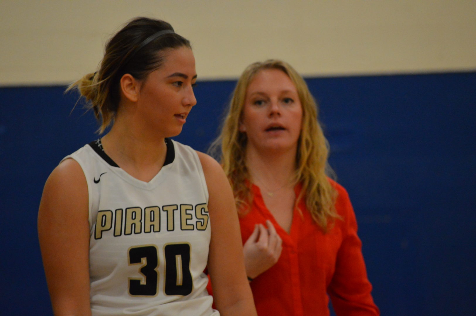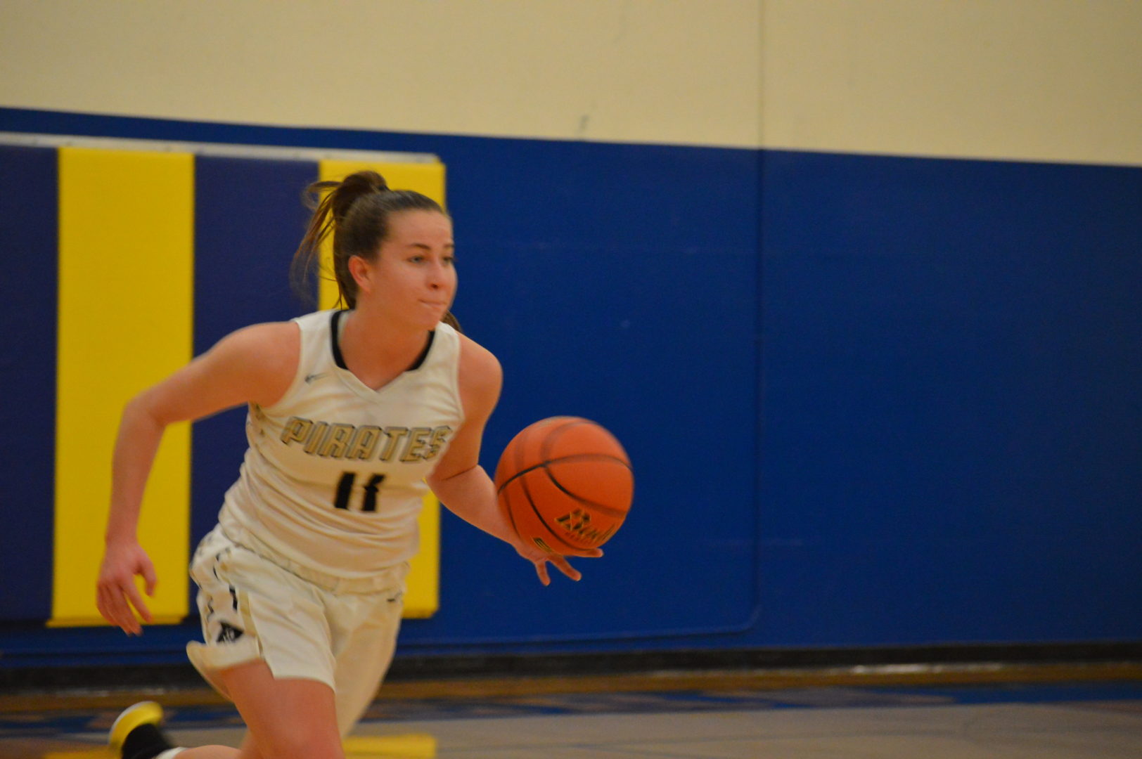 Well in fact they did not get off to a fast start and the Pirates were turning in a gutsy performance leading through most of the 1st half and taking a 31-30 lead to the break. Ashlynne Sharp led the Pirates with 9 and Kayla Alvarez had 8 including 2 long balls. Jamellia Clark was a force inside and scored 6 of her 14 in the 1st and was limited after picking up her 2nd foul.