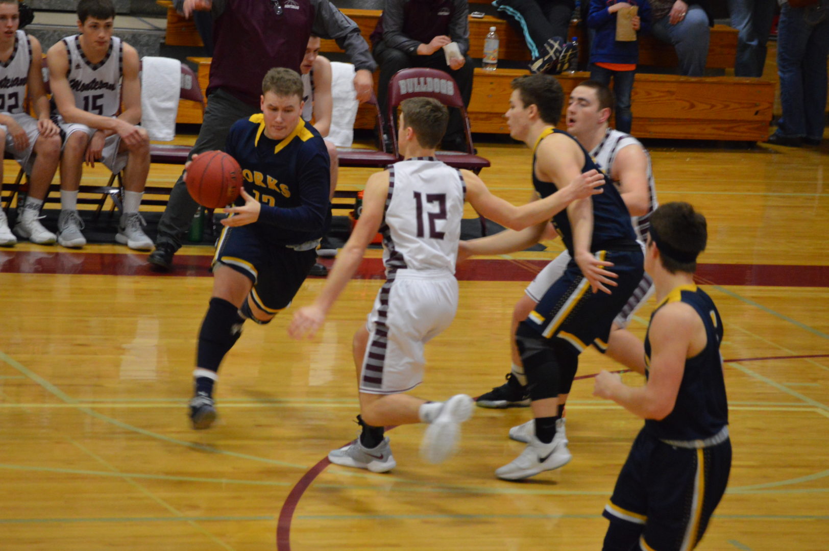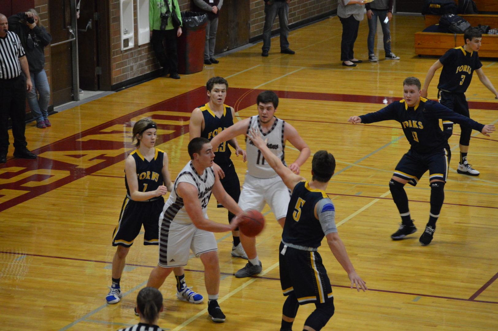This was the match-up that grabbed all the attention with 1st place and likely the league title and #1 District seed on the line and it began like a title match is supposed to start but after the first 5 minutes it was all Bulldogs. The 2 teams traded hoops early on with both teams hitting a pair of free throws to get on the board. Braton Armas doing it for Forks and then hitting a field goal for the 1st 4 points. Little did Armas know that would be it for him. Cort Prose would step up and hit a pair of 3’s his 2nd one with 3-minutes to play to give the Spartans a 3-point lead.