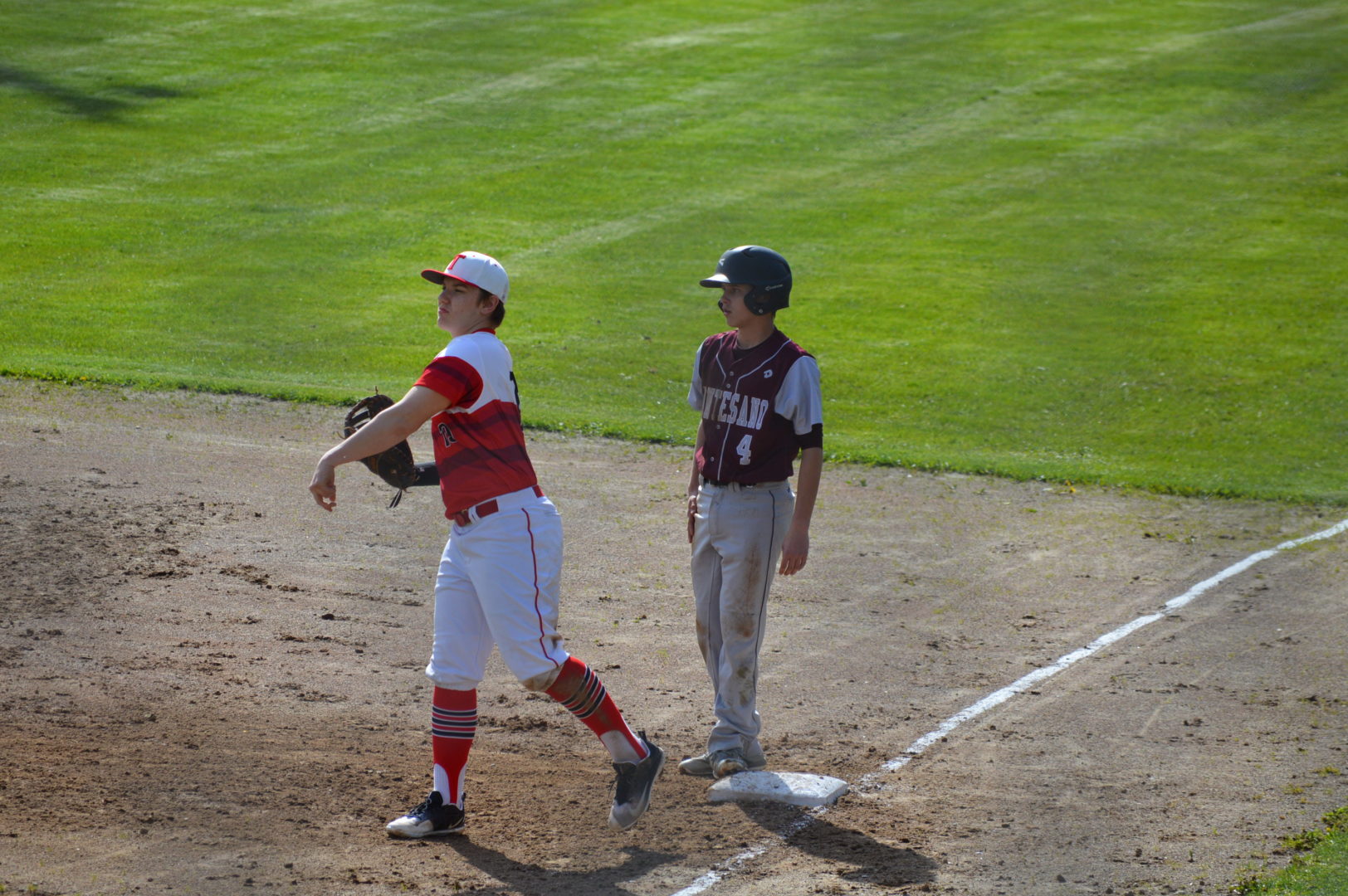 Tenino would tie the game in the top of the 4th when Montesano had a defensive melt-down committing 3 errors in the inning. Logan Brewer got on base on an error and stole 2nd. After a fly-out Jace Griffis got on 1st with error number 2 pushing Brewer to 3rd. Karl Hisaw then hit a comebacker to Bates but Brewer took off and got into a run down when the 2nd throw to catcher Parker Plato went over his head and Brewer scored the unearned run.