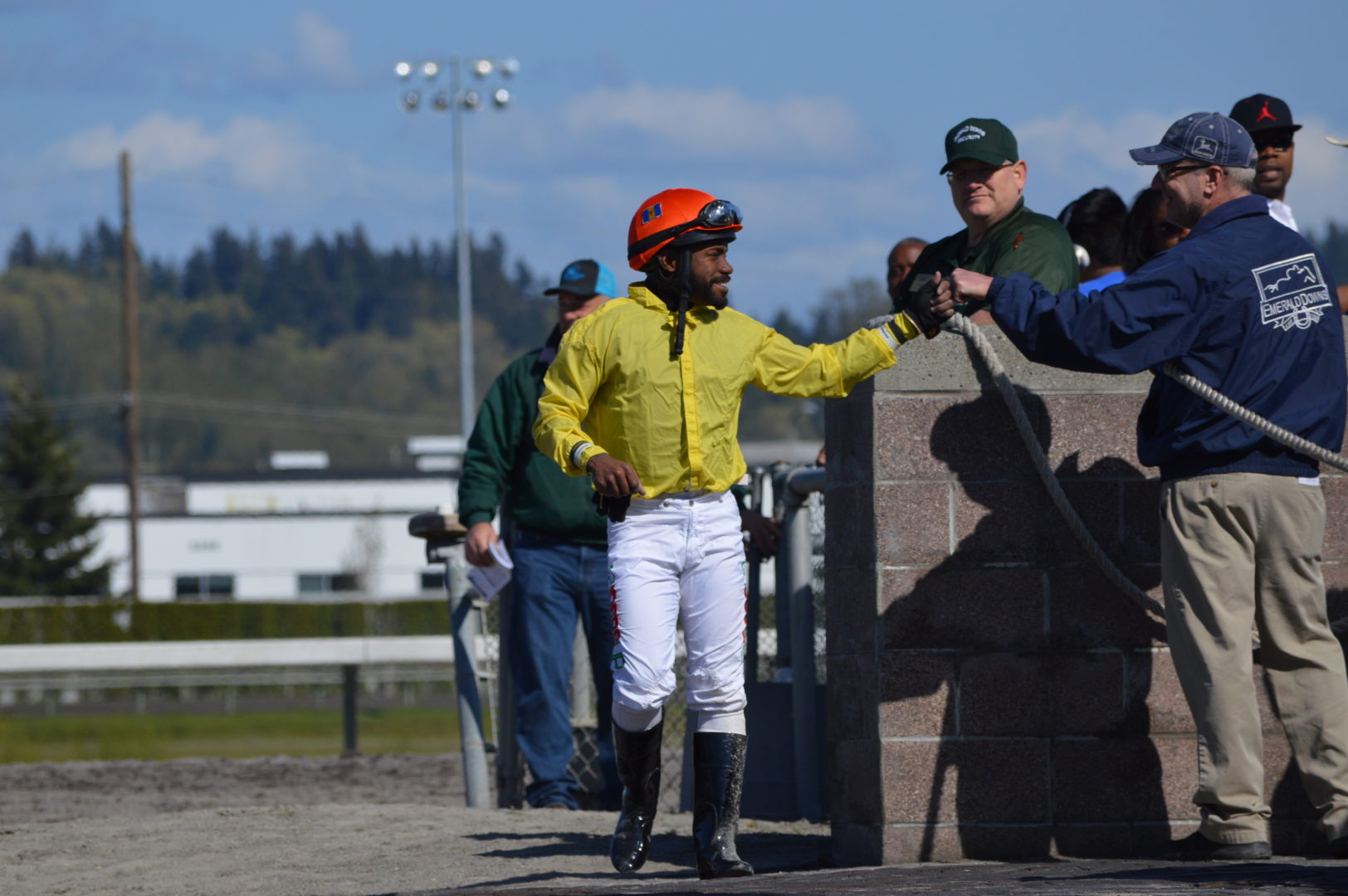 *Some were surprised to see the twice defending jockey Champion Rocco Bowen back at Emerald Downs after announcing last fall he was going to stay in California and ride at Golden Gate and maybe southern Cal. Bowen was having a hard time getting any big momentum behind him and decided to come back to Emerald and quickly showed it was a great move winning 4 races on the opening 10-race card. Bowen got things started guiding 1-9 shot Wine At Nine to an easy win in the 4th, then completed the daily double with Rojo Bou Peep in the 5th returning $4 and the $1 Daily Double paying $2.40, then won the 6th with Soolaimon at 7-2 for an all Bowen Pick 3 that returned $6.90. Bowen got his 4th win in the 7th to finish his superfecta of wins returning $5.20 and this Pick 3 $16.45. The final of 3 straight Daily Doubles for Bowen paid $20.80.