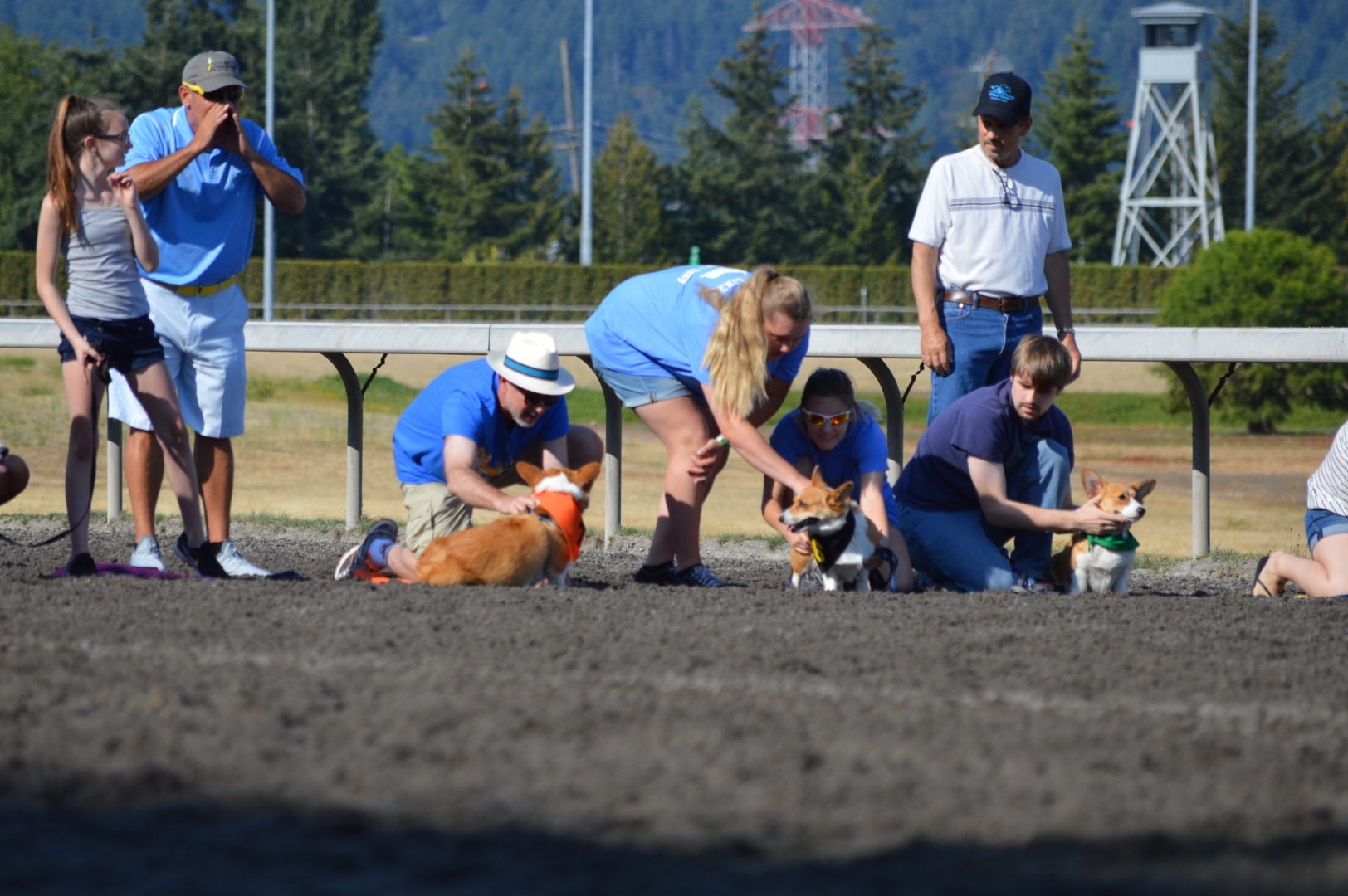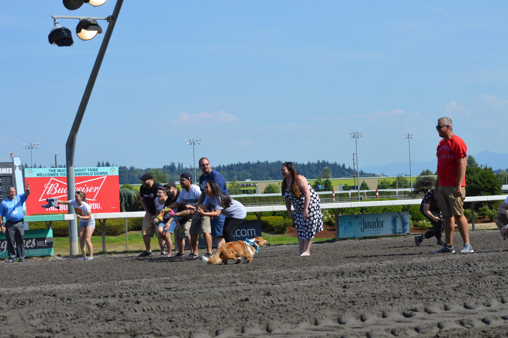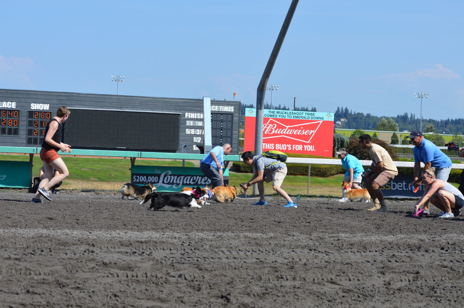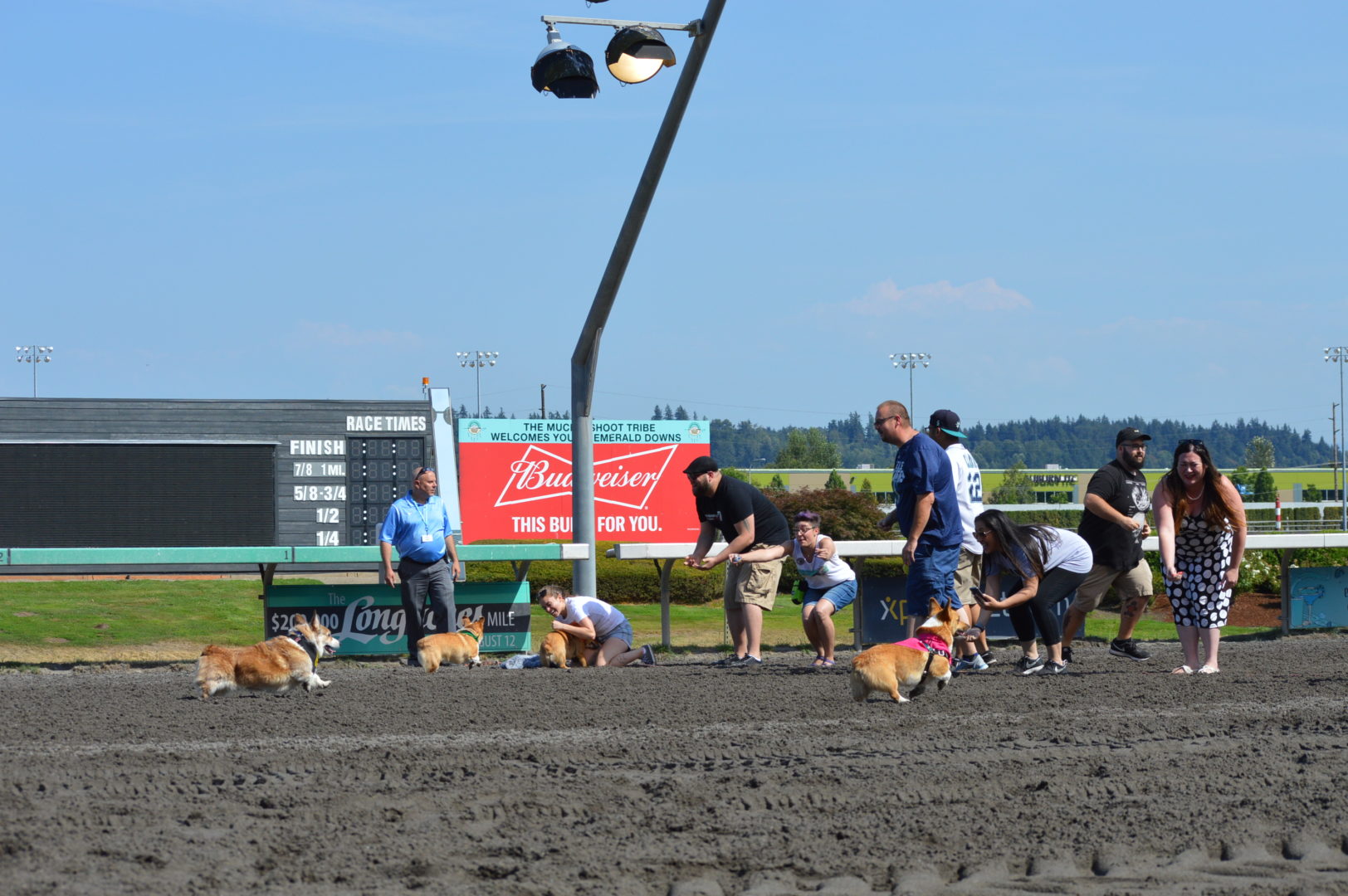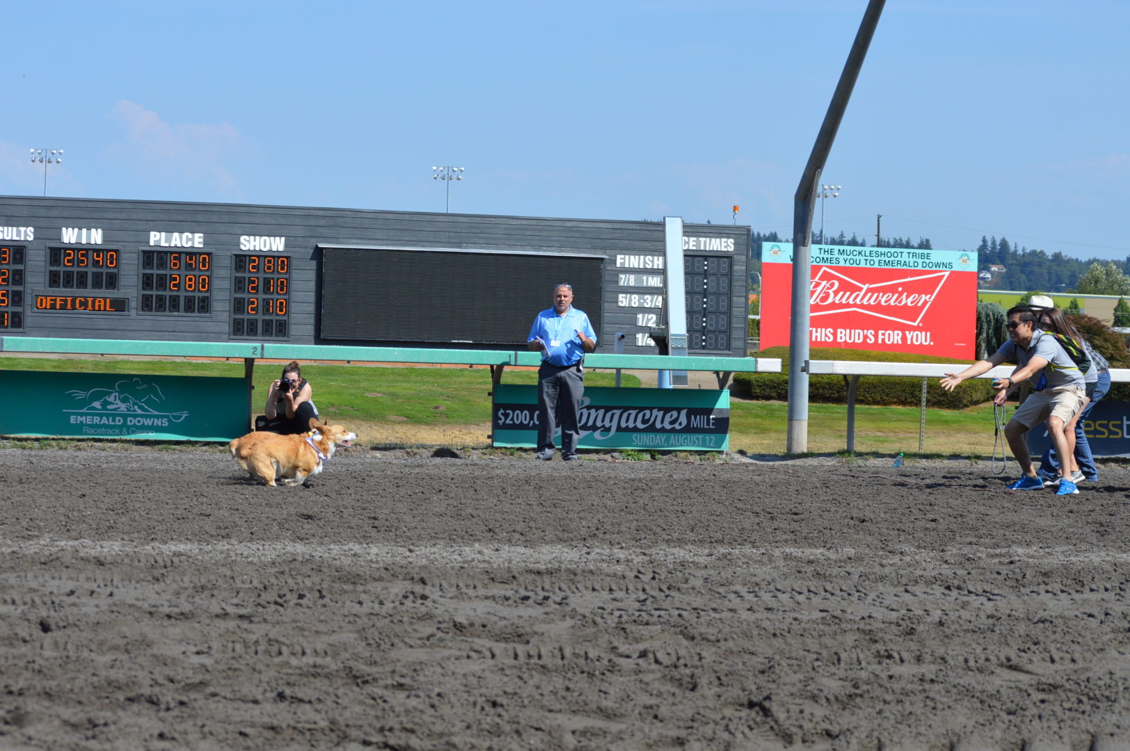 (Auburn, WA) The thundering hooves of the thoroughbreds attracts hundreds of thousands of fans each year to Emerald Downs but 1 day of the racing season it’s the pitter-patter of the Corgi’s short legs plowing through the dirt of the Auburn oval that draws huge crowds and this past Sunday was no exception. We are not sure how many people attended the races but all we knkow is that the parking lots were filled to capacity and it was difficult to move freely without accidentally bumping into someone in other words it was a massive crowd. The star attraction this day was that of the K-9 with 72 Corgi’s ready to do battle in the 1/32nd of a mile dash.