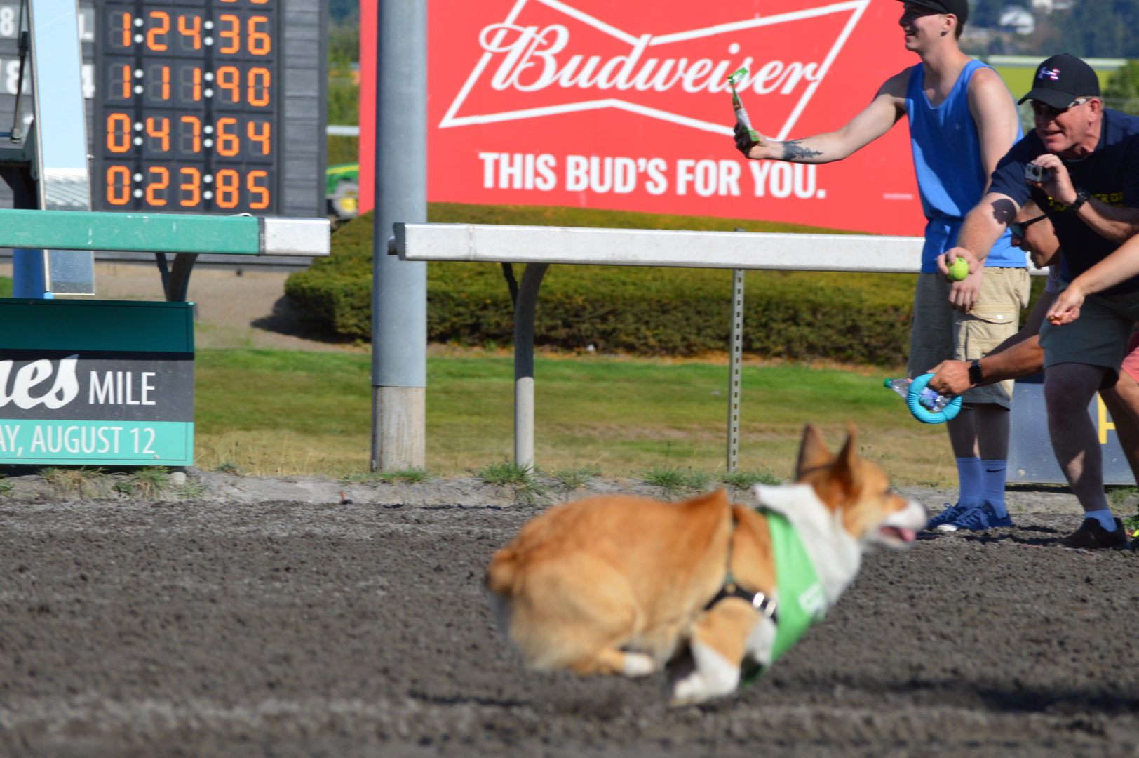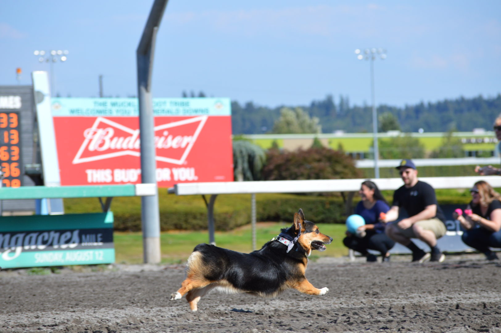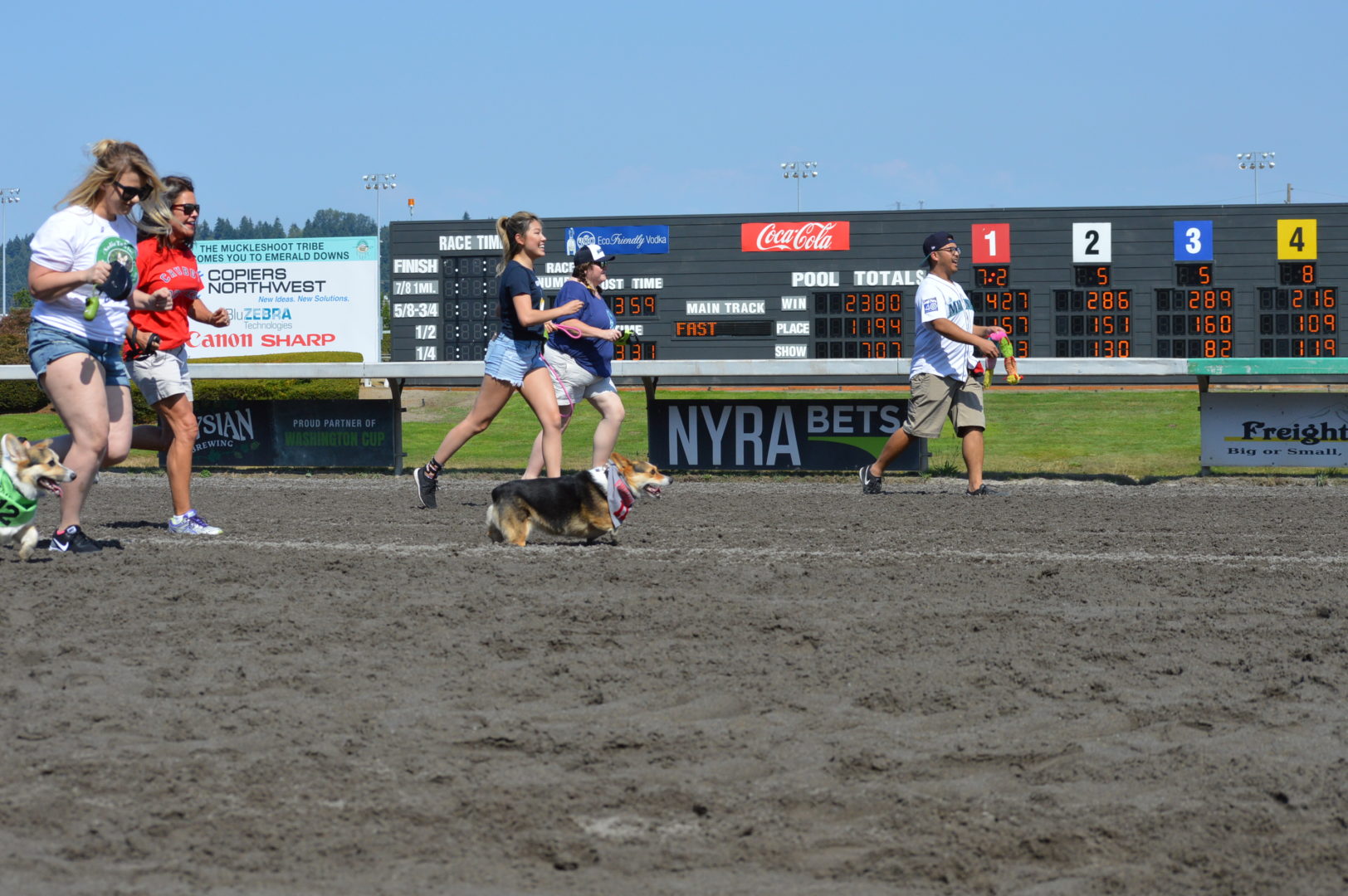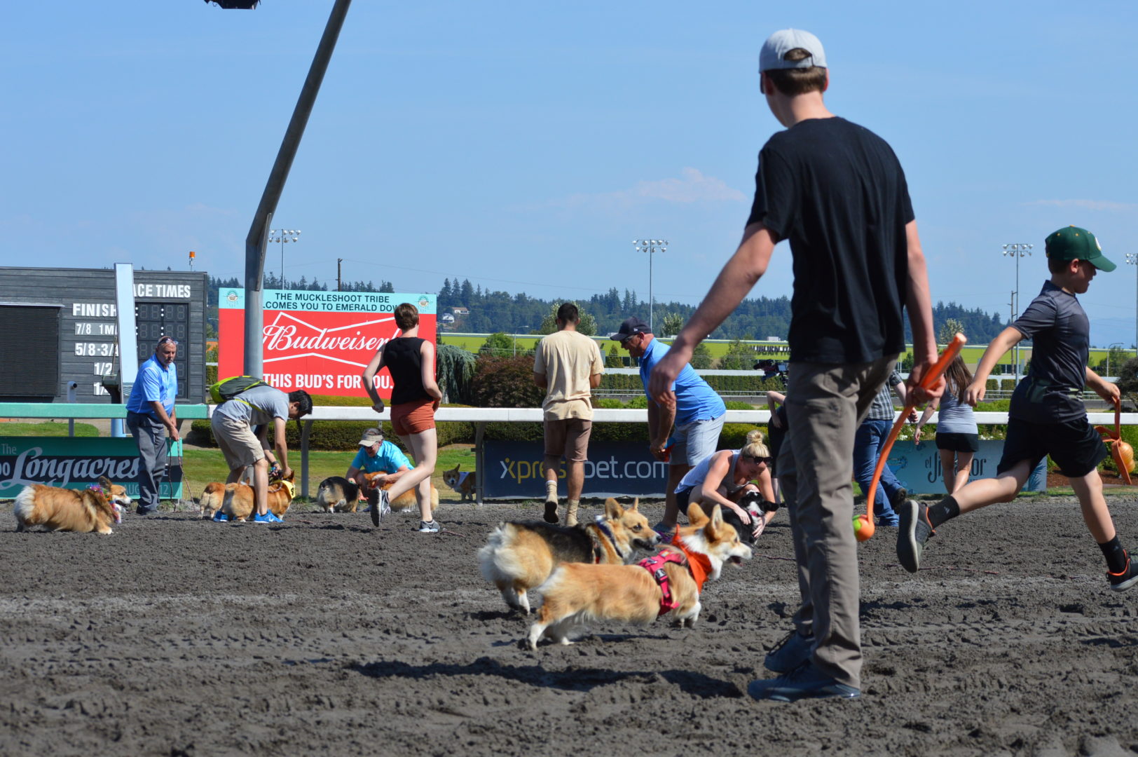 (Auburn, WA) The thundering hooves of the thoroughbreds attracts hundreds of thousands of fans each year to Emerald Downs but 1 day of the racing season it’s the pitter-patter of the Corgi’s short legs plowing through the dirt of the Auburn oval that draws huge crowds and this past Sunday was no exception. We are not sure how many people attended the races but all we knkow is that the parking lots were filled to capacity and it was difficult to move freely without accidentally bumping into someone in other words it was a massive crowd. The star attraction this day was that of the K-9 with 72 Corgi’s ready to do battle in the 1/32nd of a mile dash.