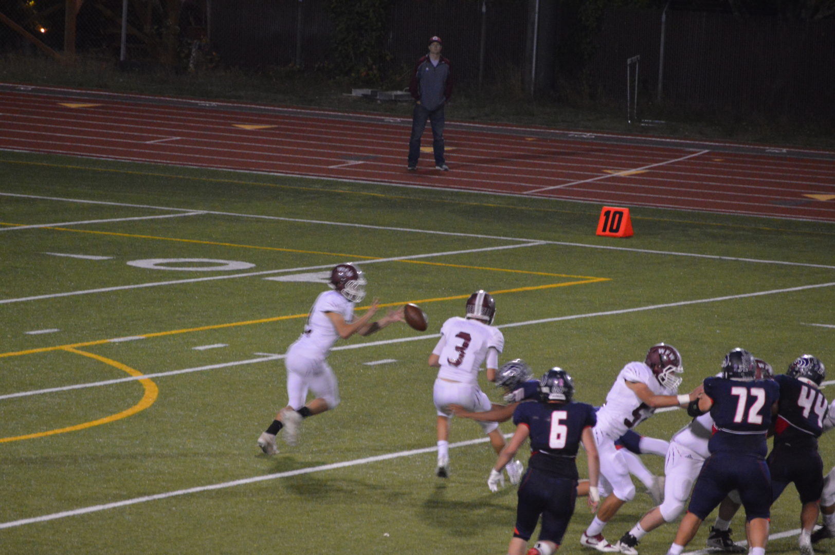 (Tumwater, WA) There was no bigger game in the EVCO 2A league opener than this one at Tumwater District Stadium. With 3 teams clearly at the top including WF West and Black Hills along with favorite Tumwater, this game could determine 2nd or even 1st place. The game featured a couple of scoring outbursts and great defense on both sides. After punting to Black Hills after the opening possession the Wolves took exactly 1 play to find the endzone when speedy Taylor Simmons hit the right edge after a great opening block sequence and was gone 80 yards. The PAT failed so Black Hills led 6-0.