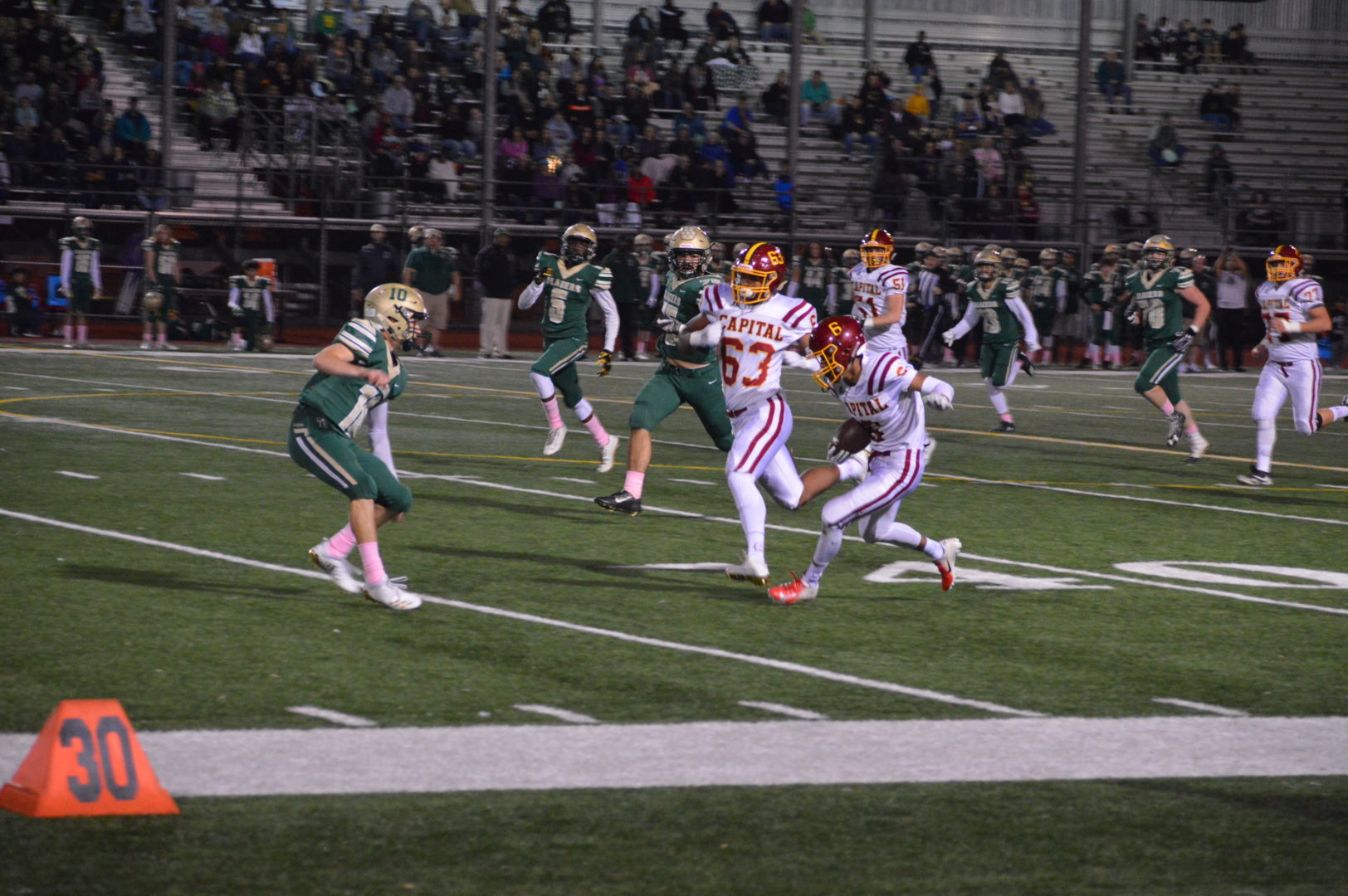 Capital answered 2 possessions later when they took over on their own 29 and after a big run by QB Grant Erickson and Scott Penner finished it off with an 11-yard run for the touchdown, Penner added the extra point and it was tied 7-7. The Cougars would then take the lead for the one and only time in this game early in the 2nd quarter, a ling run by Eric Jackson set up a 14-yard TD pass from Erickson to Penner to go up 14-0.