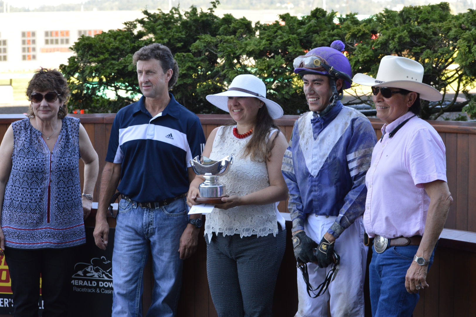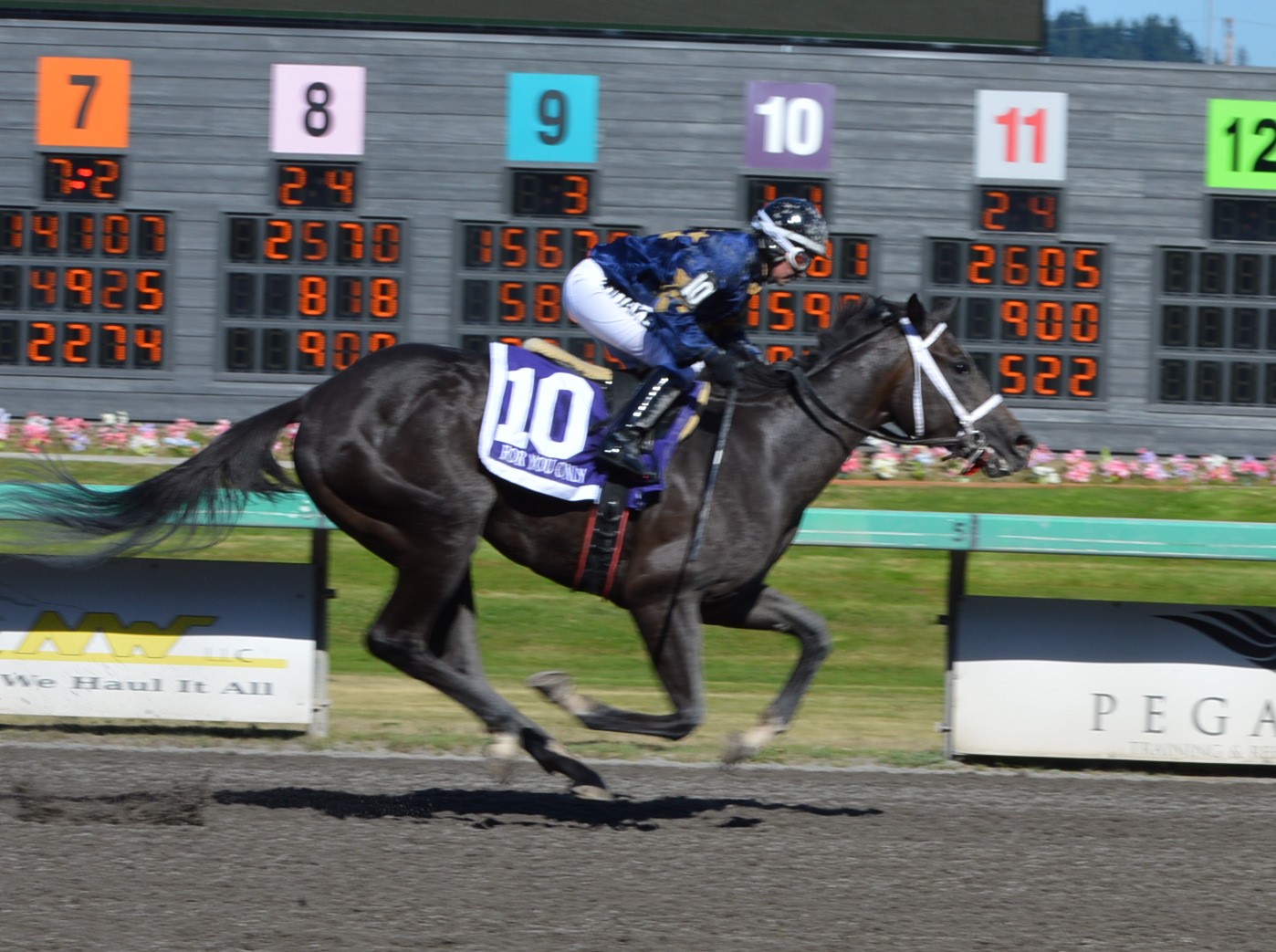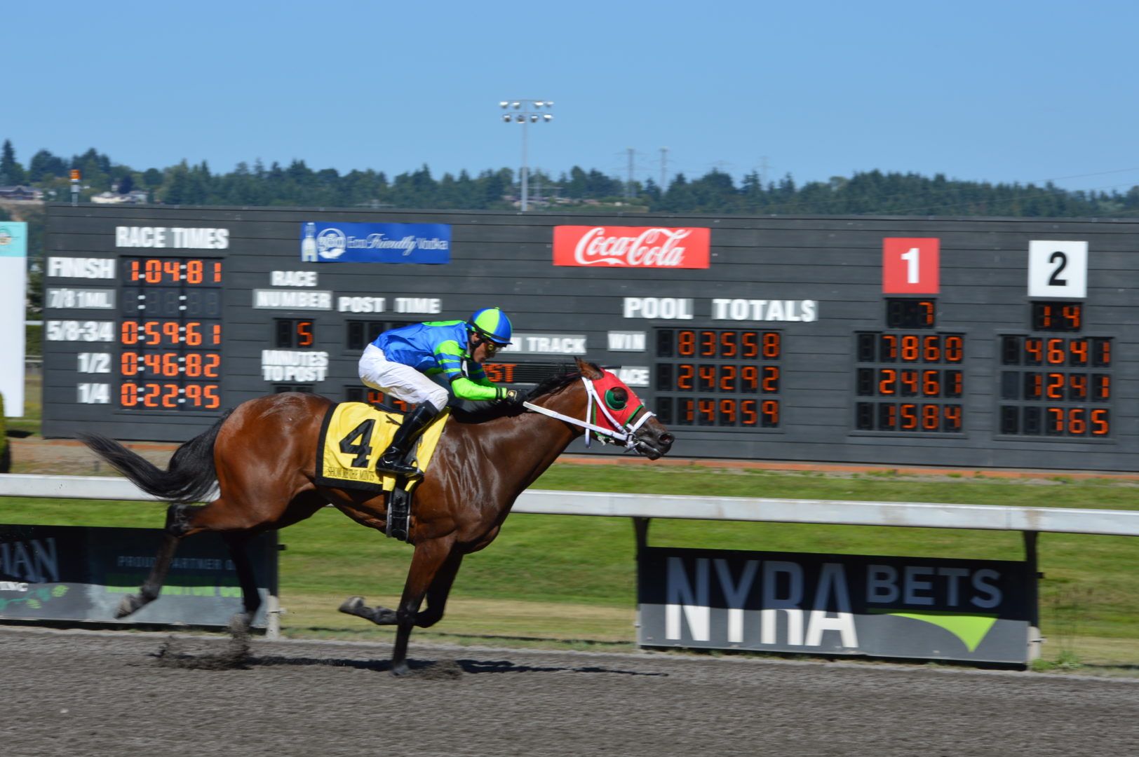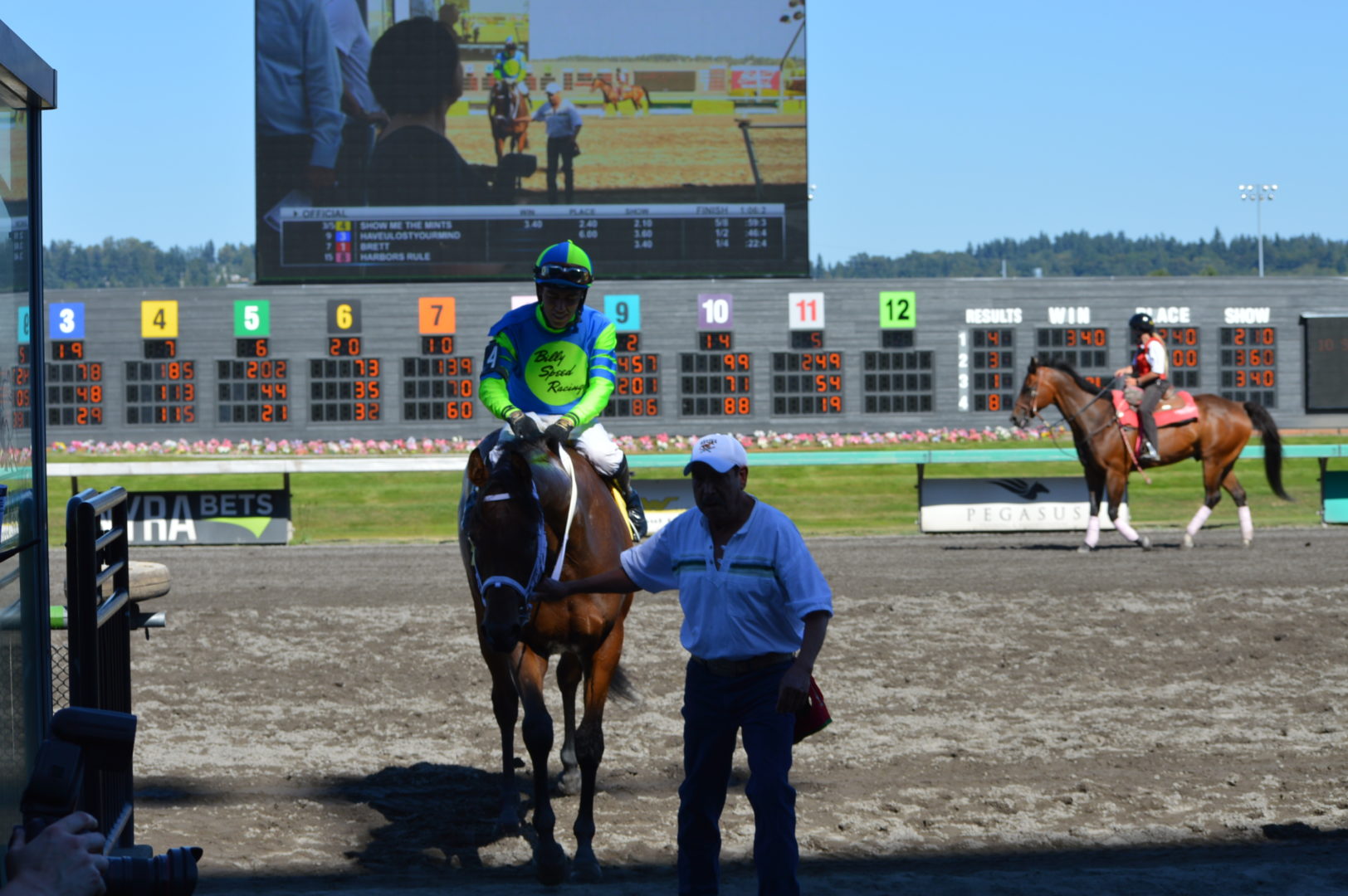 (Auburn, WA) The Mt Rainier Stakes was the crowning glory of this 4-Stakes race filled day. The 1 1/16 mile Mt Rainier was the final prep race for the August 11th Longacres Mile. The other 3 Stakes featured races for 2-year-old colts and geldings in the King County Express, 2-year-old fillies and mares competed in the Angie C and the girls also ran in the Boeing for 3-year-olds and up. Each race had a purse of $50,000 for a total of 200k in purse money distributed on the day. Below is a re-cap of each race with pictures and interviews from each race.
