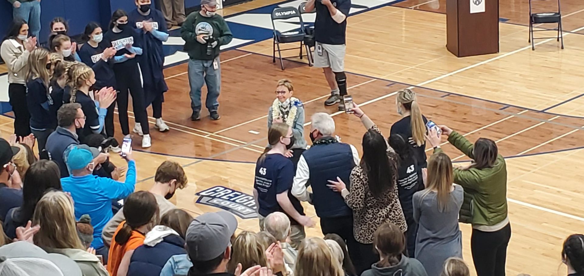 This past Saturday was the beginning of post-season madness with district tournaments in Volleyball and soccer and end of the season in football but on Saturday evening a simple little crosstown rivalry, non-league volleyball match between Capital and Olympia packed Olympia’s Chick Rockey Gymnasium. Bears Head Volleyball Coach Laurie Creighton was celebrated after coaching for 43 years. Creighton will step down as the 2nd winningest coach in state volleyball history with 864 trailing only Susan Doering with 904 at Colfax. Win #864 was Saturday night against the Cougars.