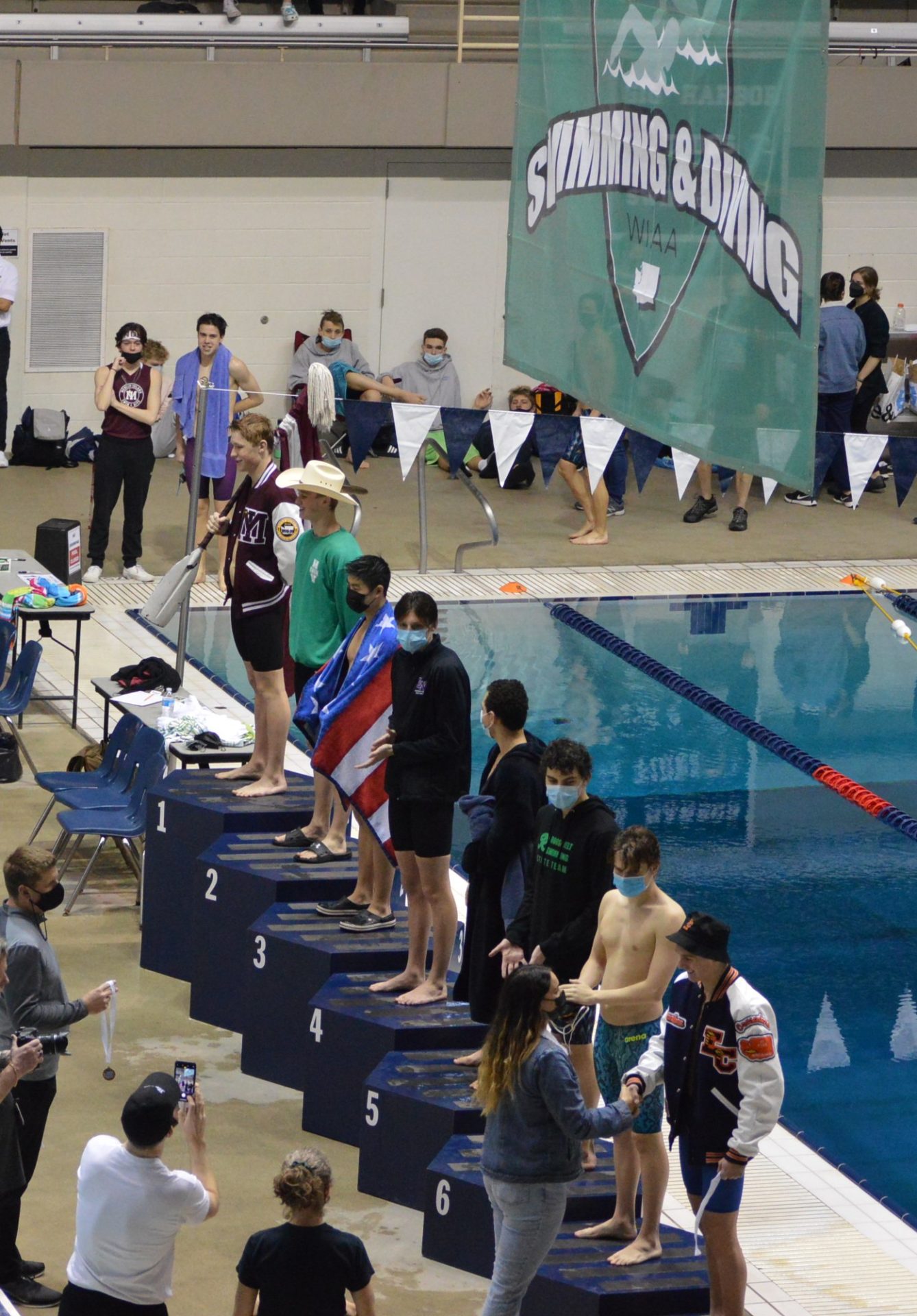 Mercer Island won the 200 Free relay with the same group except Colin Carmichael for Brandon Peterson. In the finale the 400 Free relay squad of Peterson, Evan Liu, Matt Williamson and Carmichael. The 4 put together an All America consideration time of 3:08.13. Mercer Island also picked up 3 other Gold medals with Jackson Winn taking both the 100 backstroke in 50.71 and then getting an All America consideration in the 100 free in a time of 45.81. Matt williamson won the other individual Gold in the 200 Free in a time of 1:41.08.