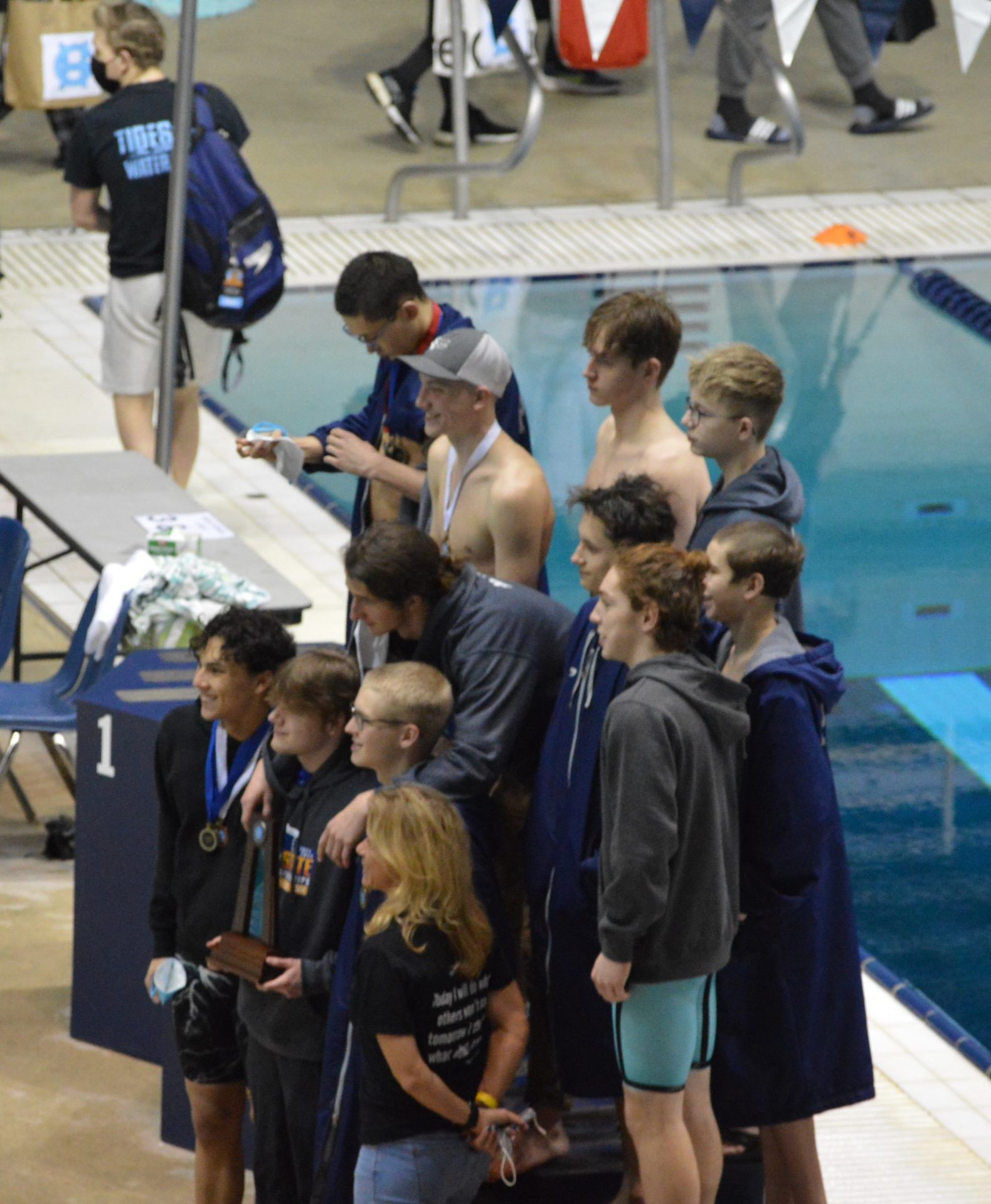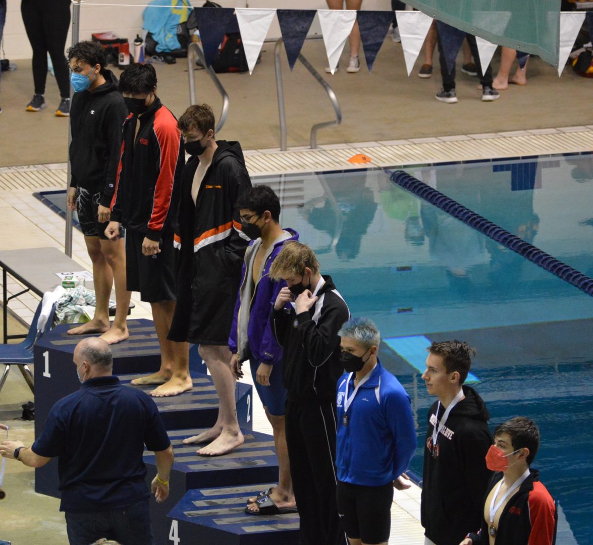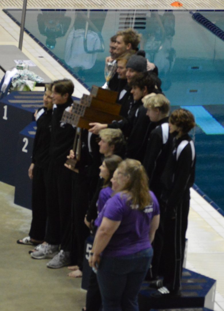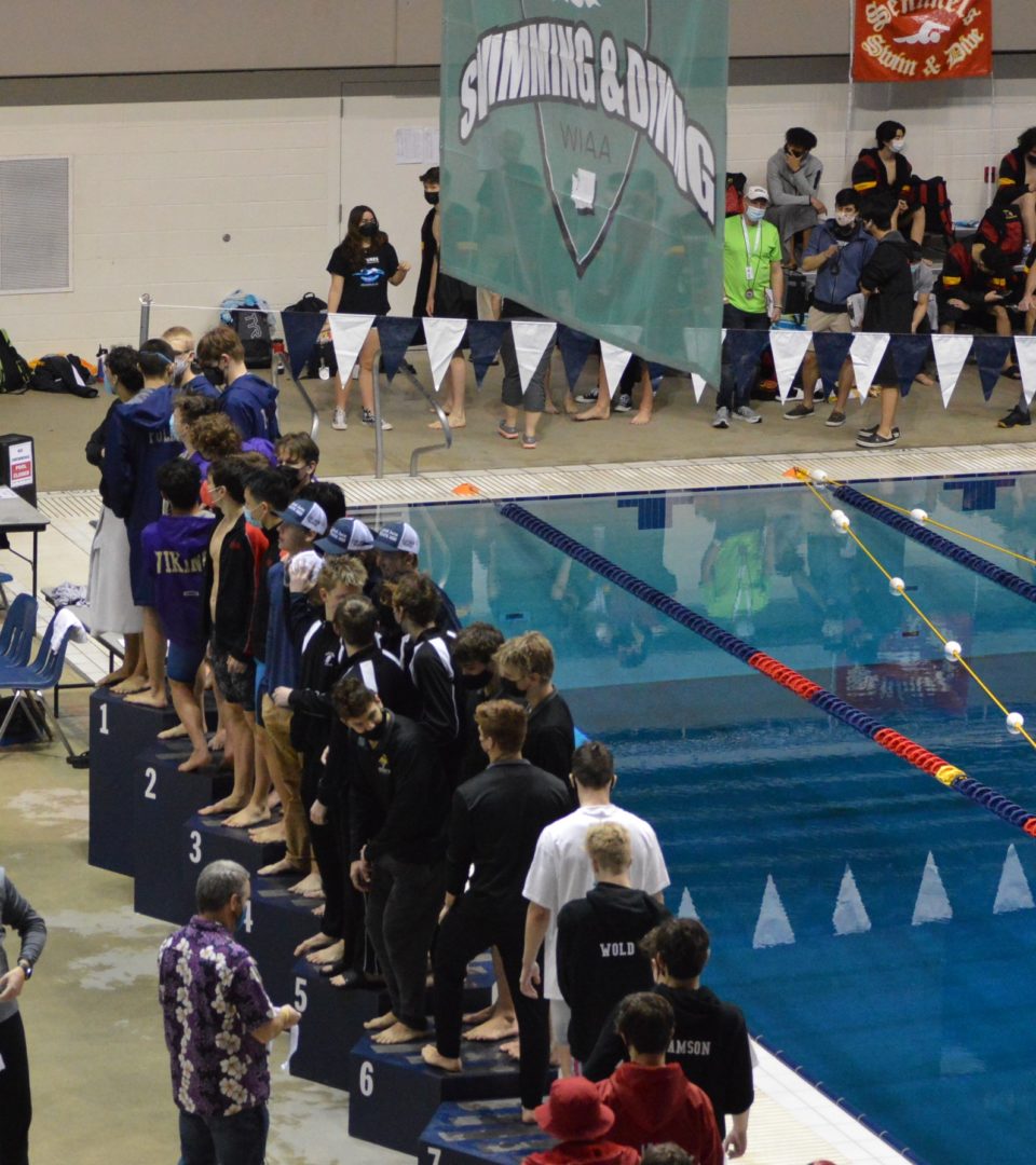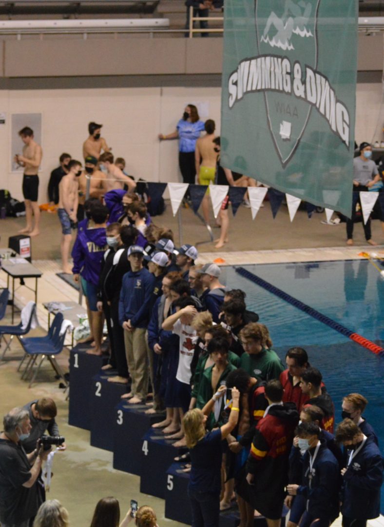 The Anacortes Seahawks won a tight battle for the State Championship on the strength of numbers in the swimming events and taking the top 2 spots in diving. Zephy Blee and Fletcher Olson finished 1-2 in diving and got some critical additional points from Sam Davis who finished 10th. Combined the Divers scored 44 points which was a huge factor in the Seahawks 280-271 win over Pullman. North Kitsap wasn’t far behind scoring 230.