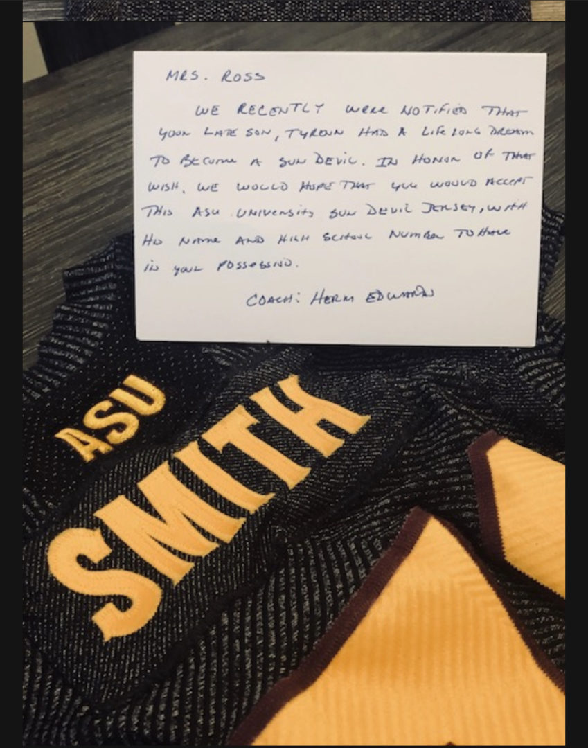 It took a couple of months but we got an e-mail from Kentwood Head Football coach Michael Bush and shared pictures of what Coach Edwards and ASU did for Tyrenn’s Mom. They had an ASU jersey made with his number and name on it plus a hand-written note from Coach Edwards.