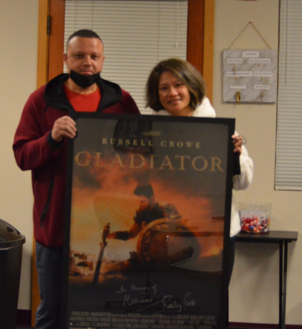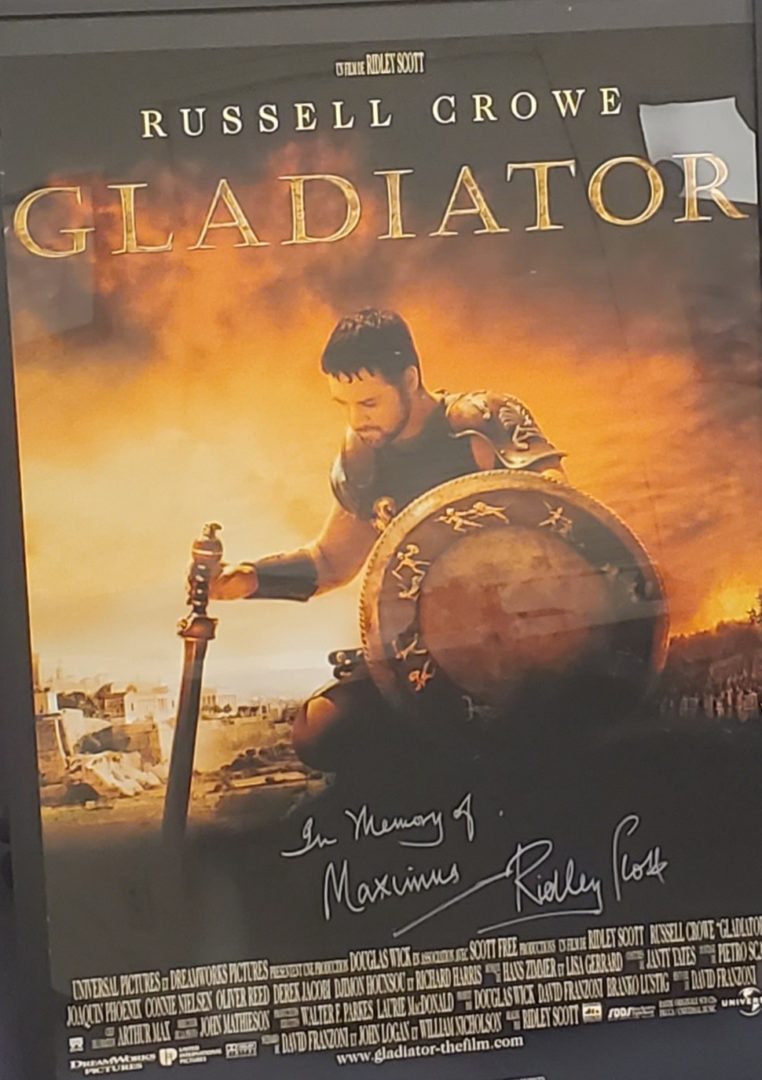 Yes we were looking at a theater poster of the 2001 Academy Award winning Best Picture, Best Actor and Best Director along with 9 other Academy awards and the Oscar winning director Ridley Scott had taken time to listen to Max’s story and then signed the poster for Max’s family. Stephanie said this would have happened much sooner but Scott had been on location shooting a movie and it was a closed set because of the Covid precautions.