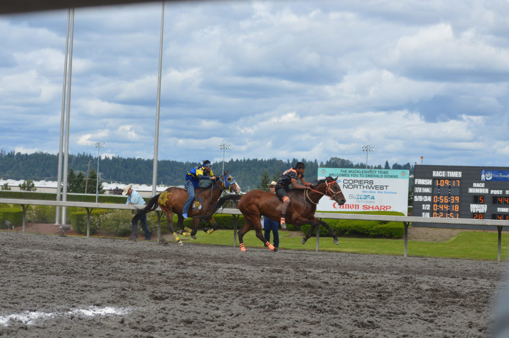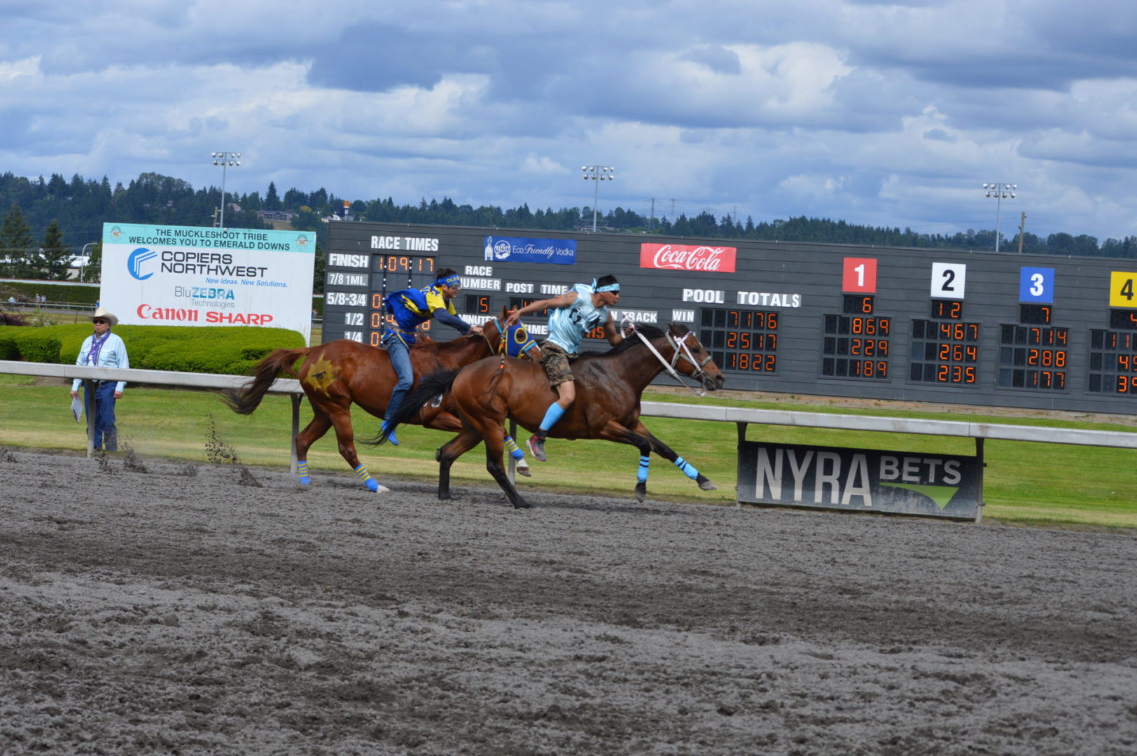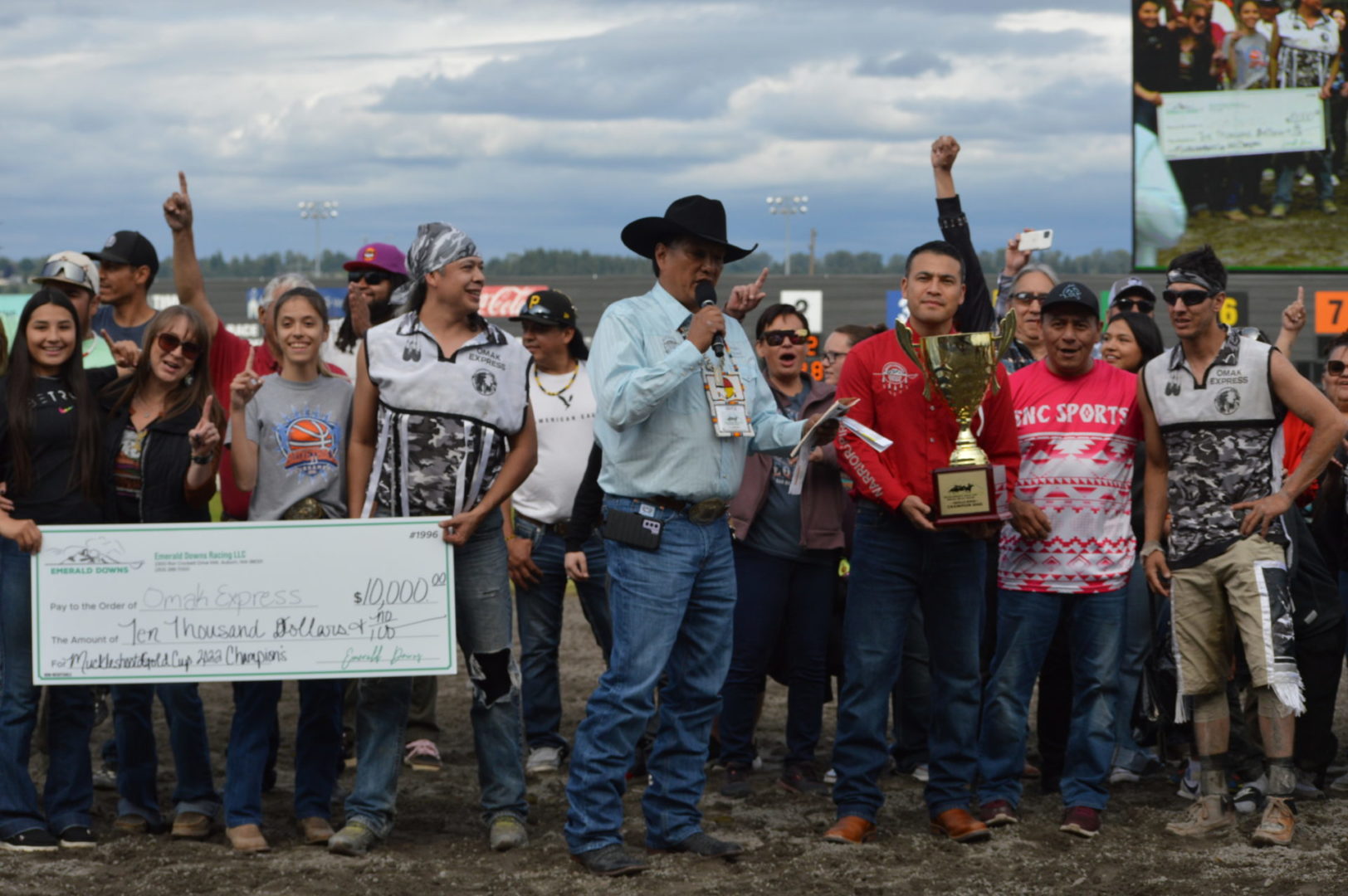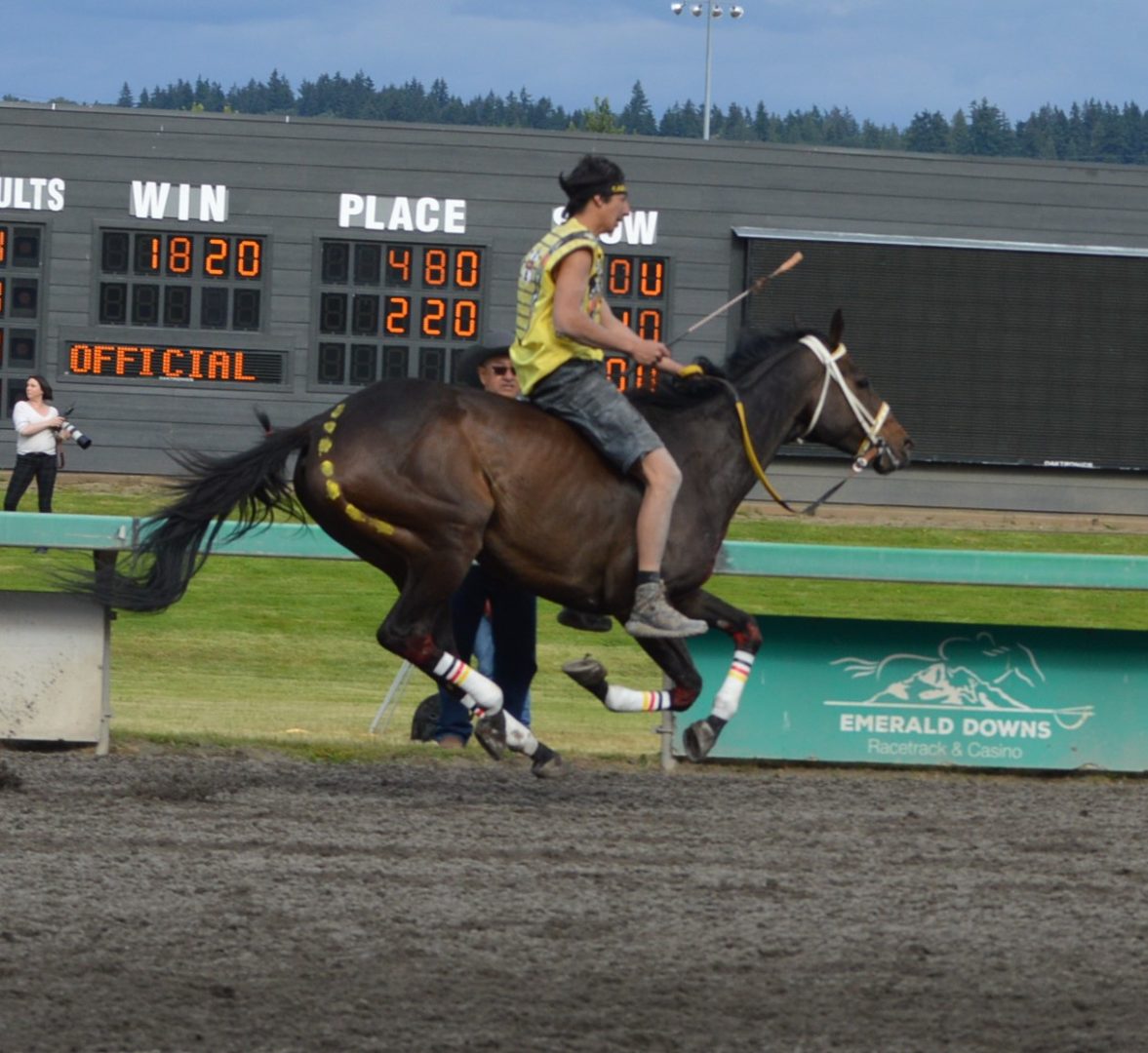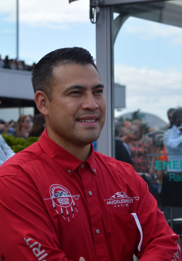 “It’s a great mix of celebrating our past with the competition of current day” said Muckleshoot Tribal Chairman Jaison Elkins as he and his family were on hand to take in Championship Sunday of the $65,000 Muckleshoot Gold Cup Indian Relays at Emerald Downs and it lived up to its billing with 2 outstanding consolation races and a spectacular Championship finale along with traditional dance and music of the Muckleshoot tribe.