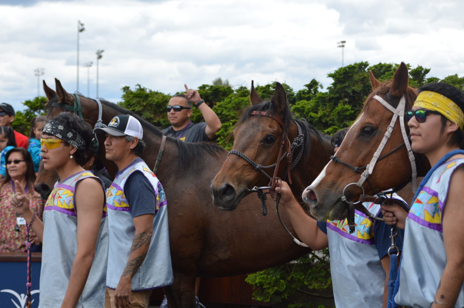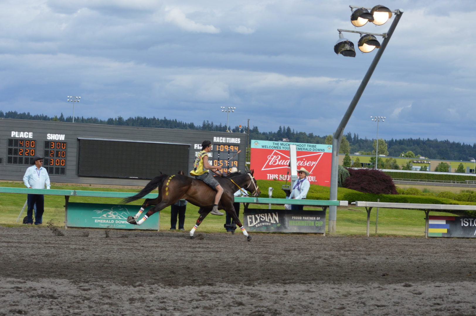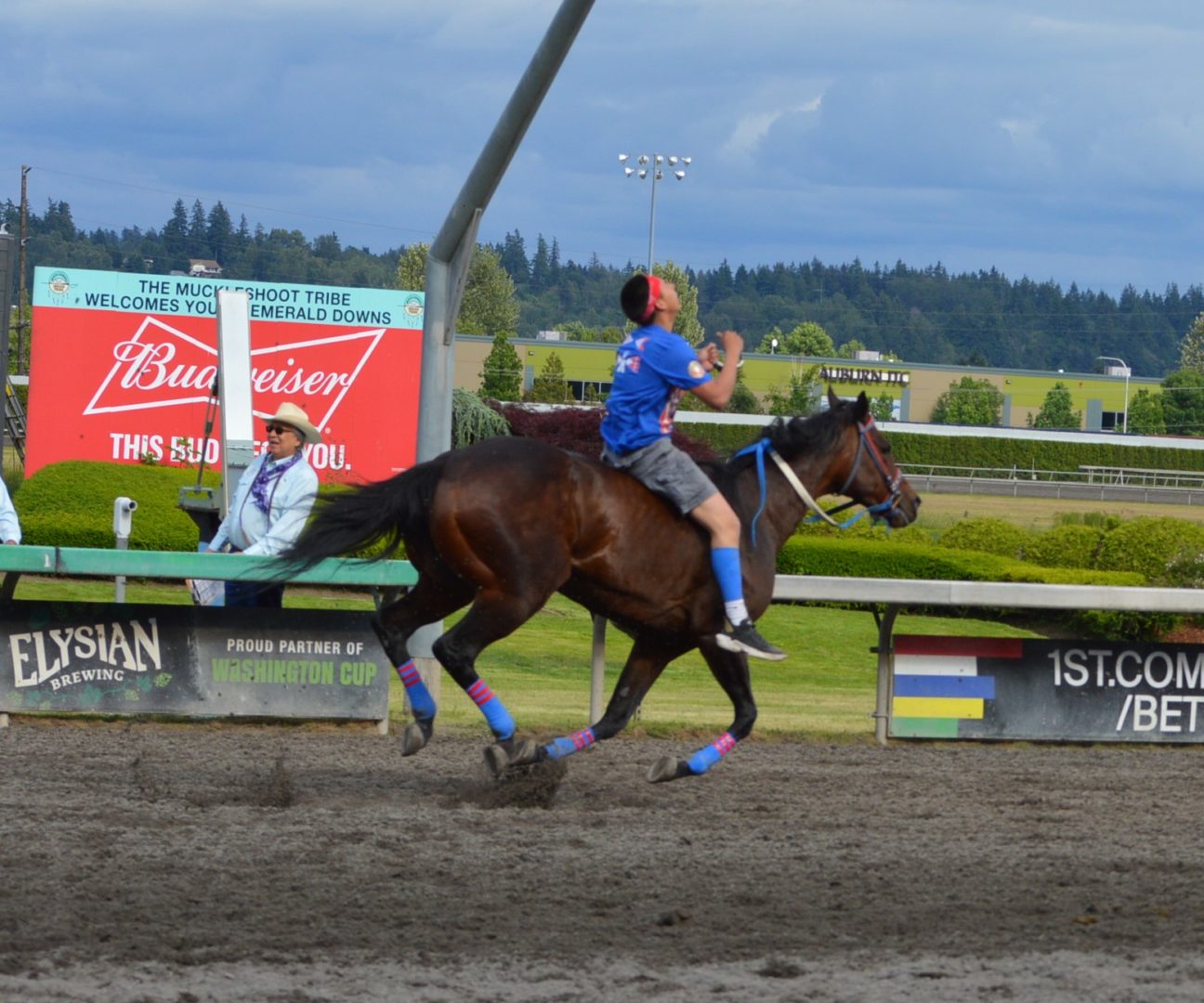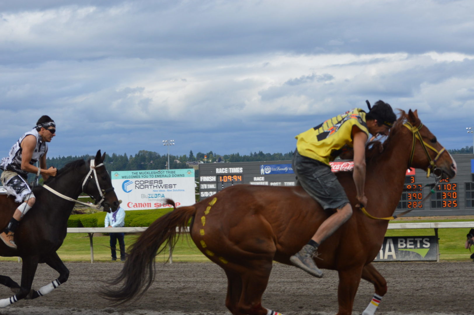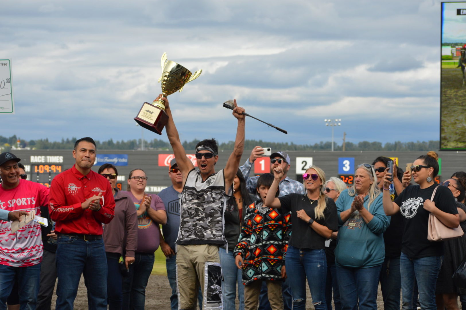 “It’s a great mix of celebrating our past with the competition of current day” said Muckleshoot Tribal Chairman Jaison Elkins as he and his family were on hand to take in Championship Sunday of the $65,000 Muckleshoot Gold Cup Indian Relays at Emerald Downs and it lived up to its billing with 2 outstanding consolation races and a spectacular Championship finale along with traditional dance and music of the Muckleshoot tribe.