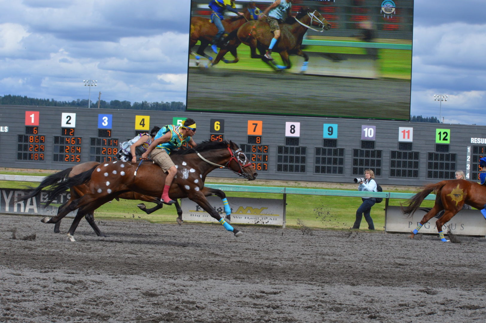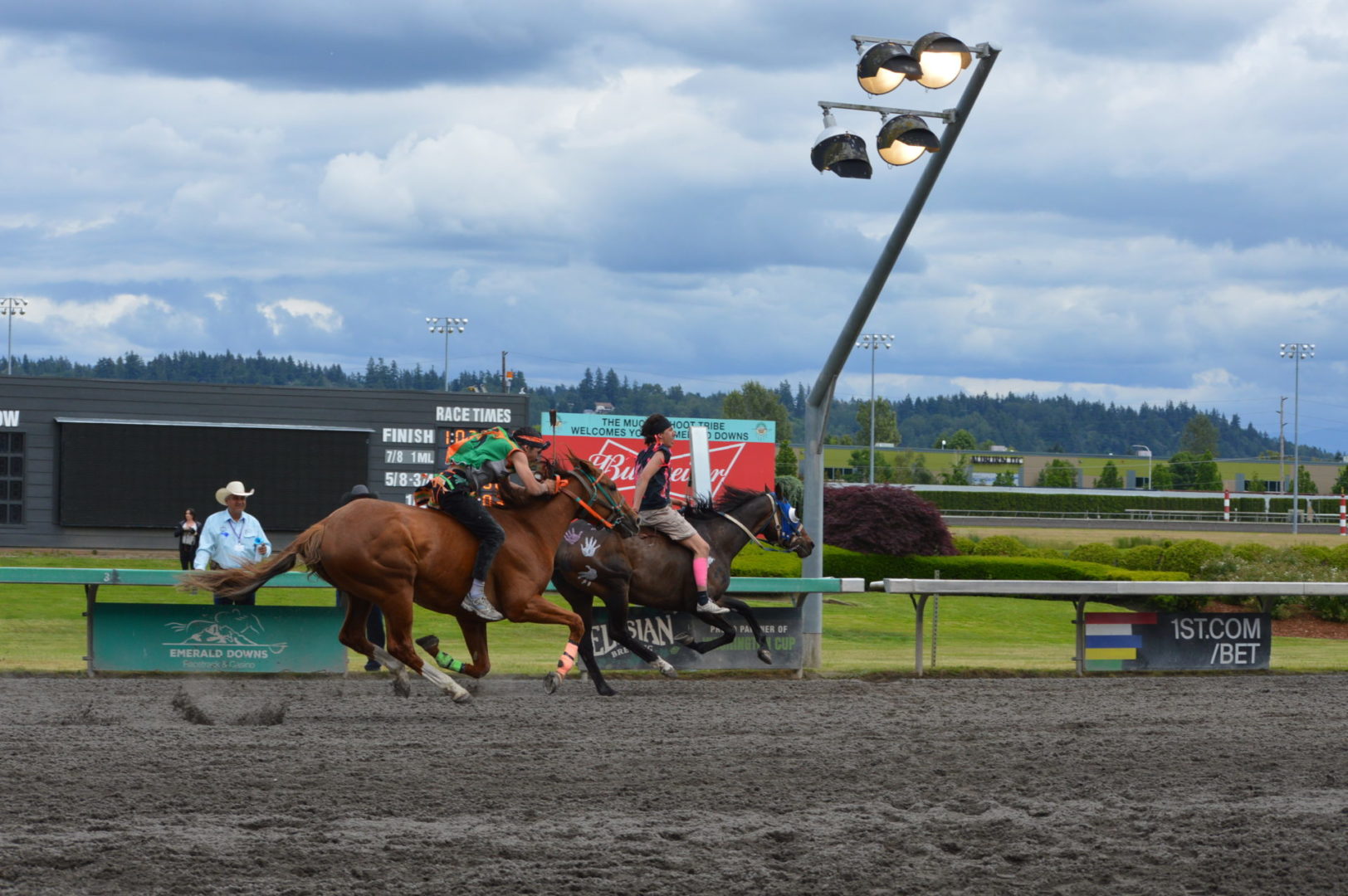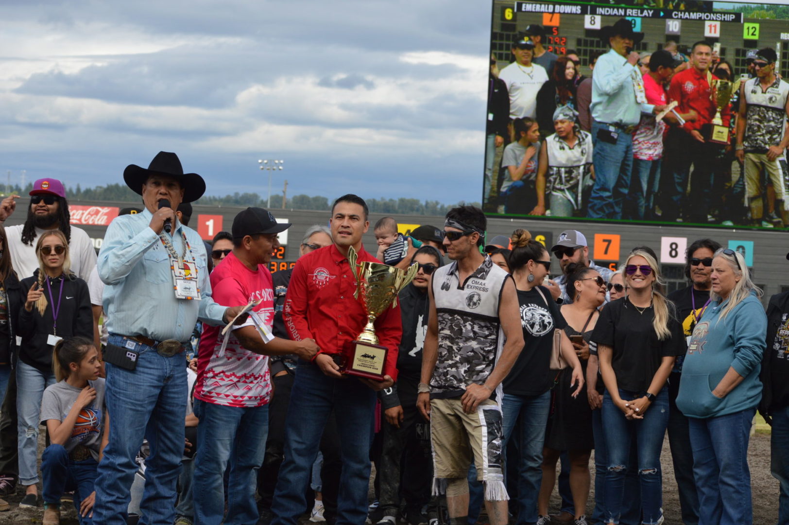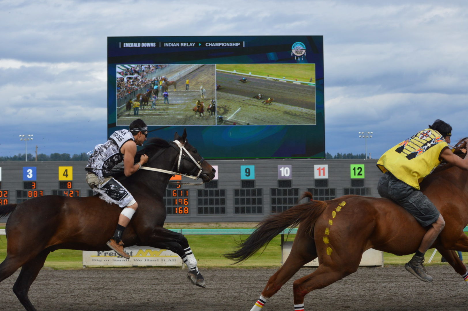 “It’s a great mix of celebrating our past with the competition of current day” said Muckleshoot Tribal Chairman Jaison Elkins as he and his family were on hand to take in Championship Sunday of the $65,000 Muckleshoot Gold Cup Indian Relays at Emerald Downs and it lived up to its billing with 2 outstanding consolation races and a spectacular Championship finale along with traditional dance and music of the Muckleshoot tribe.