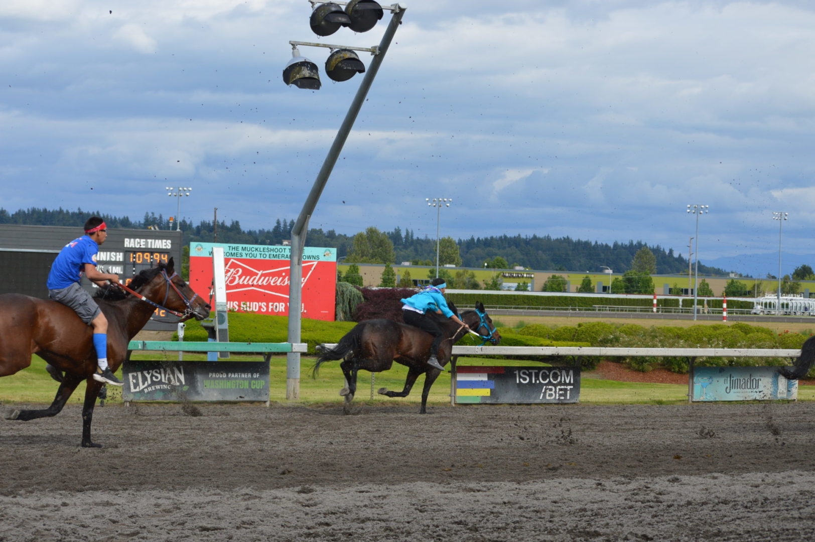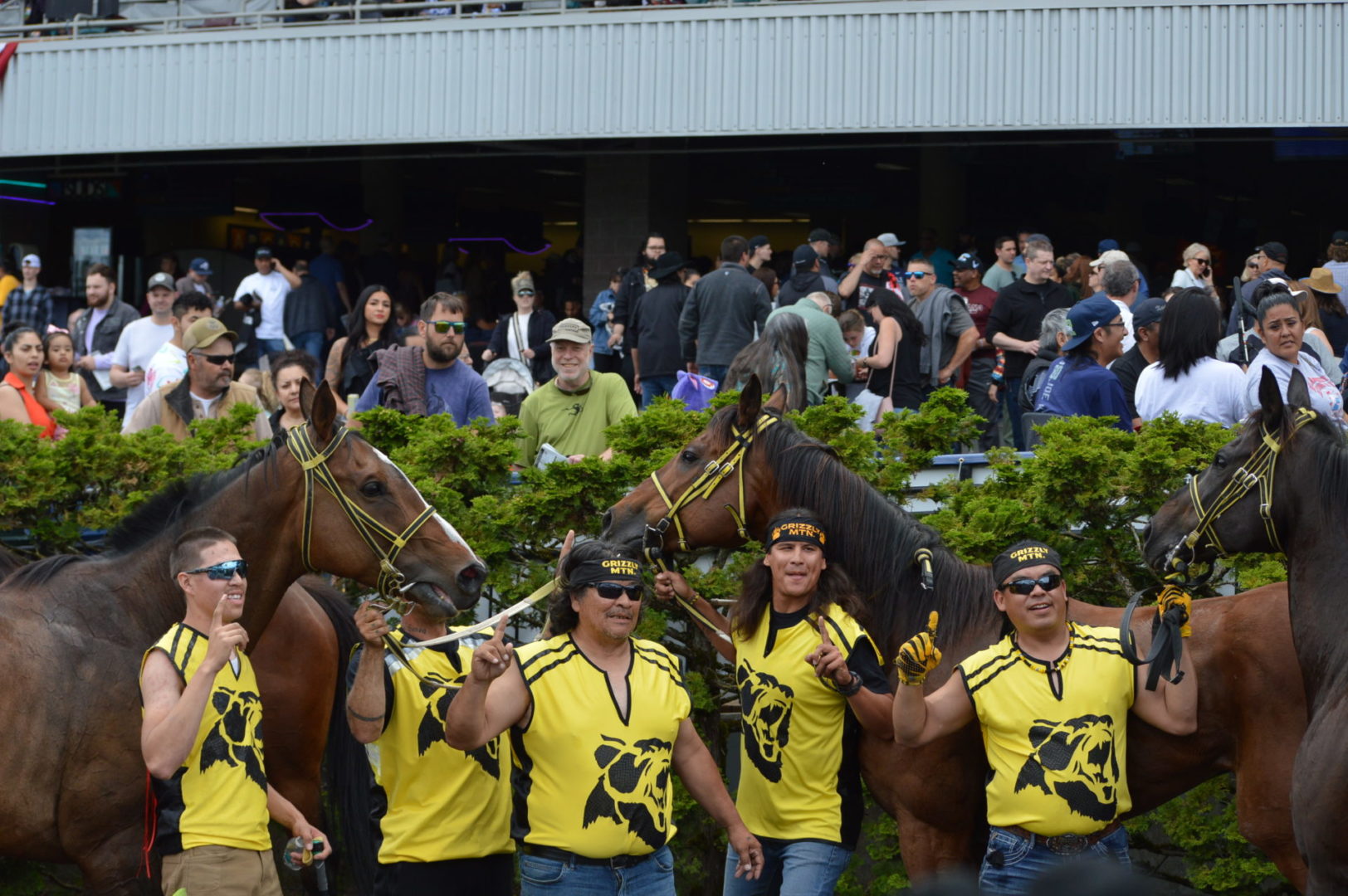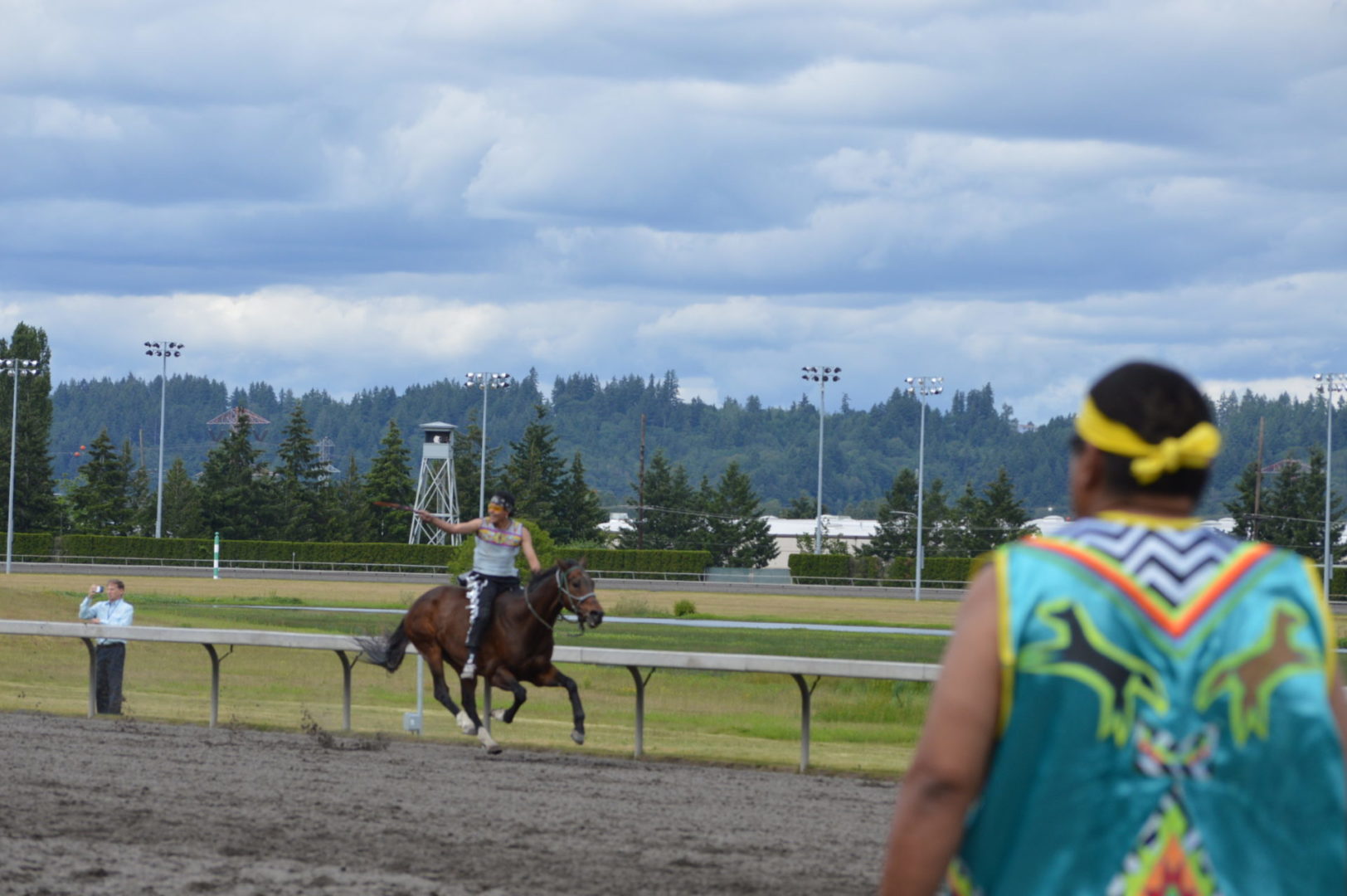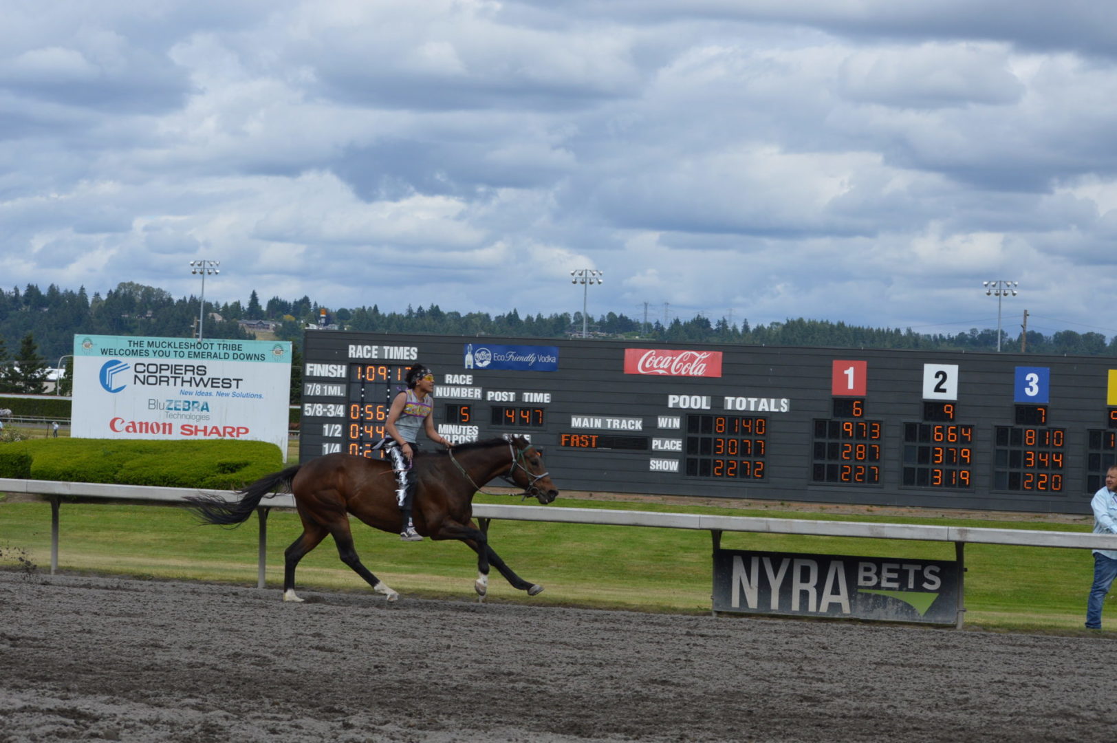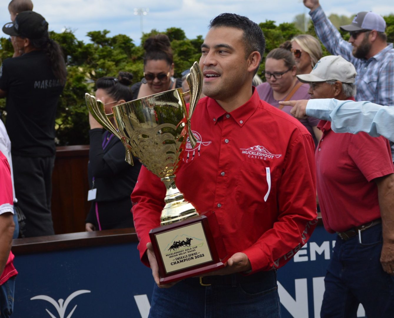 “It’s a great mix of celebrating our past with the competition of current day” said Muckleshoot Tribal Chairman Jaison Elkins as he and his family were on hand to take in Championship Sunday of the $65,000 Muckleshoot Gold Cup Indian Relays at Emerald Downs and it lived up to its billing with 2 outstanding consolation races and a spectacular Championship finale along with traditional dance and music of the Muckleshoot tribe.