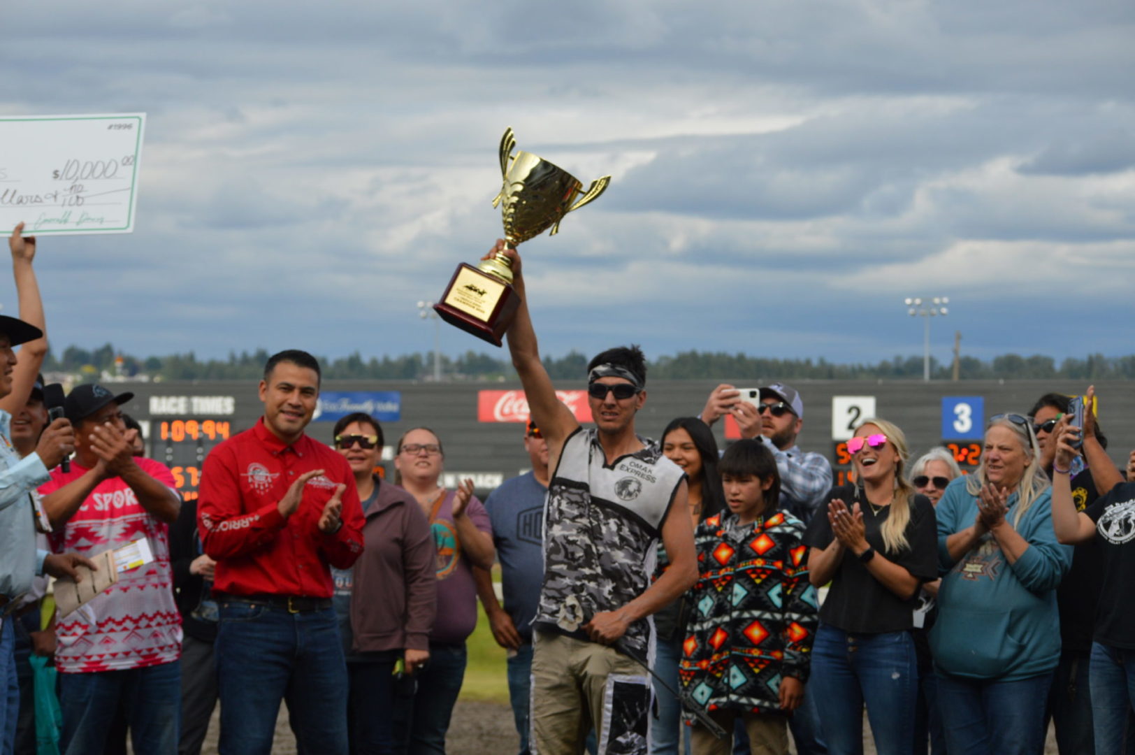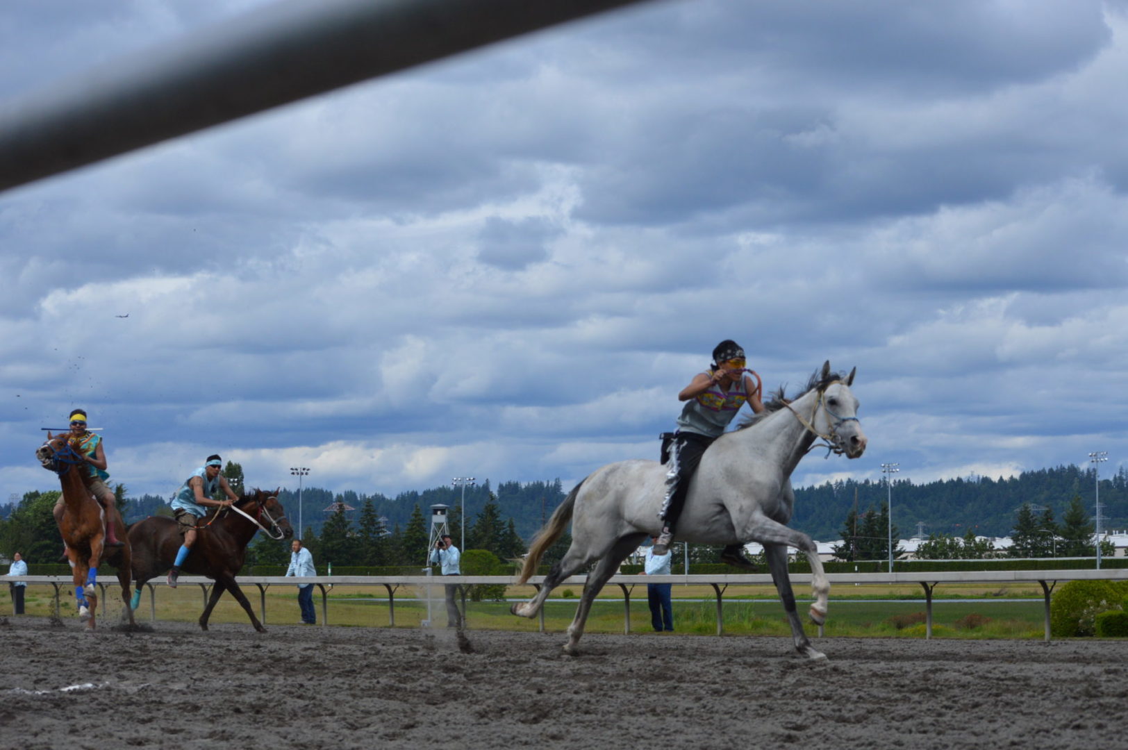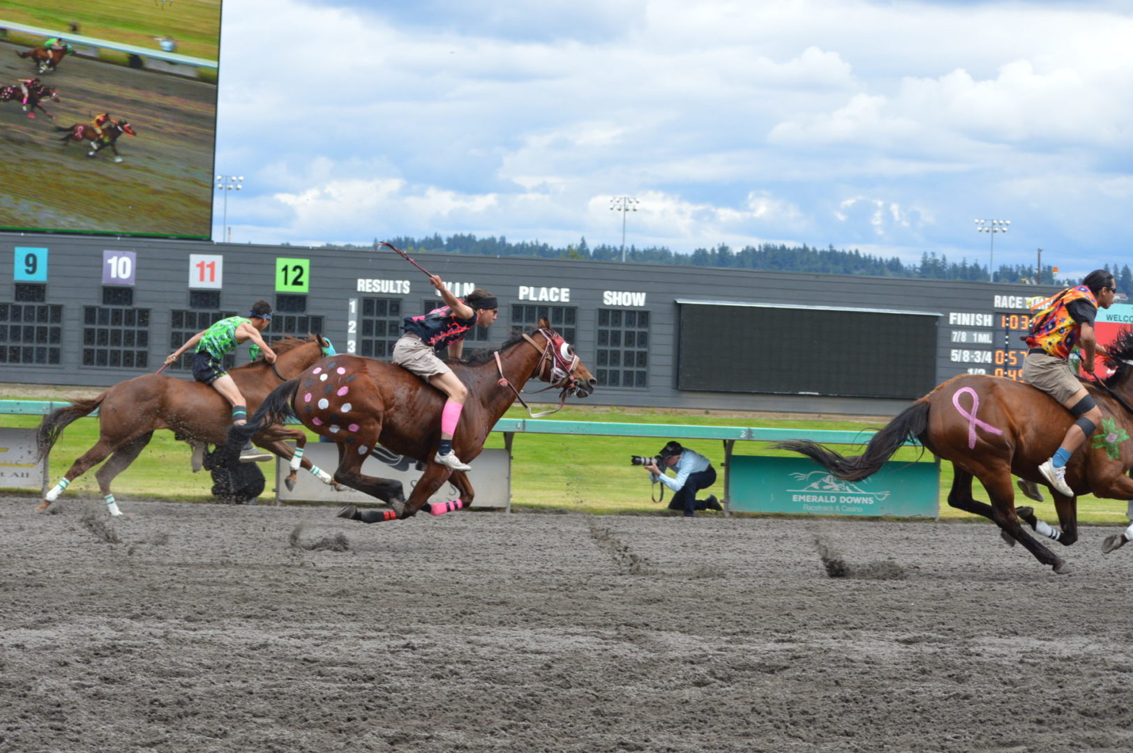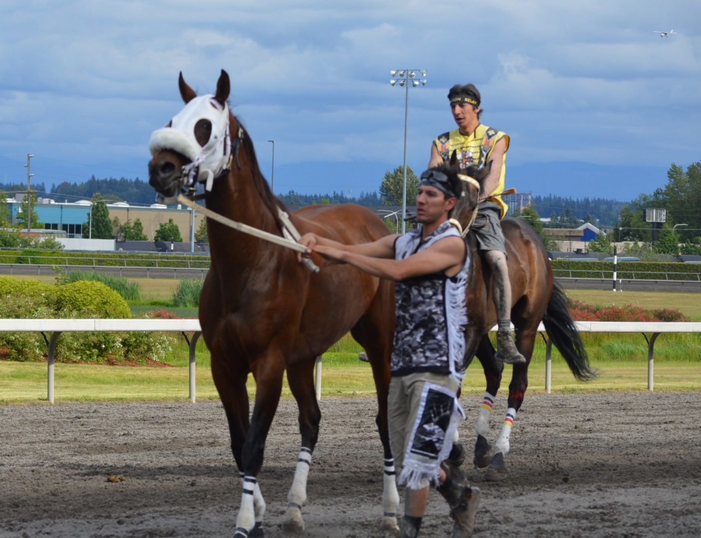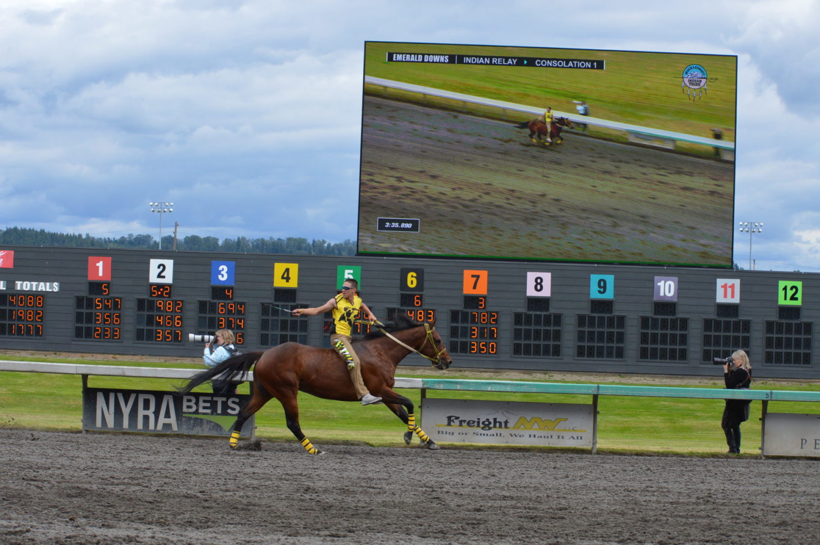 “It’s a great mix of celebrating our past with the competition of current day” said Muckleshoot Tribal Chairman Jaison Elkins as he and his family were on hand to take in Championship Sunday of the $65,000 Muckleshoot Gold Cup Indian Relays at Emerald Downs and it lived up to its billing with 2 outstanding consolation races and a spectacular Championship finale along with traditional dance and music of the Muckleshoot tribe.