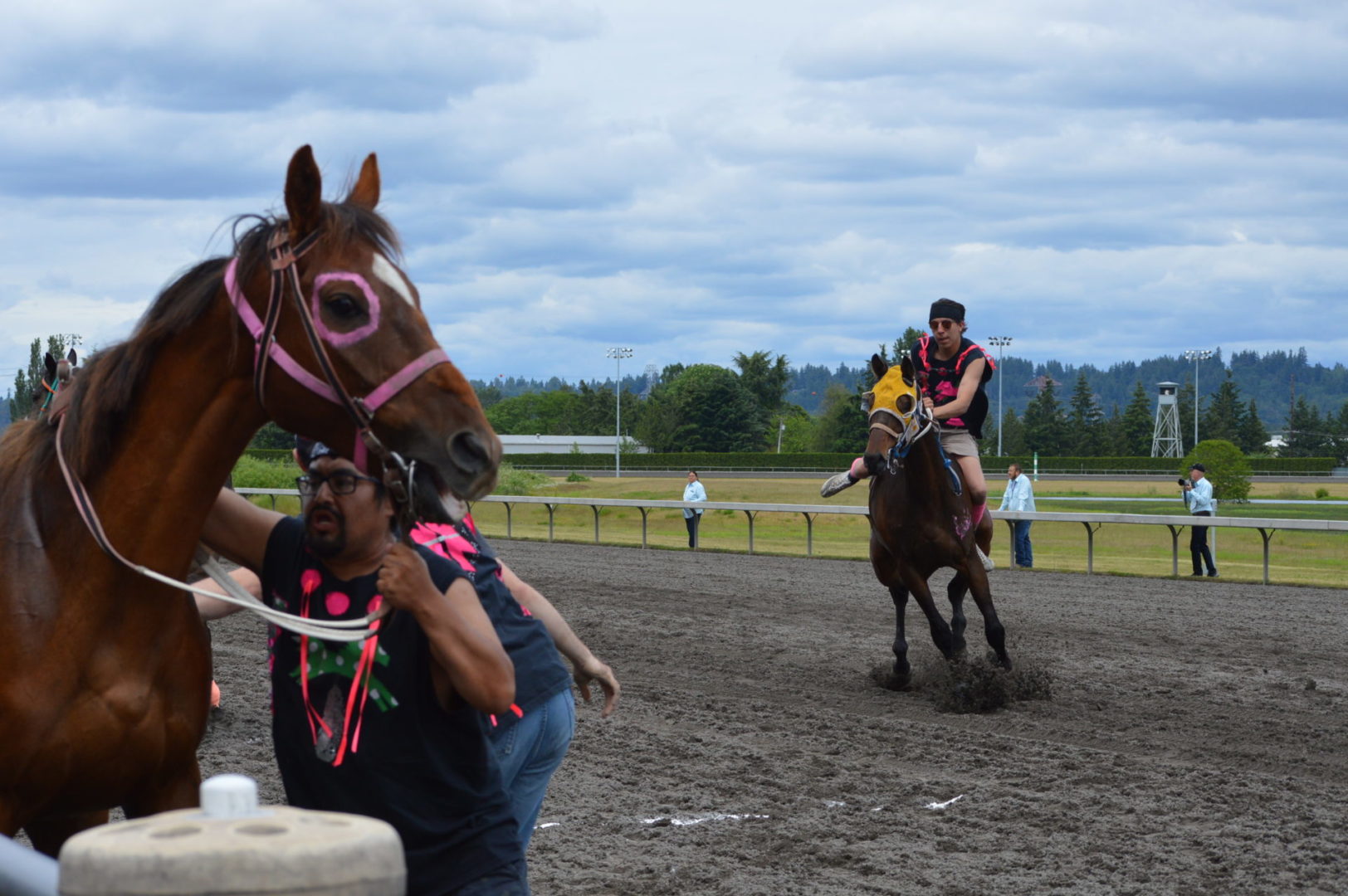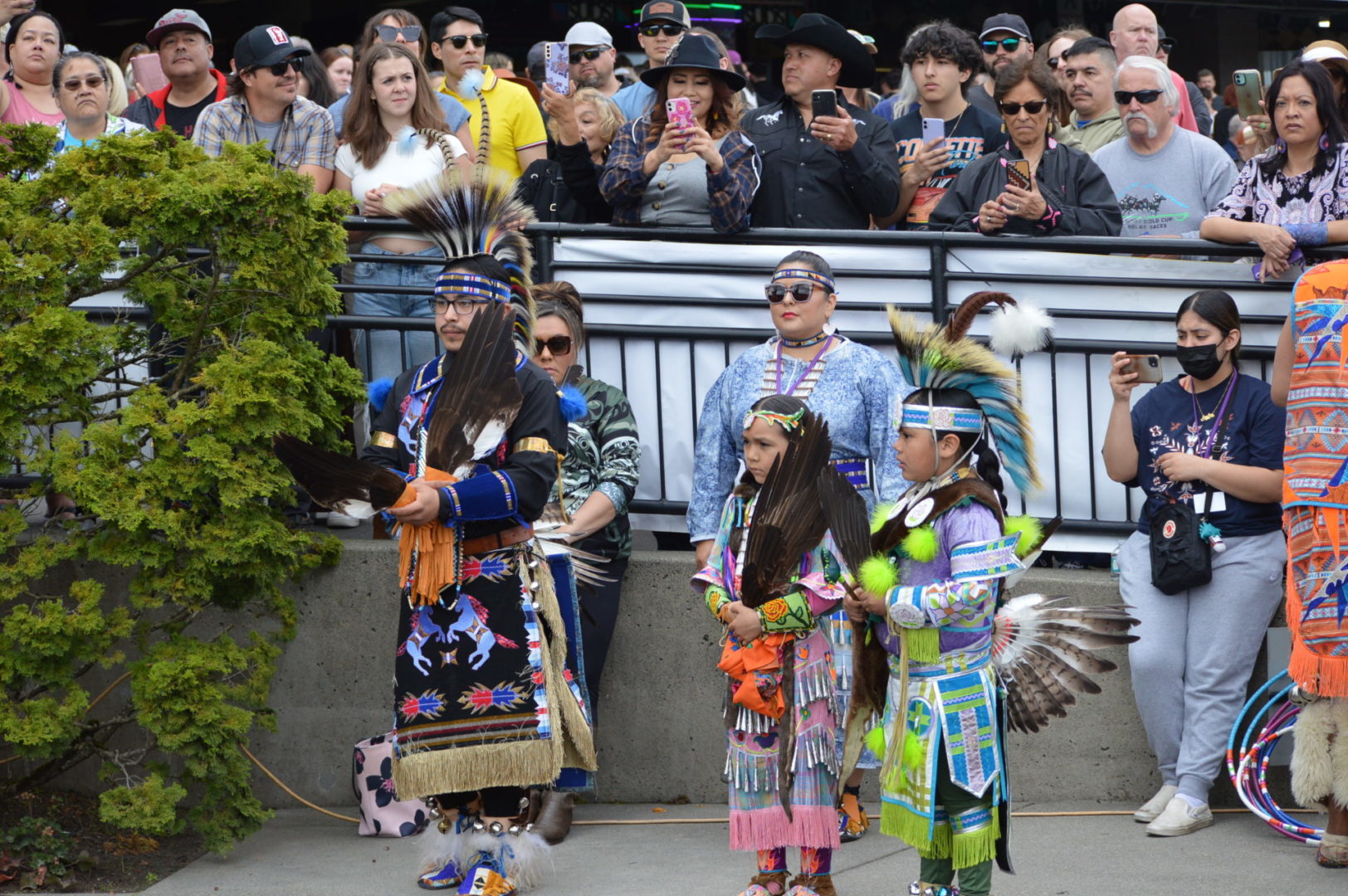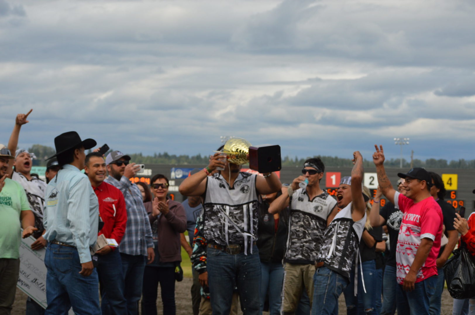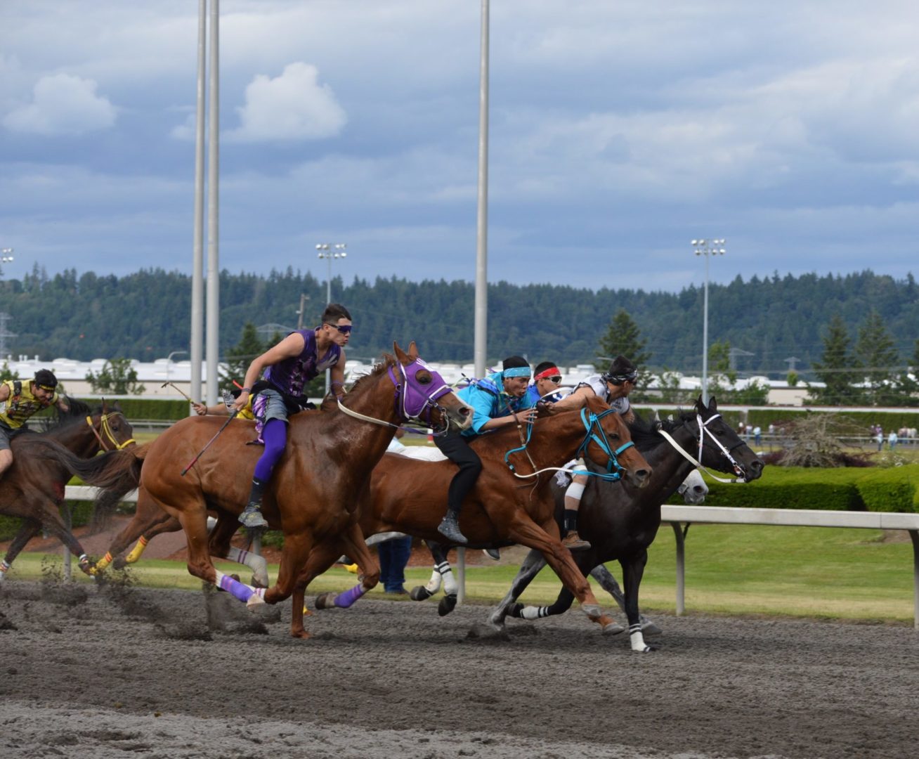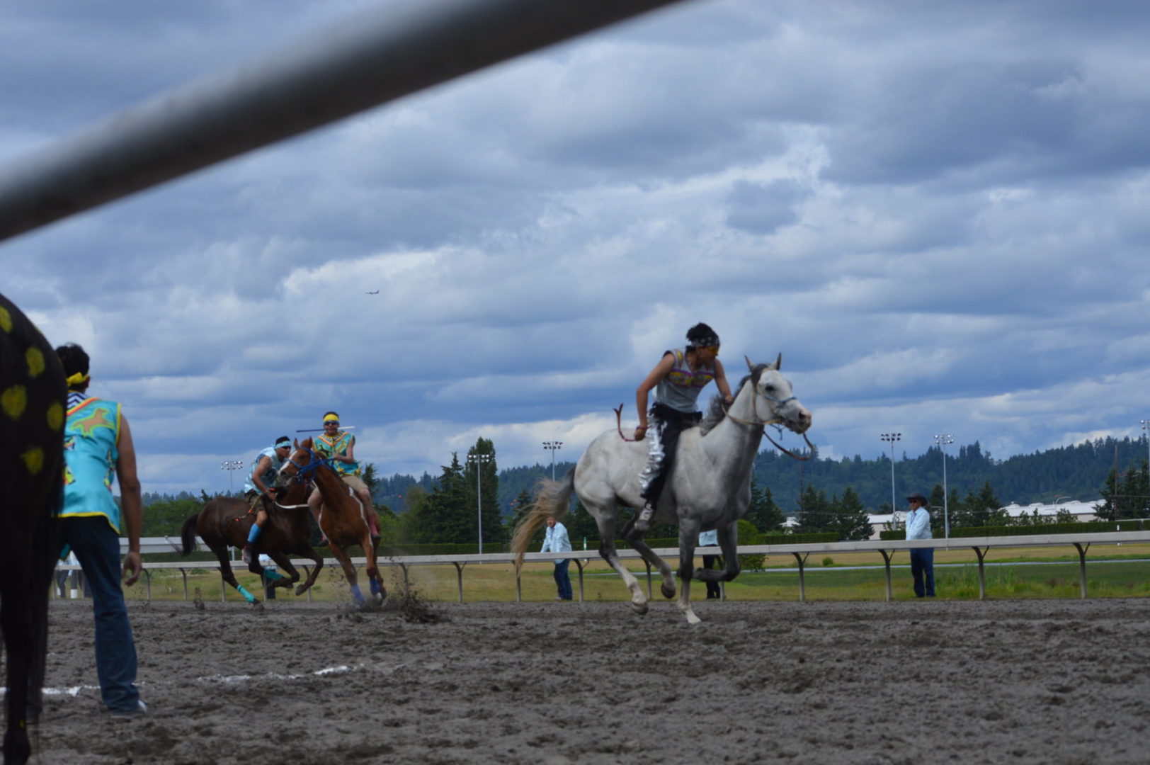 “It’s a great mix of celebrating our past with the competition of current day” said Muckleshoot Tribal Chairman Jaison Elkins as he and his family were on hand to take in Championship Sunday of the $65,000 Muckleshoot Gold Cup Indian Relays at Emerald Downs and it lived up to its billing with 2 outstanding consolation races and a spectacular Championship finale along with traditional dance and music of the Muckleshoot tribe.