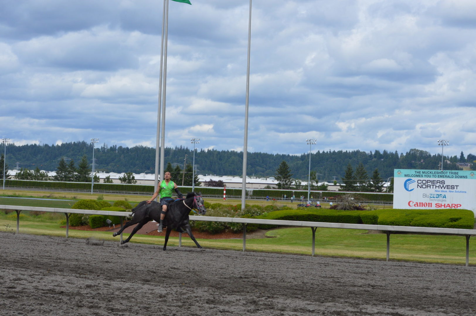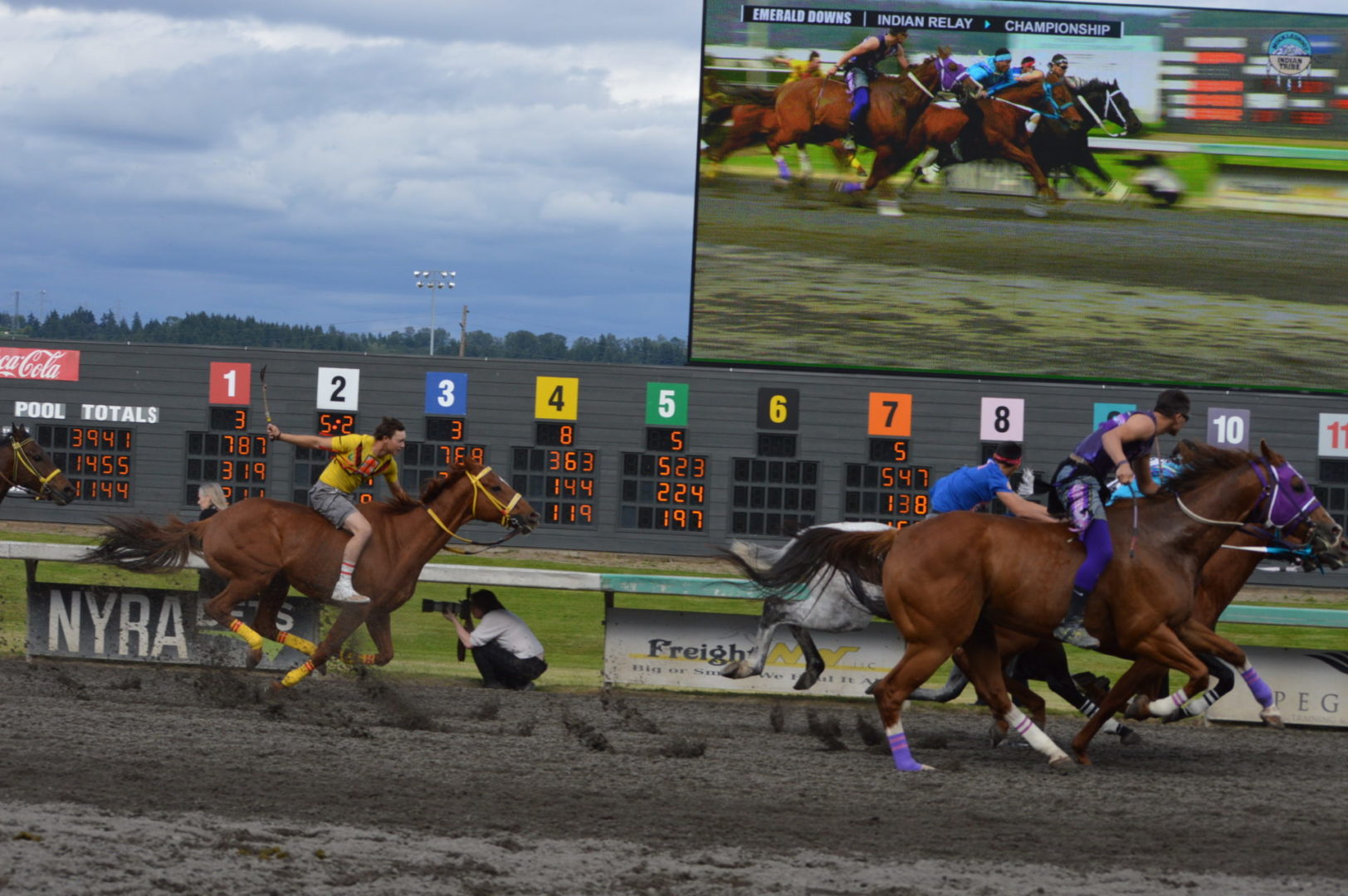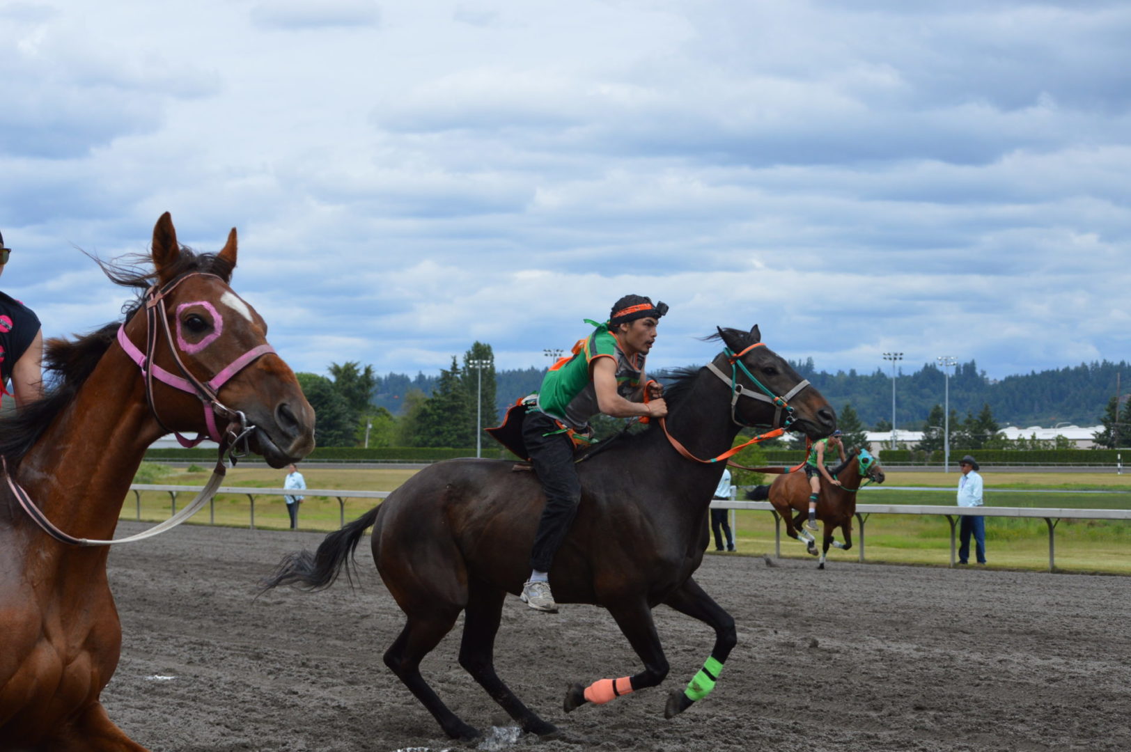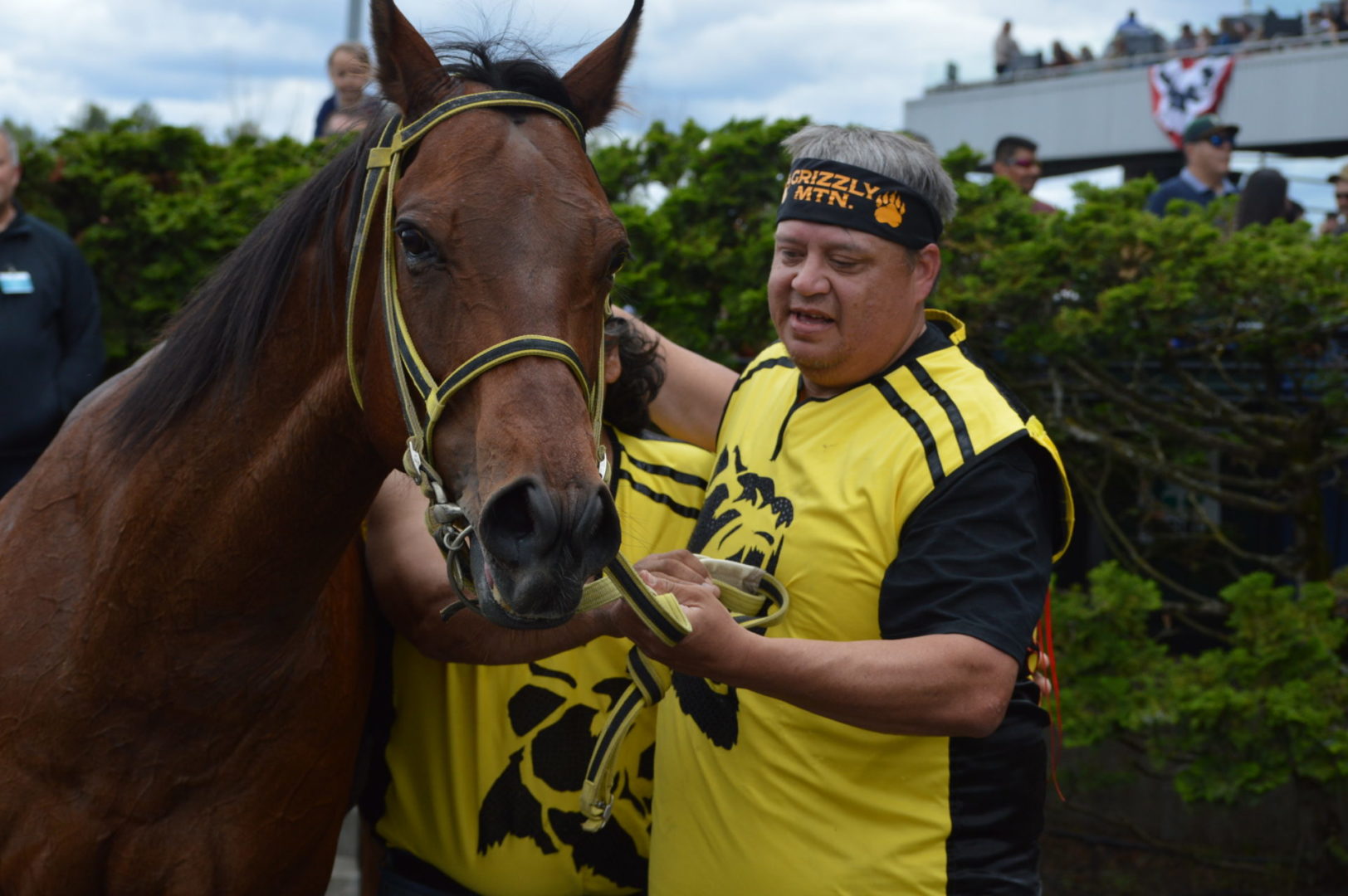 “It’s a great mix of celebrating our past with the competition of current day” said Muckleshoot Tribal Chairman Jaison Elkins as he and his family were on hand to take in Championship Sunday of the $65,000 Muckleshoot Gold Cup Indian Relays at Emerald Downs and it lived up to its billing with 2 outstanding consolation races and a spectacular Championship finale along with traditional dance and music of the Muckleshoot tribe.