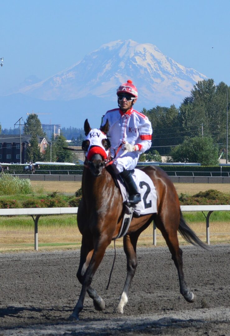 1st race went to front running Hunters Ghost with Clayan Millwood getting his 1st win at Emerald Downs. Millwood controlled the pace of the 1-mile distance from start to finish and held off a closing pair of Perfect One with Kevin Orozco and Warriors Hero with Kevin Radke who finished 2nd and 3rd. Irish Knight with Alex Anaya was 4th. Sergio Perez owns and trains Hunters Ghost and this was his 2nd win of the meet. Backers of the Ghost were rewarded with an 8-1 pay-off of $19.80.