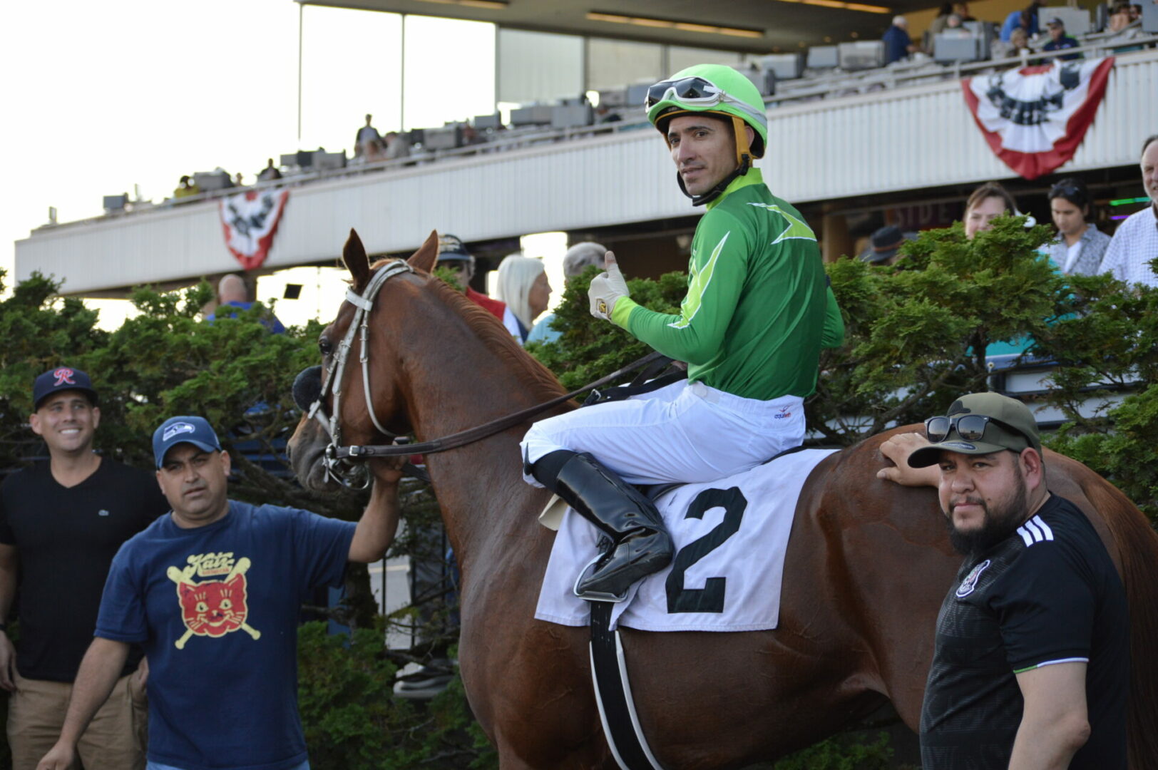 In the 1st four races there were 2 double winners. Jake Samuels won on Bennyandthechicks in the 1st and Wegotbeeronice for owner/trainer Jennifer Nunnally. Eddie Martinez won the 2nd on favorite Slice of Pie and then took the 3rd also on the even money choice Cause I’m Cool.