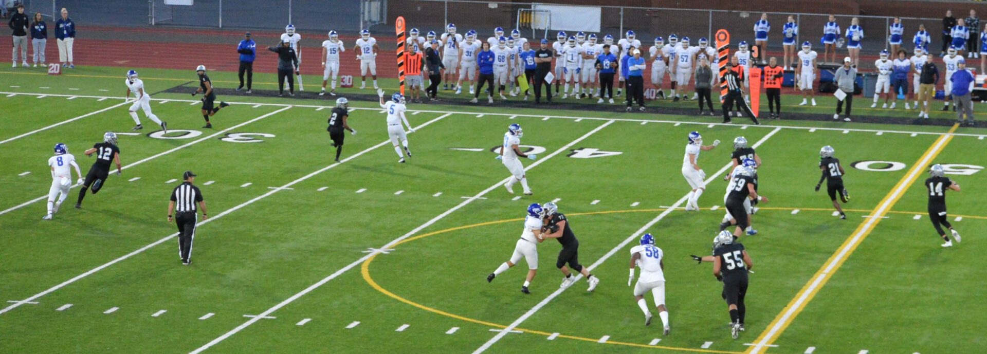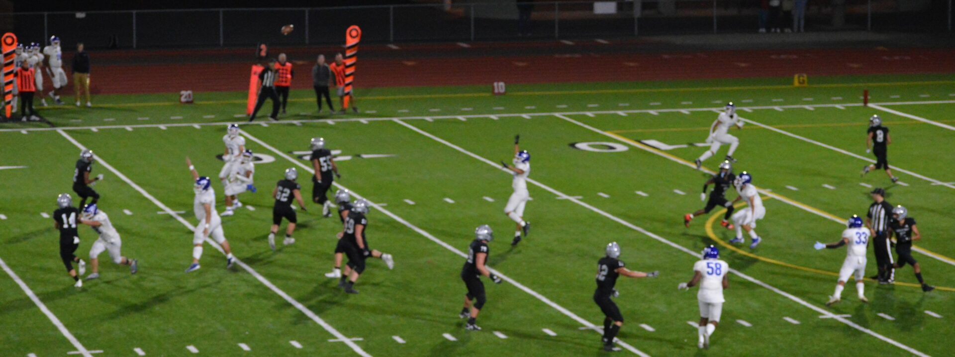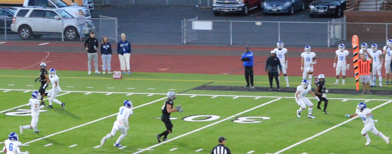 In the 2nd half the Jags came out but had to punt the ball away and Curtis would have their chance to get their offense rolling starting from their own 18. They would pick up a couple of 1st dons and moved near midfield but faced a 4th and short. Down just 7 they sent out the punt team. Koch being the punter there is always a chance for a fake and the Vikings decided this was the time to do it and Koch looked to dump off the pass in the flat to Lynden Tanoa but the Jaguars Jacob Lane had other ideas and he read the play perfectly jumped the pass and took off for his own Pick 6 for 42 yards. Emerald Ridge went up 21-7 and the momentum shifted.