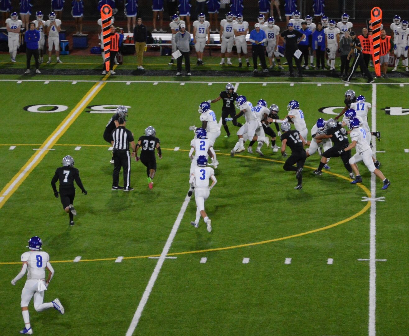 It would be another 3 and out for the Vikings but this time the punt went off the side of the foot and Emerald Ridge got the ball on the Vikings 38. Two plays later and the Jags QB Jake Schakel found Giovanni Kafentzis for an 8-yard TD, Peterson hit the PAT and it was 7-0.
