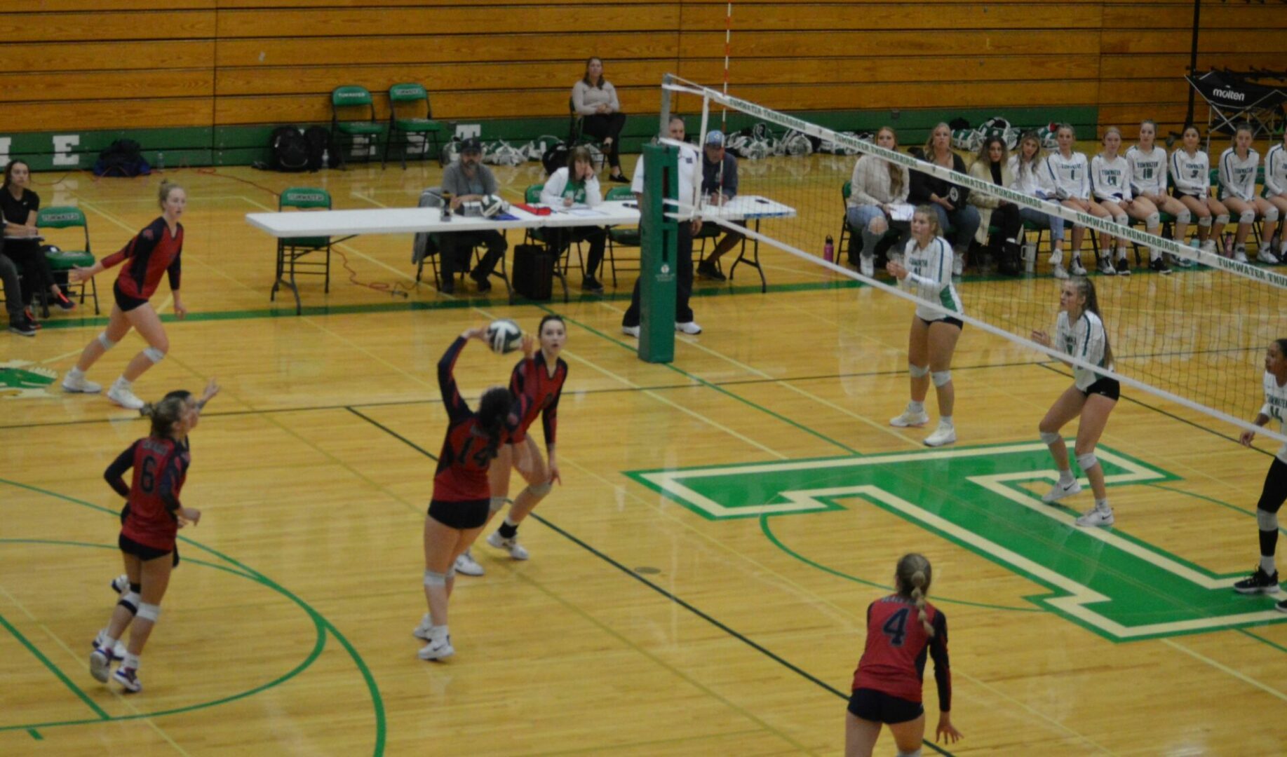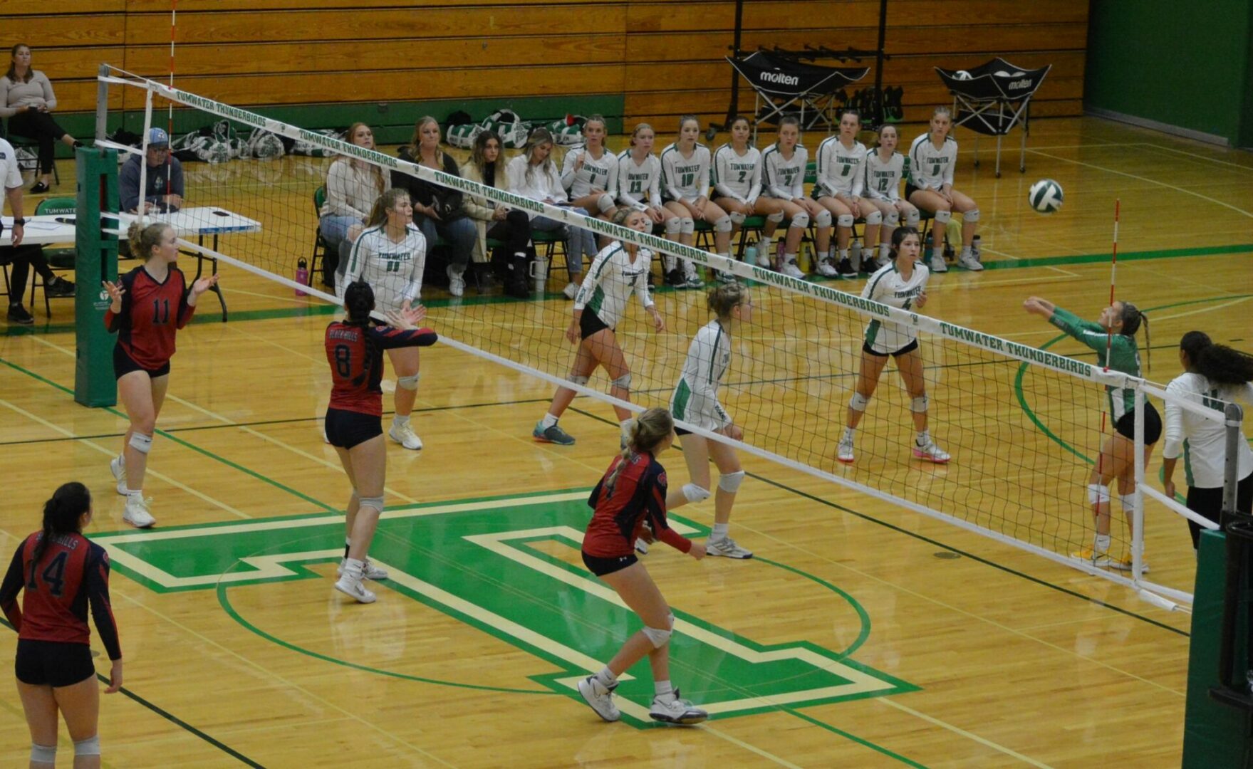 In set 1 the 2 teams battled to an 8-8 tie. That’s when the T-Birds began to pull away with Tumwater’s Bella Burney at the service line she scored 3 including an ace to push the lead to 11-8. After a 1 serve for the Wolves the T-Birds Brooklyn Hayes fired off 3 points and Tumwater surged to a 15-9 lead and never looked back finishing it off 25-15 to take a 1-0 lead.