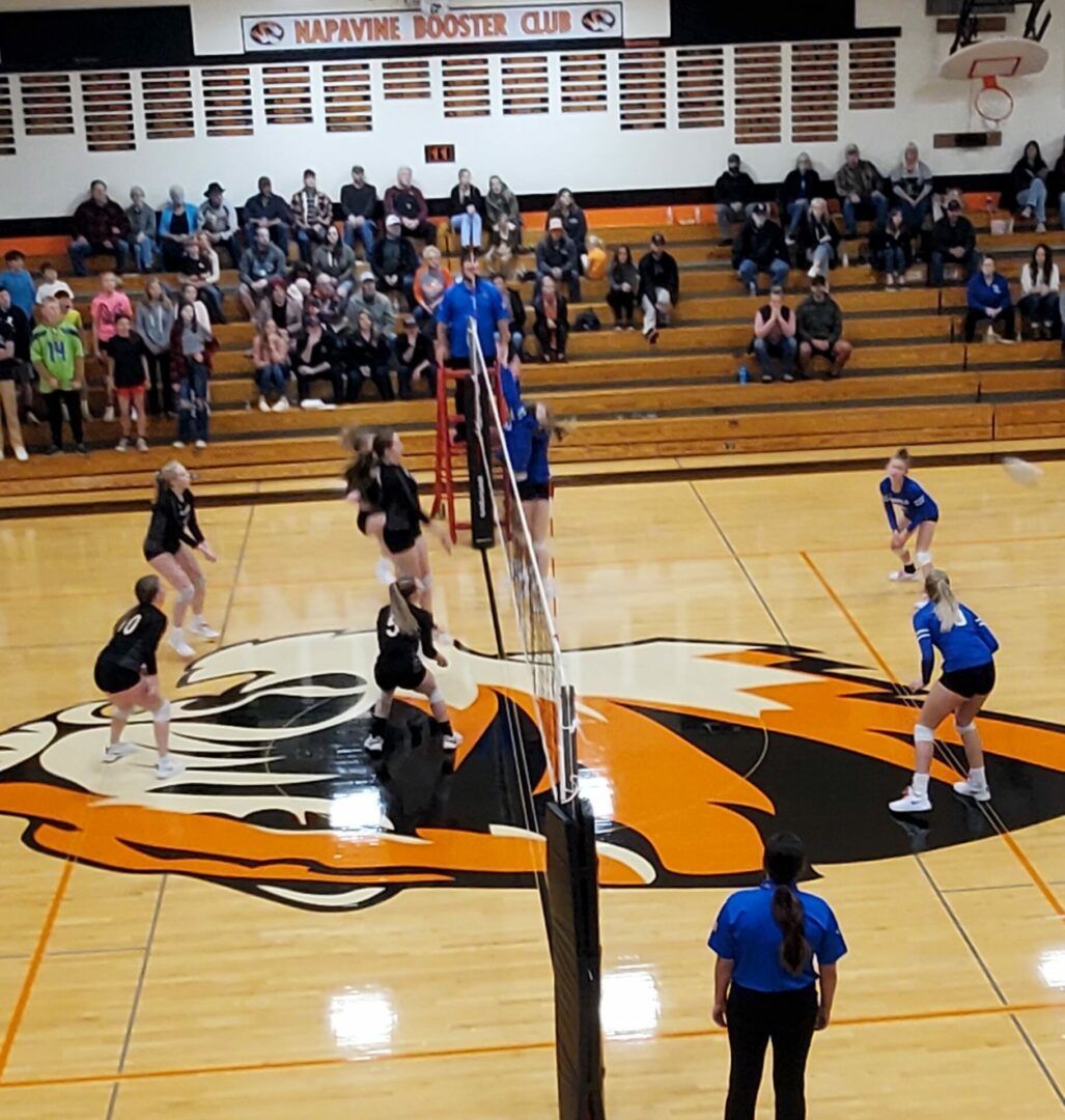 Toutle Lake came out and took the first two sets by identical 25-20 scores. Both sets were determined by big service runs. In set 1 with trailing 16-15 Toutle Lake’s Kendal Dean ran off 8 points with an ace to push their lead to 23-17. Ileigh Lynn and Layni Brandhorst had big kill shots and blocks during that critical run. In the 2nd set the turning point was at the 18-15 mark with Napavine leading but the Ducks Grace Hadaller at the service line. She won the 1st point during the rally of the match which kickstarted a 6 point surge giving T-L a 22-19 lead which they maintained for the second straight 25-20 win and went up 2-0.
