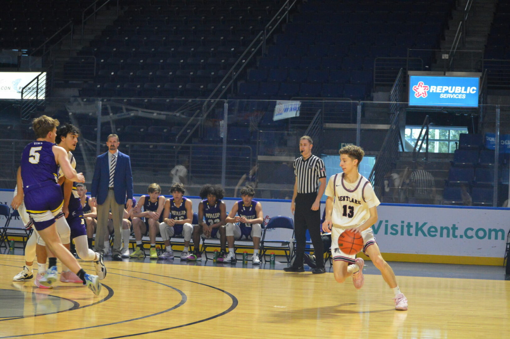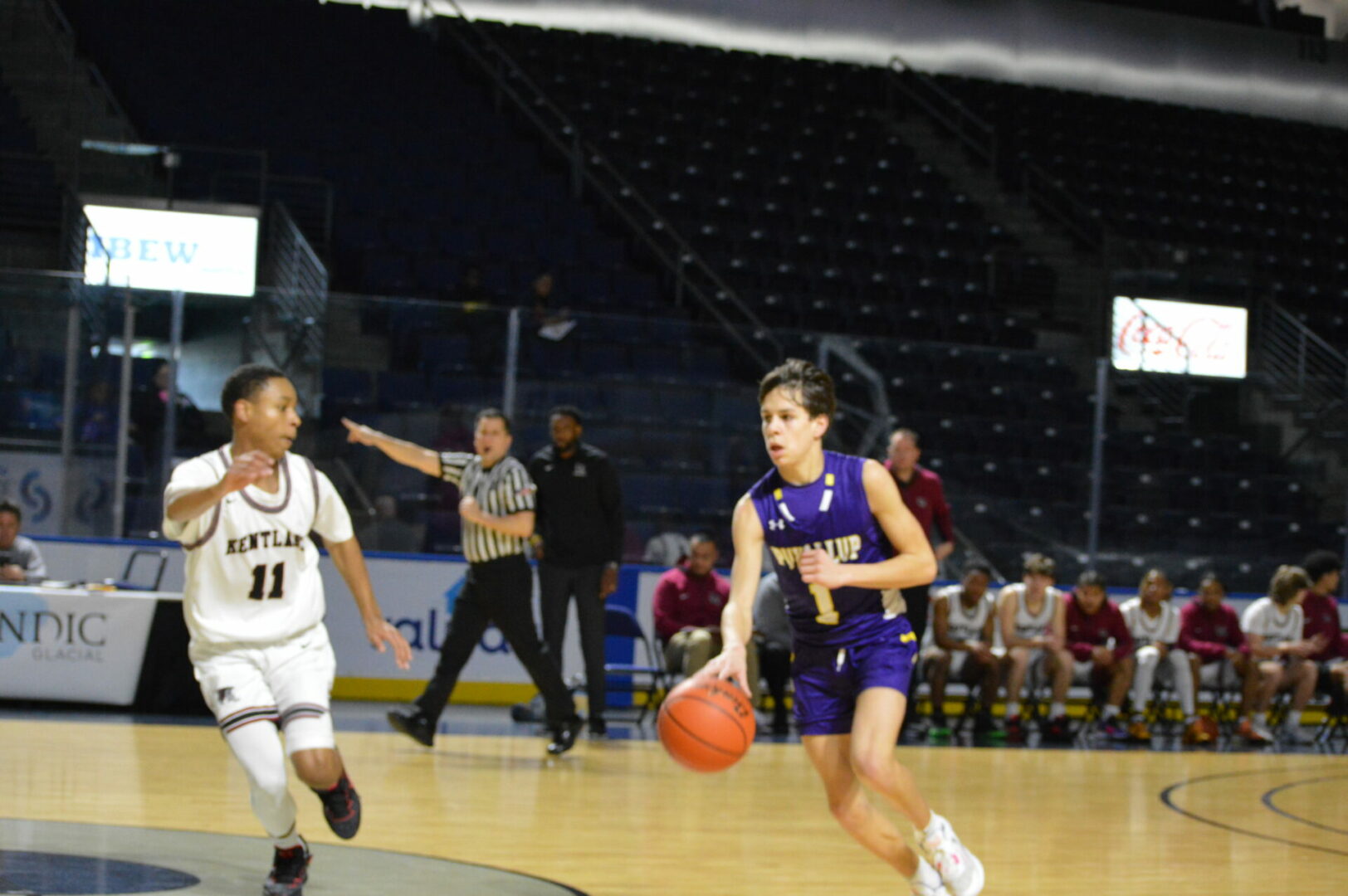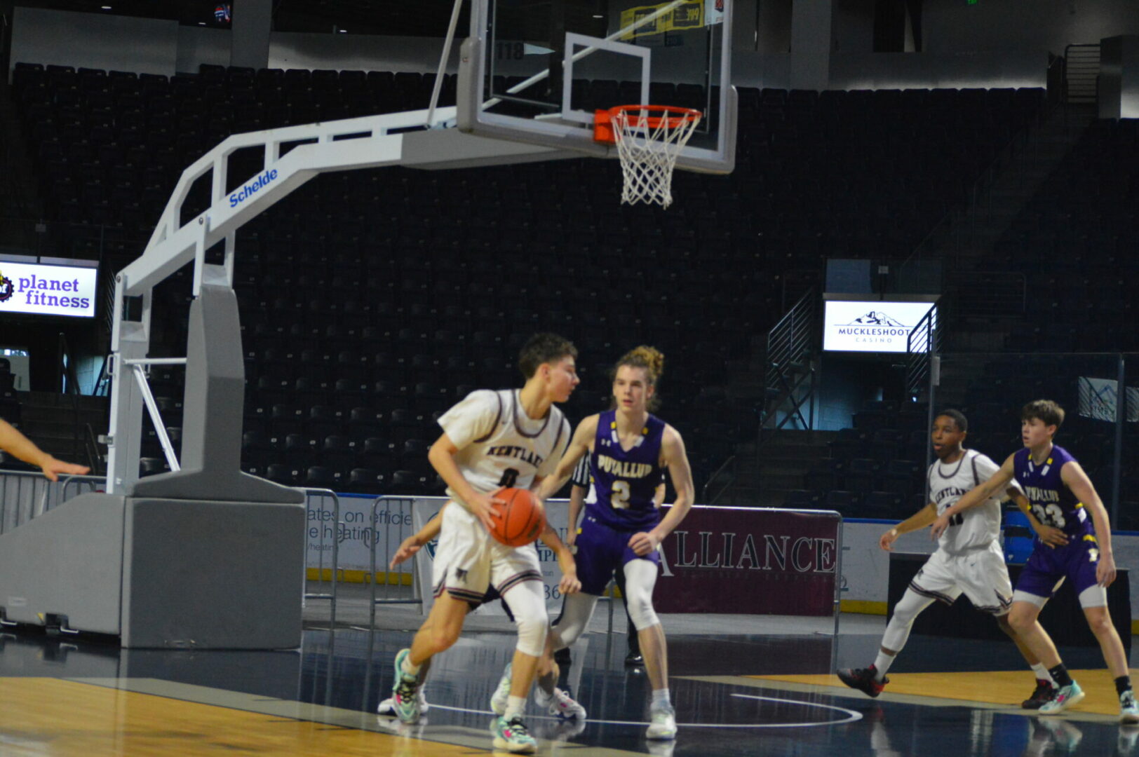 The Puyallup Vikings and Kentlake Falcons kicked off the day long MLK Showcase in the Showare Center on Monday and it was the Vikings that used a big 2nd quarter to propel them to the first win of the day.