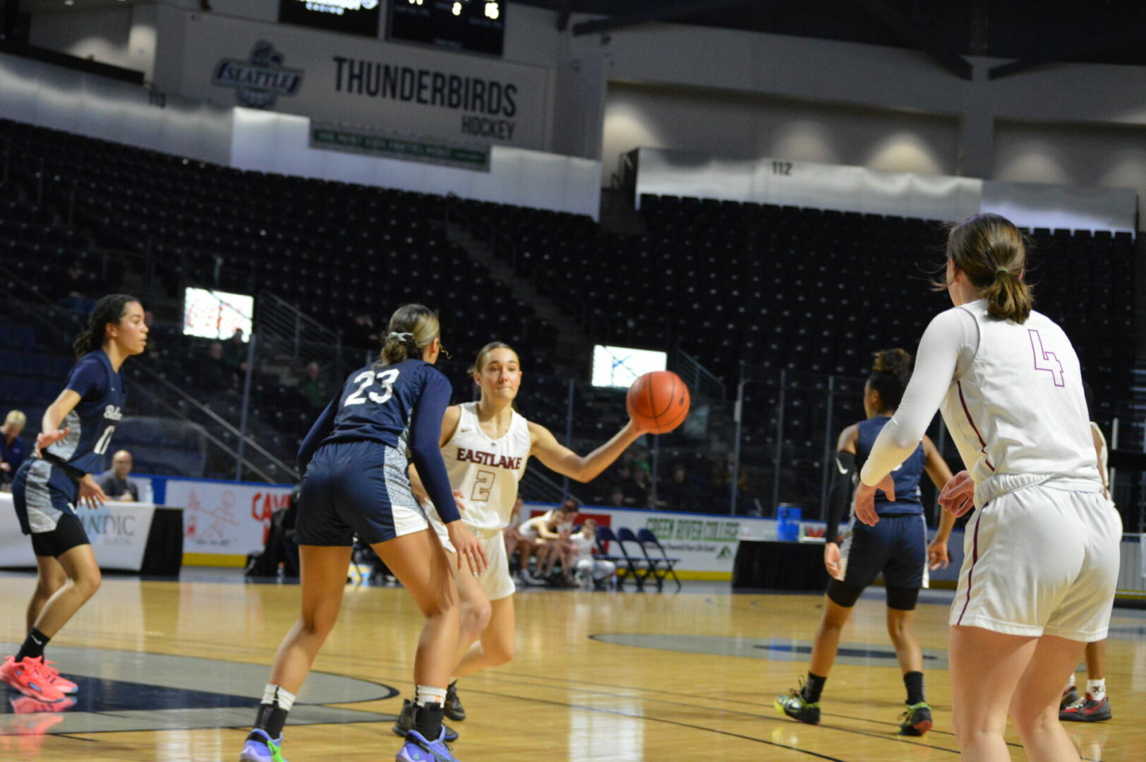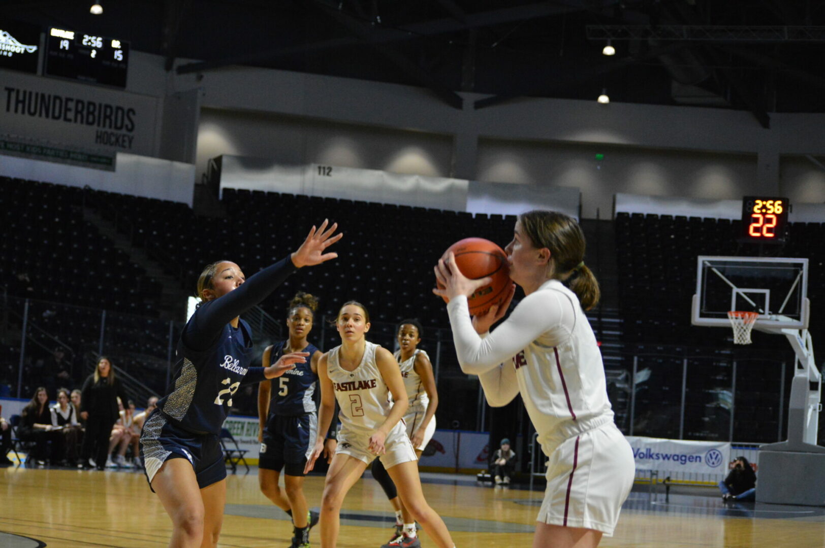 In the 1st of three girls contests on the day the Bellarmine Prep Lions came storming back from a 7 point 3rd quarter deficit to the 4 point win by outscoring the Wolves 20-9 in the 4th. The Lion were put in the hole after leading 23-21 at the half and Eastlake scoring 15 points and shutting down the lions holding them to just 6.