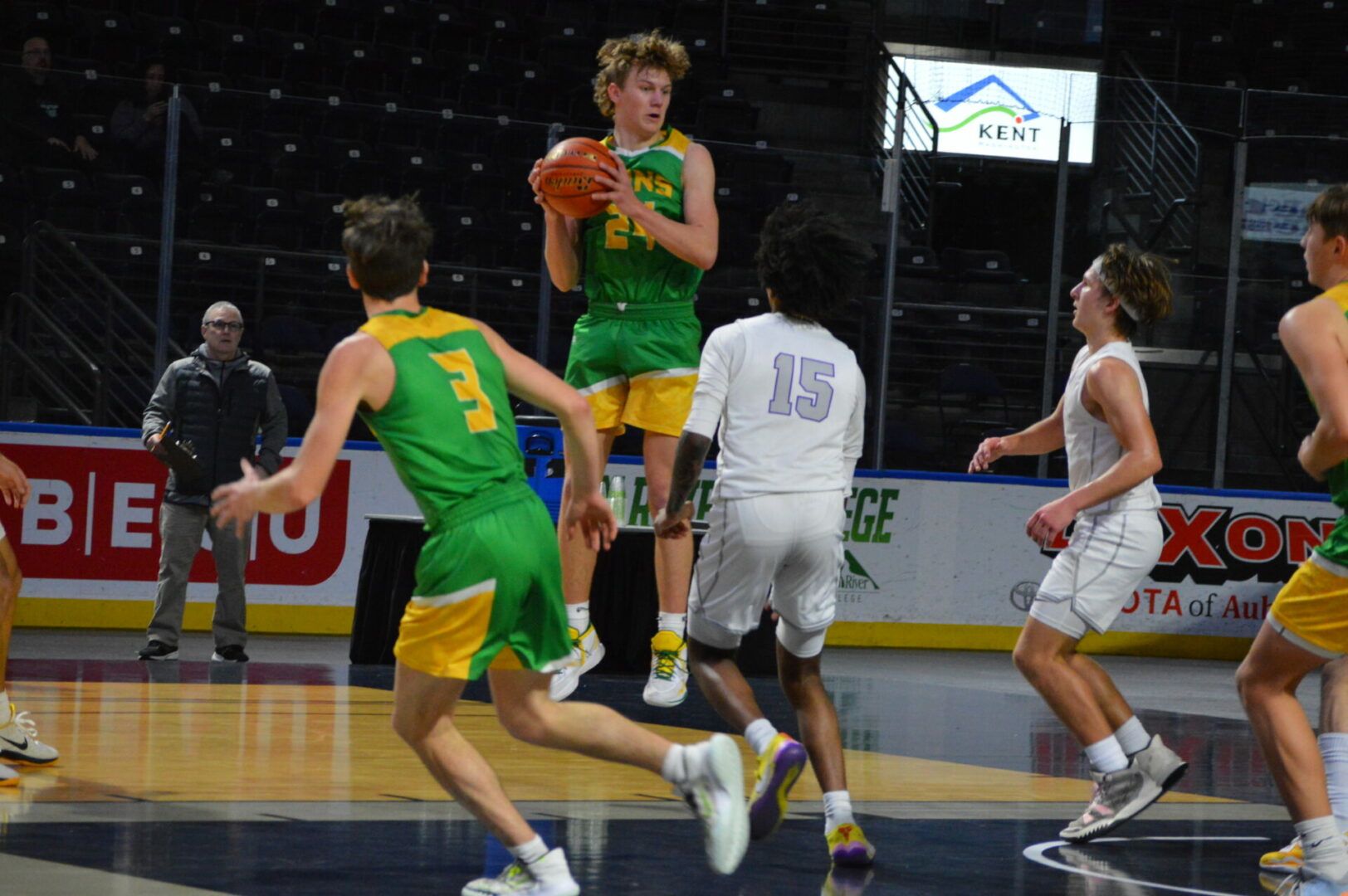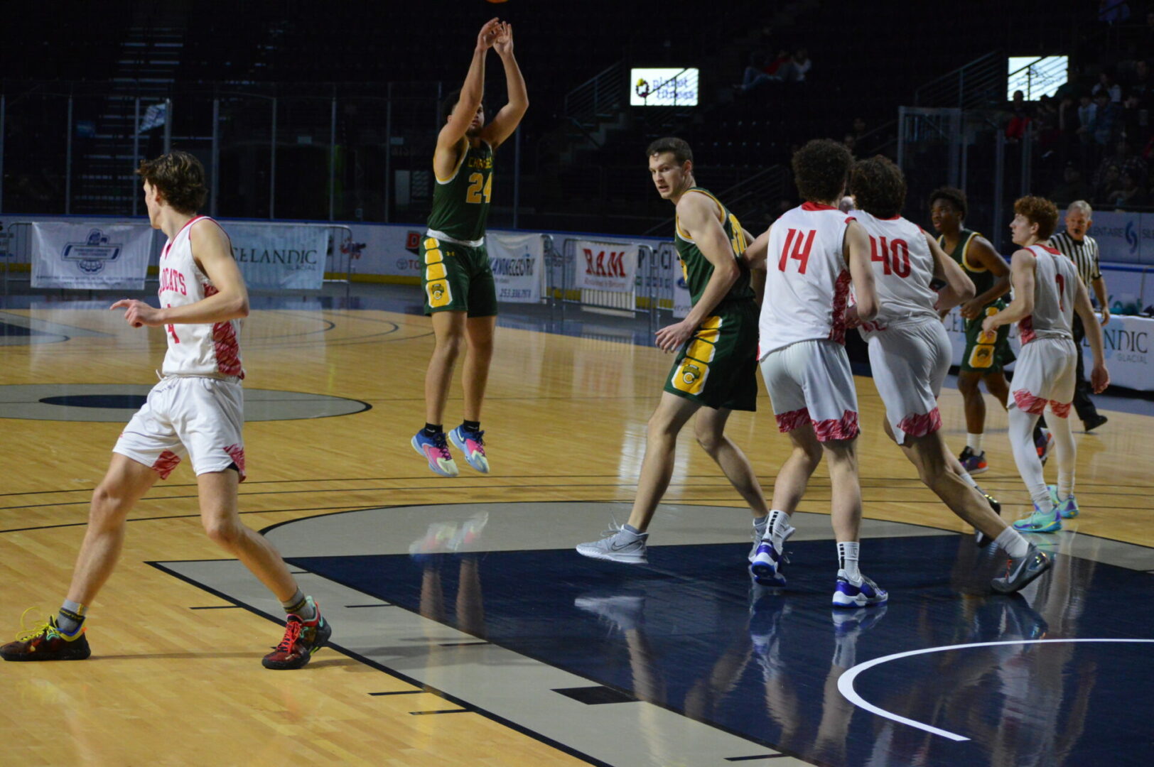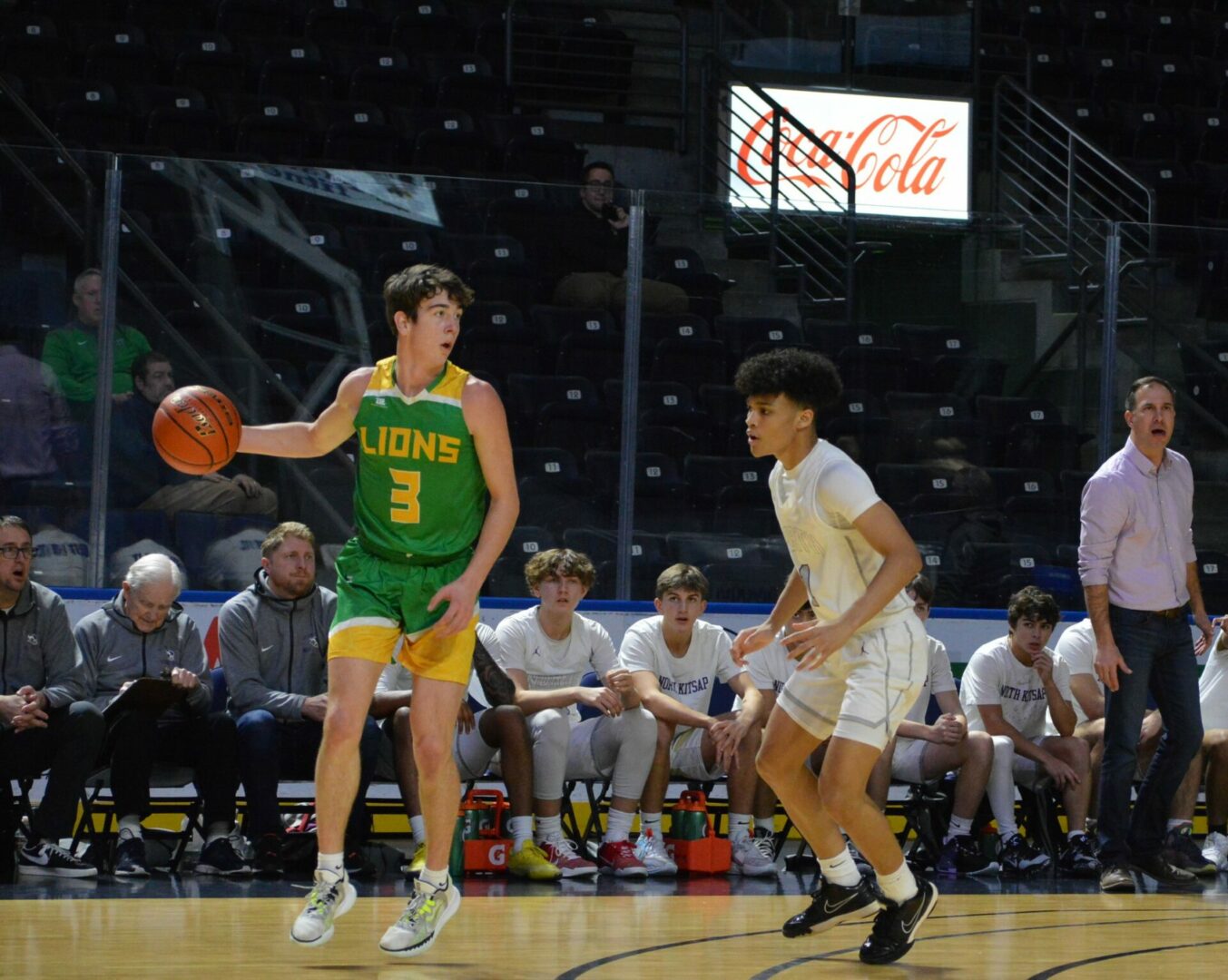 Neither team allowed the other to get too far away as they were tied after 1 at 11-11 and then the Lions led 29-28 at the break. Coston Parcher led the Lions with 12 1st half points while Brant Happner knocked in 8 of dozen for the game. North Kitsap hung right with the defending champions behind Harry Davies’ 14 points and the 9 from Cade Orness.